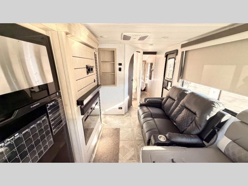 Enjoy your surroundings with 64 square feet of windows! So, no matter where you park, you can easily bring the outdoors right inside. The rear kitchen features 18 linear feet of wrap-around counter space including a double sink and three burner cook-top with an overhead microwave oven. There are bar stools for dining inside along the rear counter, and an L-shaped sofa for additional seating in the open living area. Here, behind the entertainment center, is a multi-purpose space hidden behind a shiplap wall features with fireplace including a hinged top mattress above a lower bunk, a desk beneath the mattress if you need office space during the day, and storage cubbies for your things, all within the Versa-Slide that also houses an oversized refrigerator for all of your perishables. The front private bedroom features a Versa-Tilt custom king bed with dual nightstands and closets, plus overhead storage. You will also find additional storage in a large pass-through beneath on the exterior. Choose an optional exterior outdoor kitchen if you like, and the 18' awning will be a great feature for added living space keeping you protected from rain or the suns rays on a bright and sunny day.