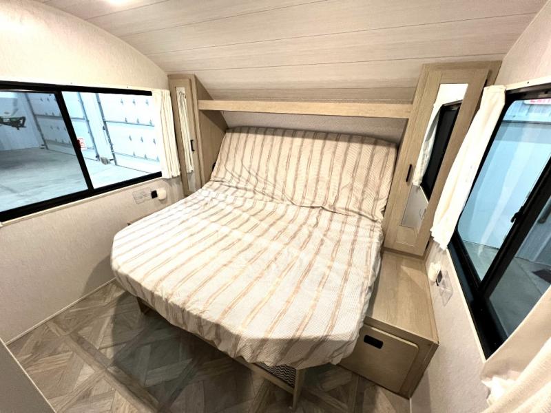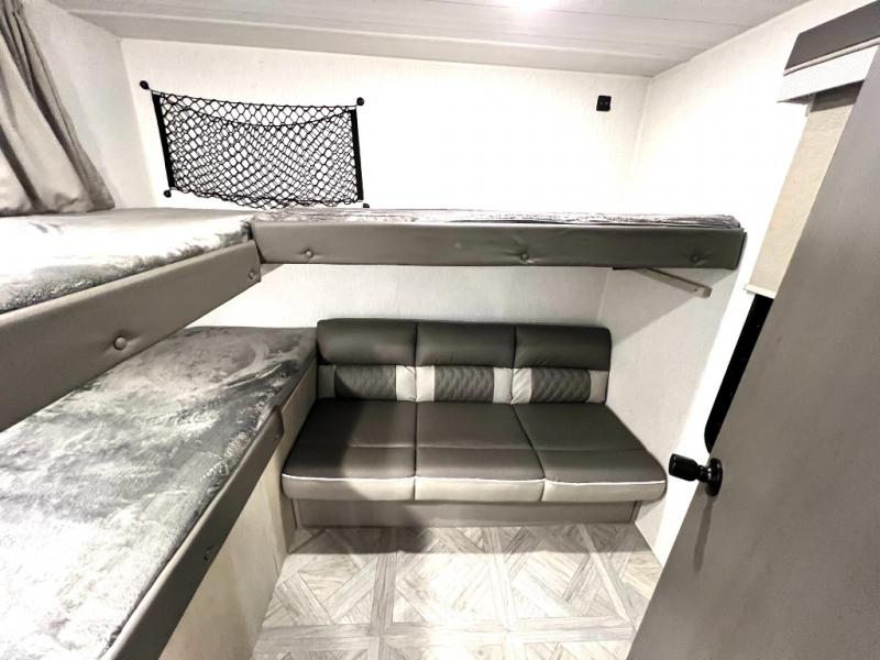 This versatile bunkhouse travel trailer is big enough for the whole family, but still light in weight! The private bunkhouse has a set of 30" x 74" bunk beds and a 30" x 74" bunk bed above a Jiffy sofa. Just outside the bunkhouse is a pantry big enough to store everyone's favorite snacks, and a full bathroom with a walk-in shower. The three burner cooktop is just waiting for you to create a delicious meal, and the U-shaped dinette welcomes everyone to enjoy each meal in comfort, plus there is a large panoramic window for a perfect view of your surroundings. Any time of day kick back on the Versa-lounge and relax by the fireplace at the entertainment center. The exterior features a pass-through storage area for you to keep your outdoor camping gear stowed away when not in use, a 16' power awning to protect you, and an exterior camp kitchen!