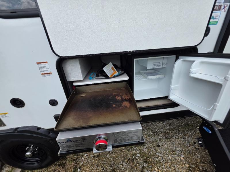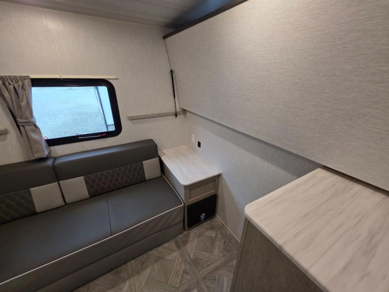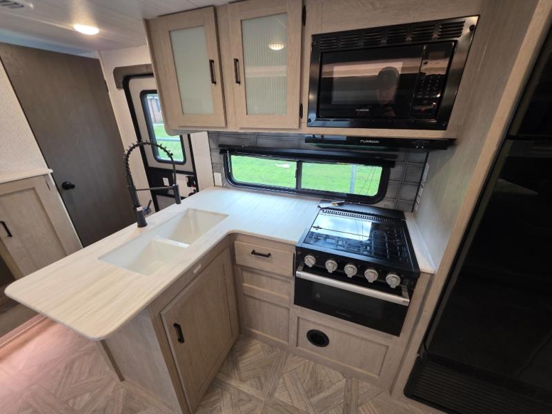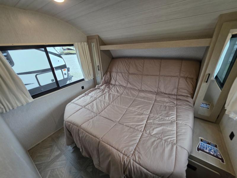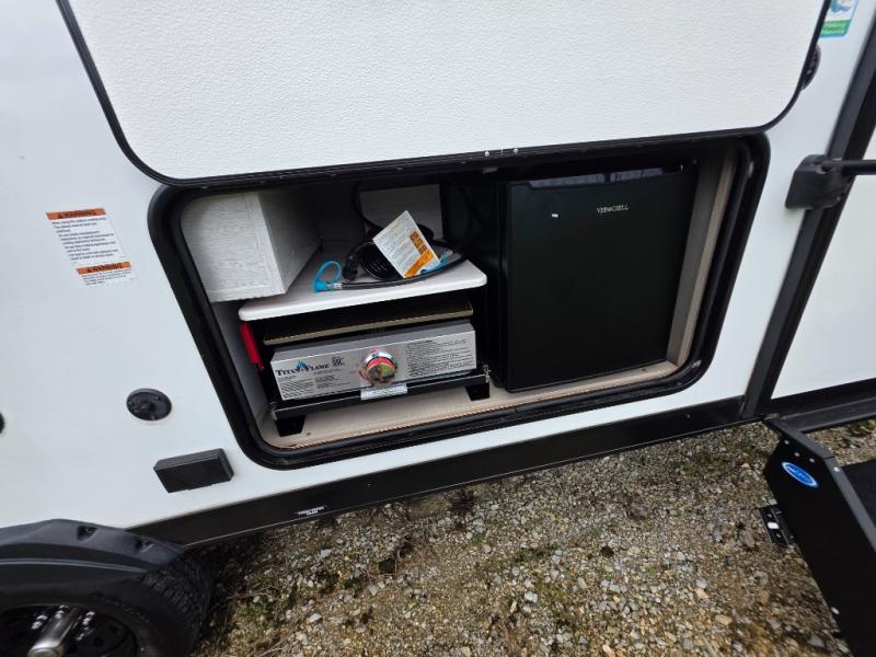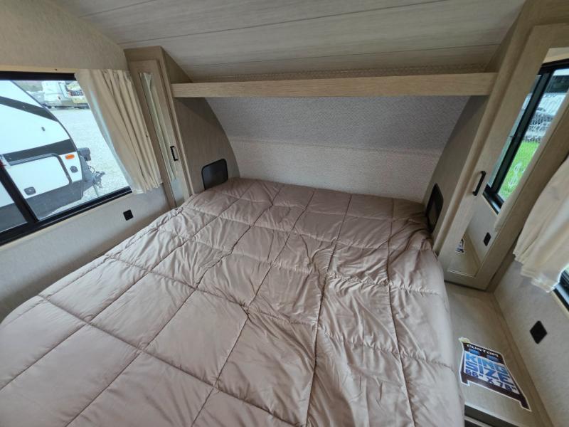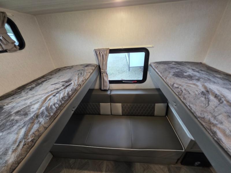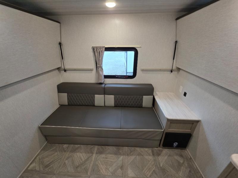 This travel trailer is new to the lineup and offers a large amount of versatility! The rear private bunkhouse has two 30" x 74" Versa-bunks and a Versa-queen bed so that more can join in on the camping fun. Start each morning feeling clean and fresh after showering in the walk-in shower with fiberglass surround then head to the front private bedroom to change. The kitchen has an oversized 11 cu. ft. 12V refrigerator to keep your perishables fresh, a three burner cooktop for meals, and a U-shaped dinette for dining, game time, or just hanging out.