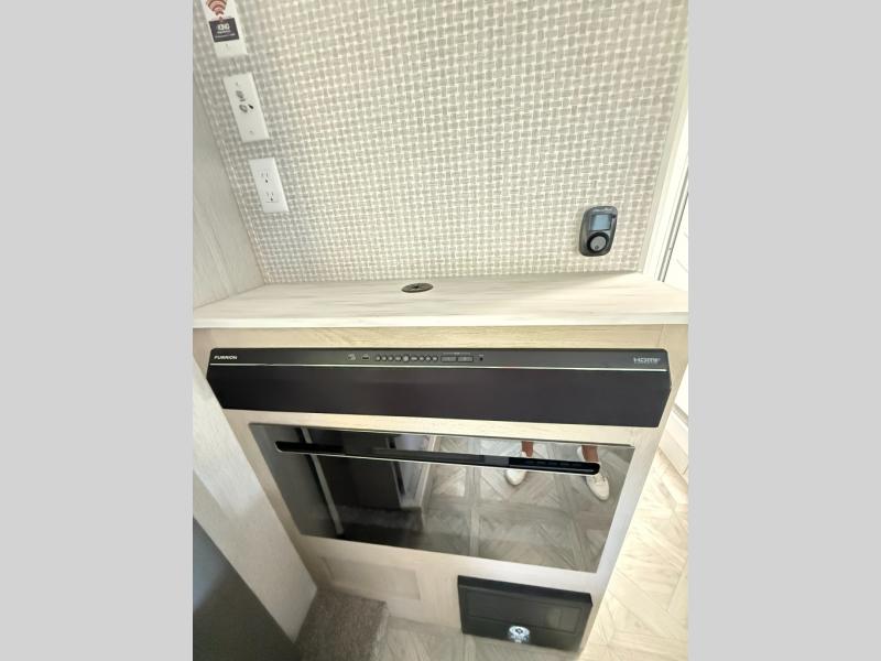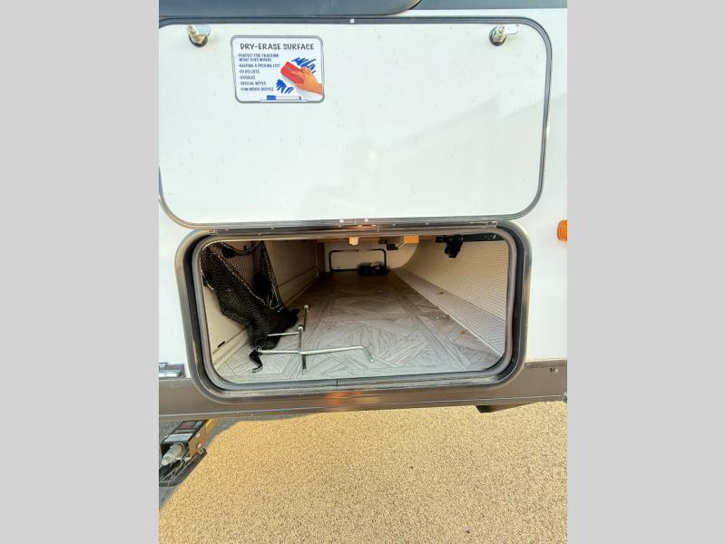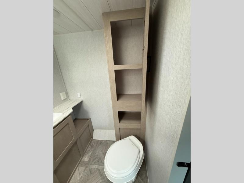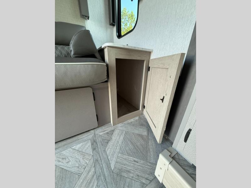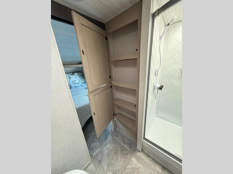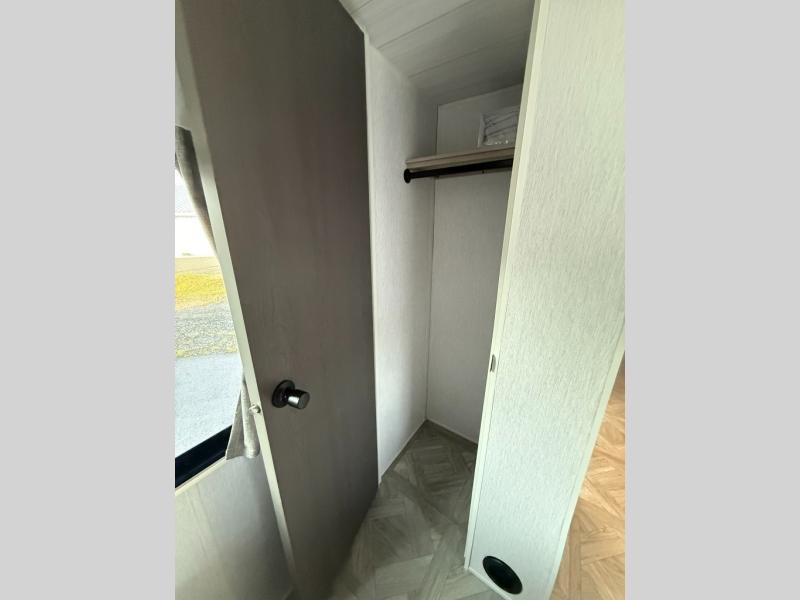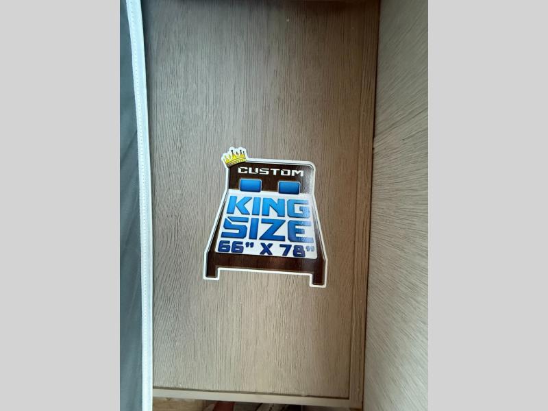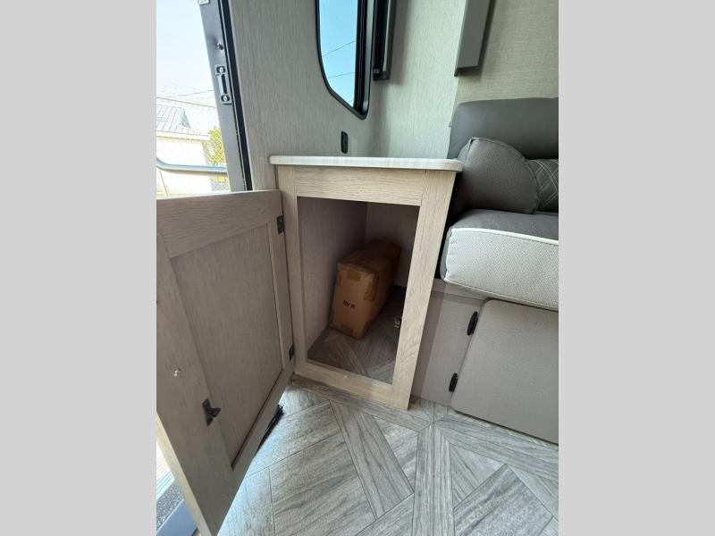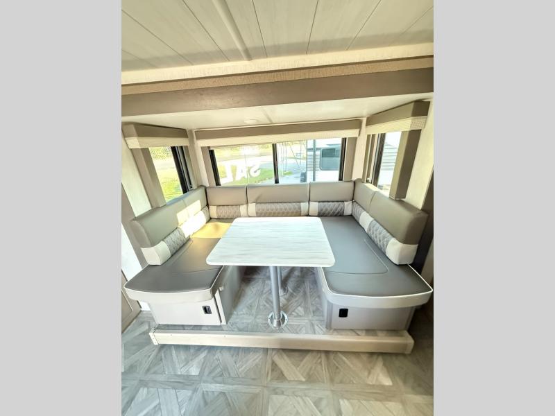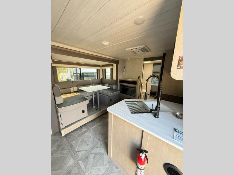 This travel trailer is packed full of features, but is still lightweight coming in at just over 5,000 lbs.! You will feel right at home in the front master bedroom with a custom king bed with Versa Tilt that has closets on either side, CPAP storage, and a walk-in closet to keep your clothes looking their best. The walk-through bathroom has a walk-in shower with fiberglass surround and a skylight above for added natural lighting as you get ready. The U-shaped dinette slide has a panoramic window for you to enjoy your beautiful scenery as you eat dinner, and there is a fireplace at the entertainment center for a relaxing evening indoors. There is a pass-through storage area to store your outdoor camping gear, and a 16' power awning and exterior speakers to crank up the tunes!