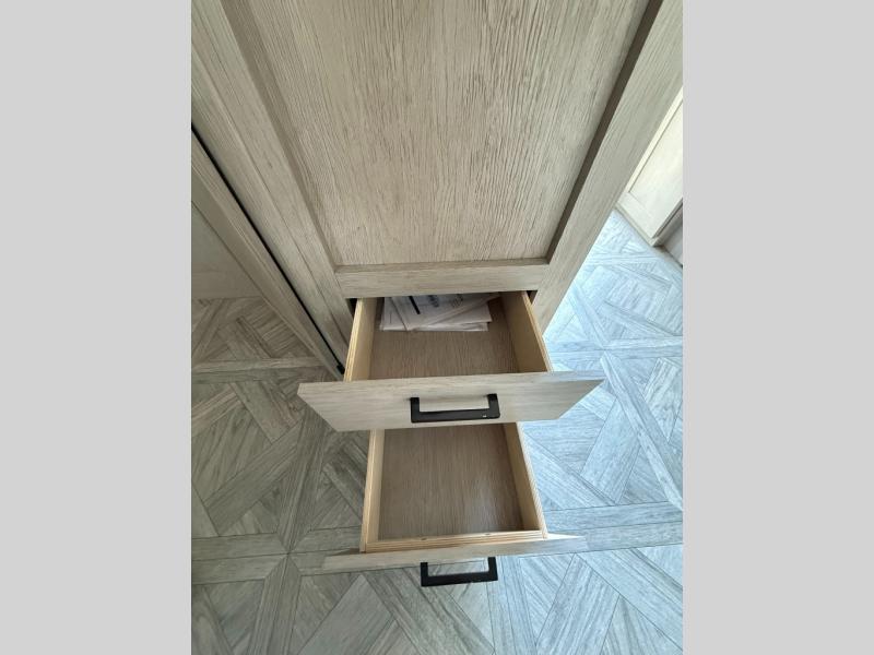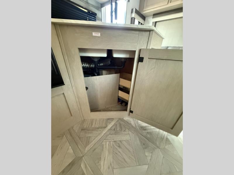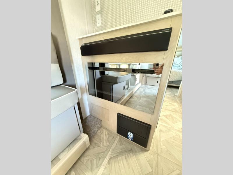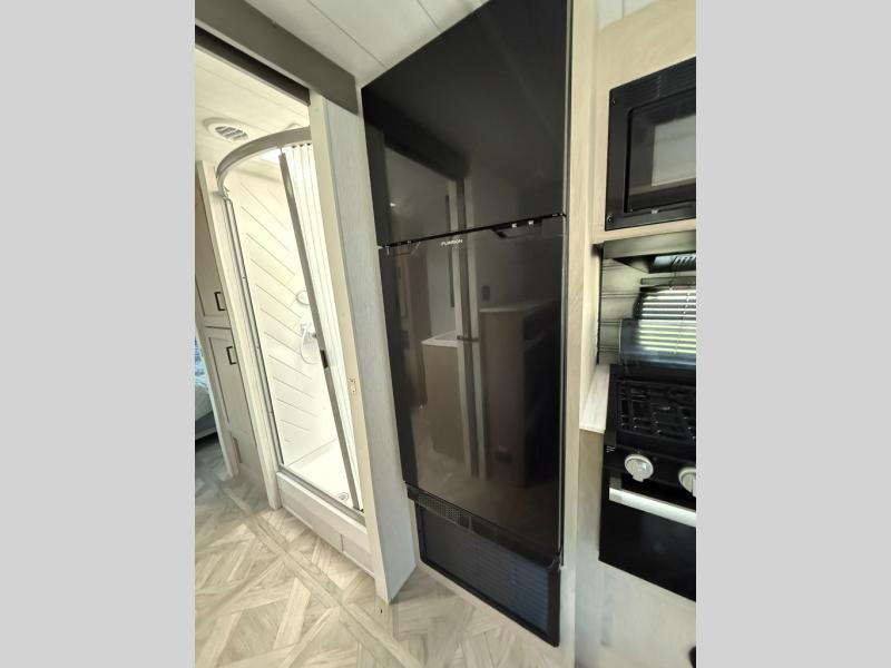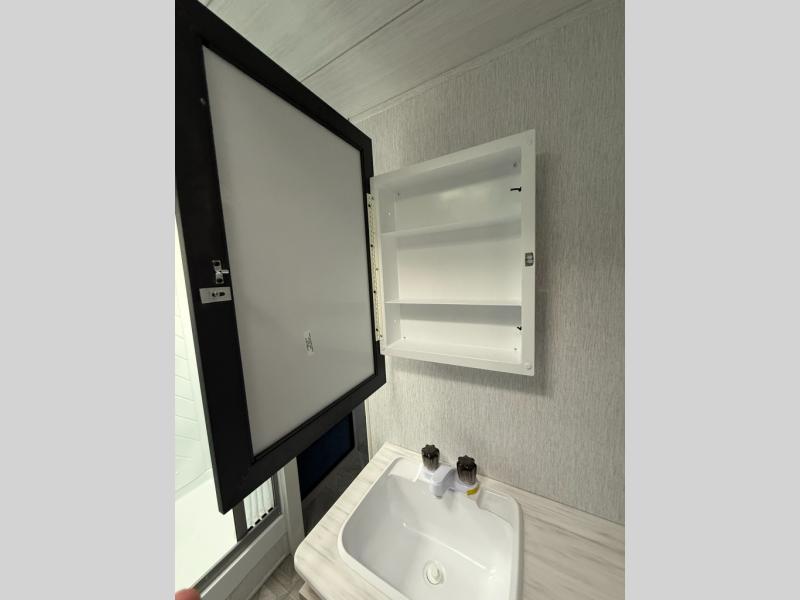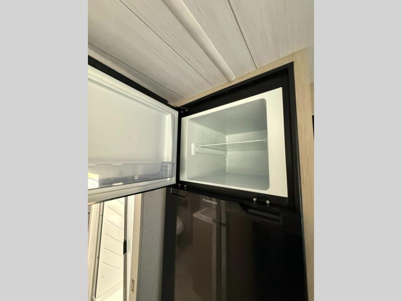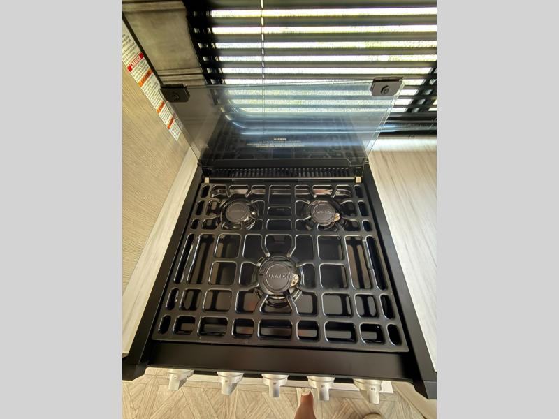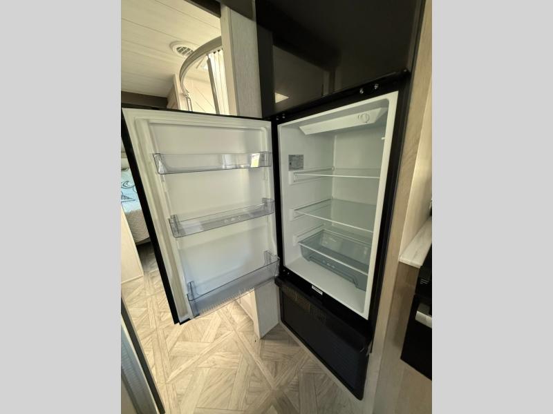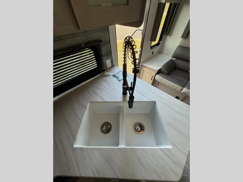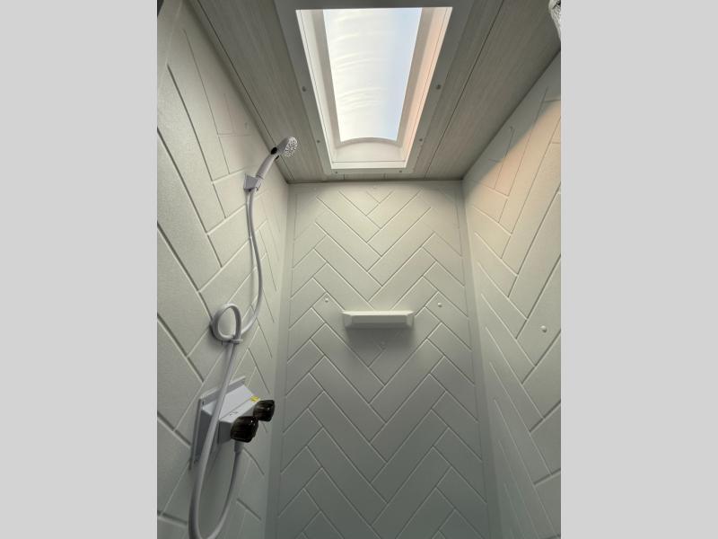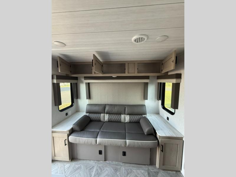 This travel trailer is packed full of features, but is still lightweight coming in at just over 5,000 lbs.! You will feel right at home in the front master bedroom with a custom king bed with Versa Tilt that has closets on either side, CPAP storage, and a walk-in closet to keep your clothes looking their best. The walk-through bathroom has a walk-in shower with fiberglass surround and a skylight above for added natural lighting as you get ready. The U-shaped dinette slide has a panoramic window for you to enjoy your beautiful scenery as you eat dinner, and there is a fireplace at the entertainment center for a relaxing evening indoors. There is a pass-through storage area to store your outdoor camping gear, and a 16' power awning and exterior speakers to crank up the tunes!