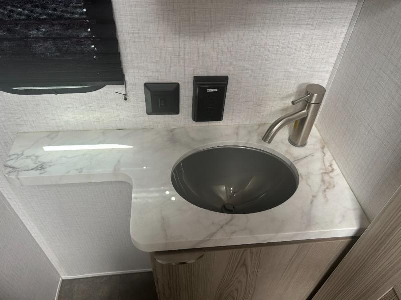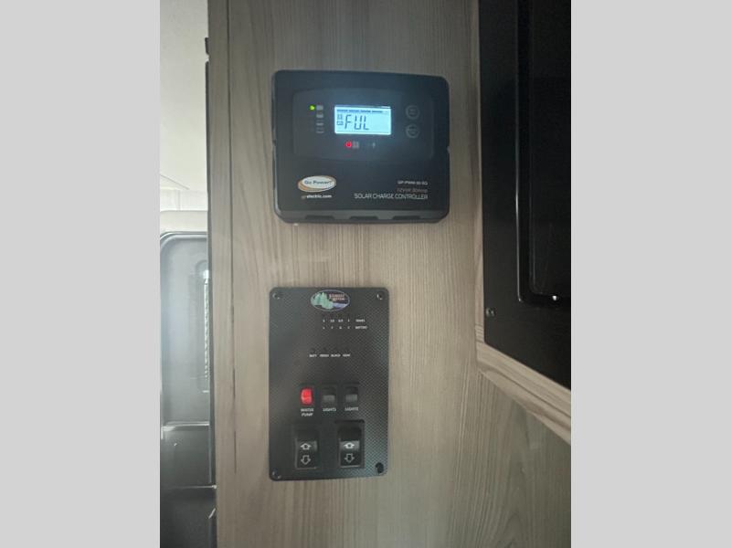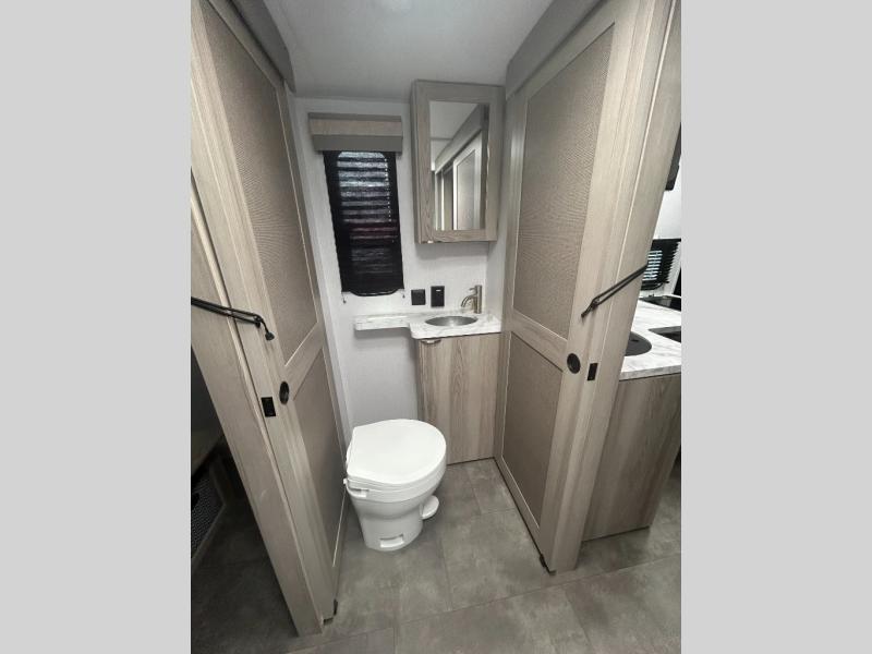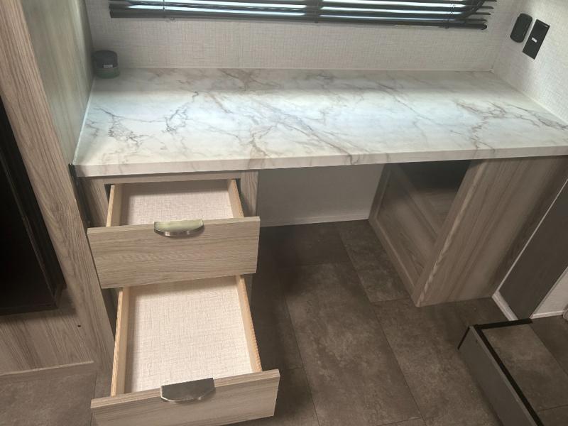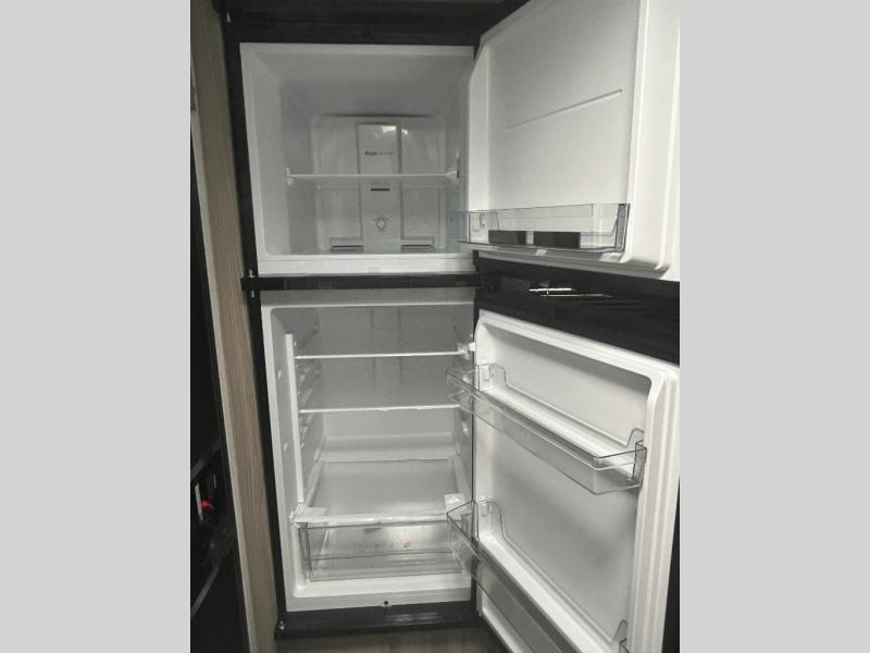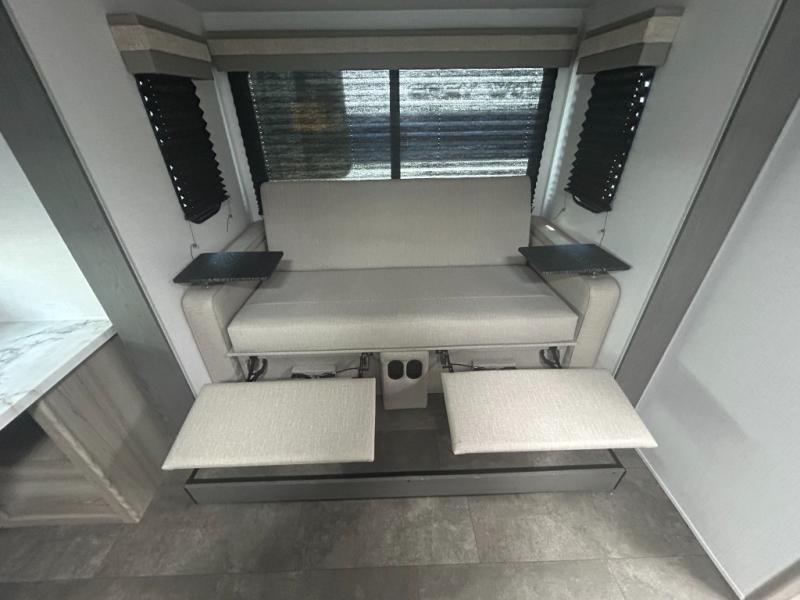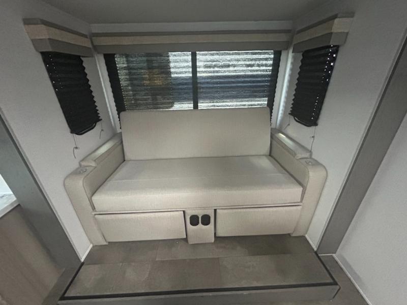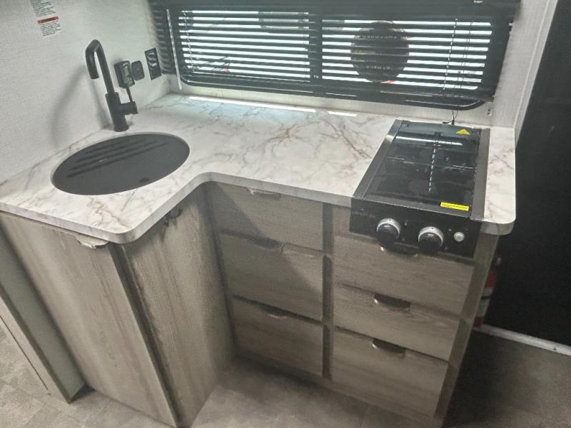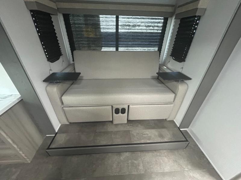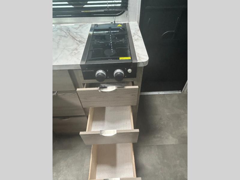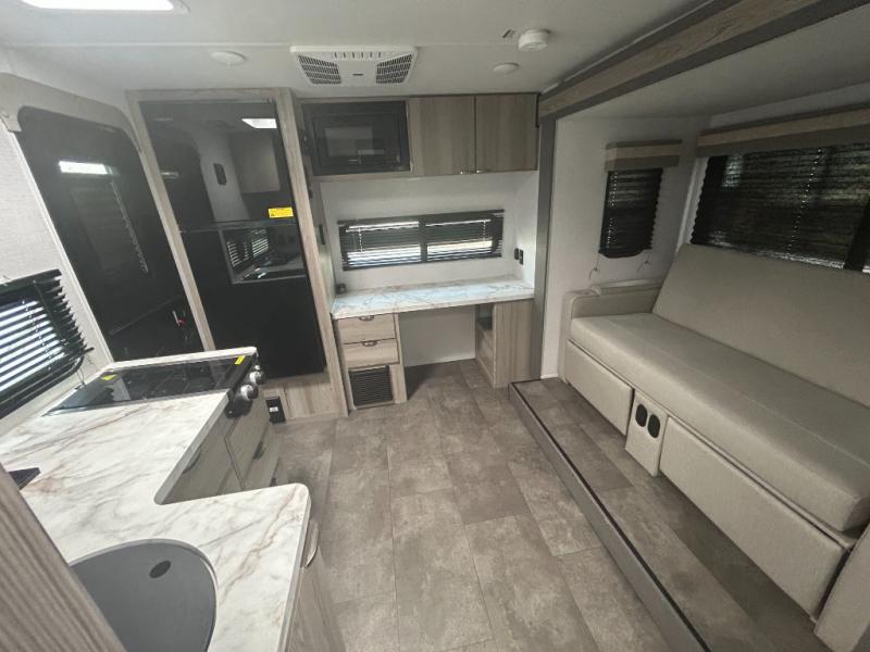 You're going to love every minute spent in this couple's trailer. The queen bed in the front private bedroom will provide a great night's rest, and there are dual wardrobes to easily get dressed in the morning. Head to the kitchen through the bath, then prepare eggs and bacon on the two burner cooktop. There is theater seating here to enjoy your coffee at each morning, or you may want to get some work done at the mobile workstation!