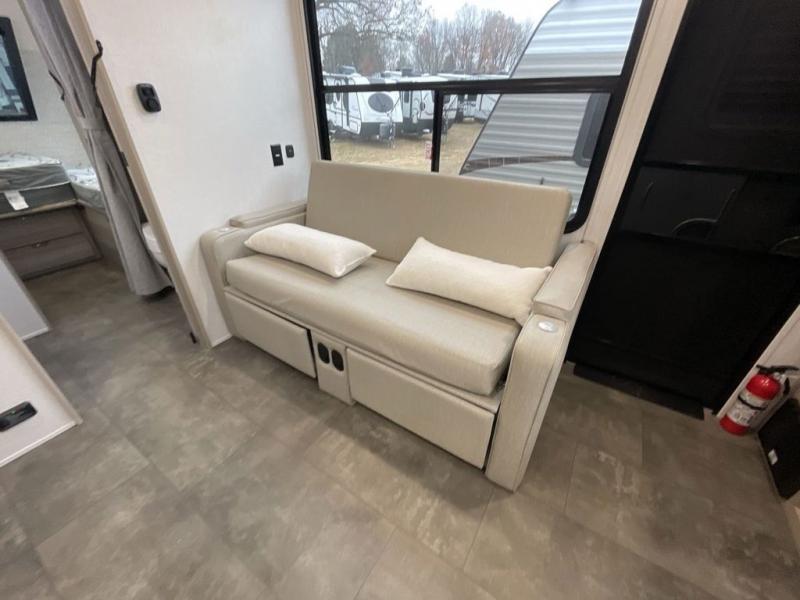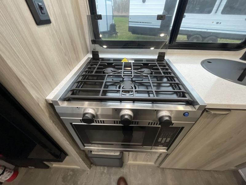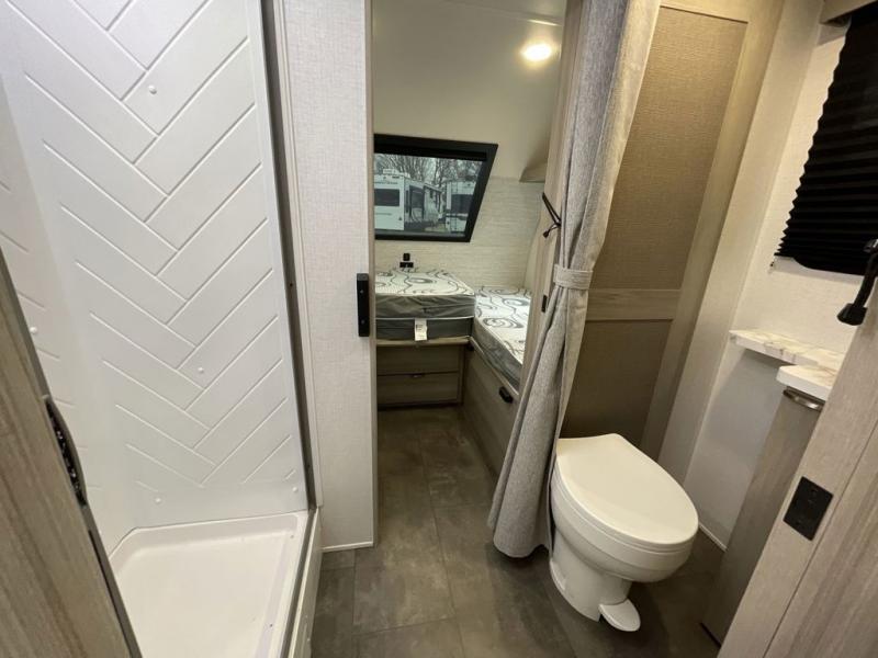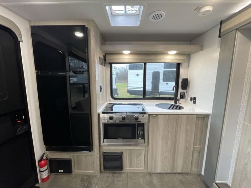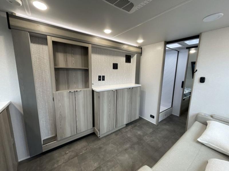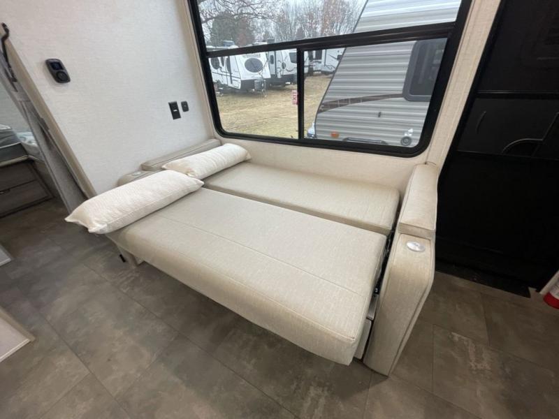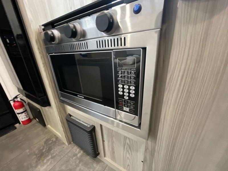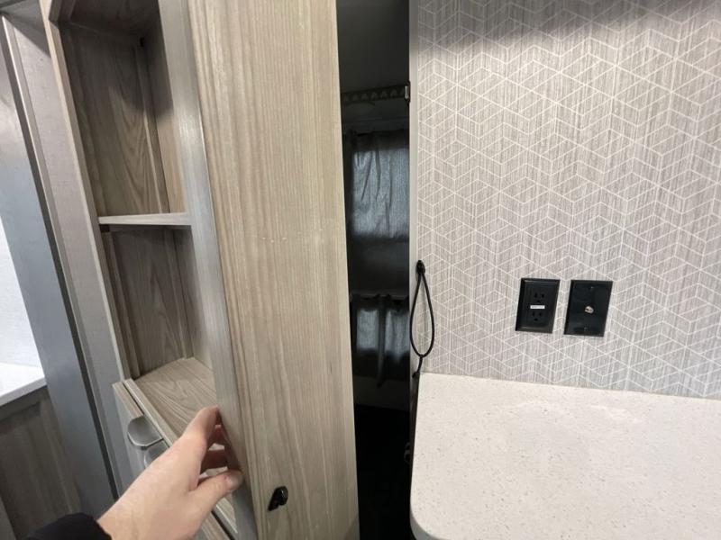 Versatility is found throughout this travel trailer! The front two twin beds convert to a king bed for comfortable sleeping at night, plus there is a split bunk bed slide for an additional sleeping space. The bunk bed is located behind the spice rack door and TV for your entertainment and cooking needs. Speaking of cooking, you can prepare your best home cooked meals with the cooktop and store any leftovers in the dual swinging 12V refrigerator. Relax each night in the theater seating and freshen up in the walk-through bathroom each morning. If you wish to go off grid then you can add the optional solar extended 200W power package!