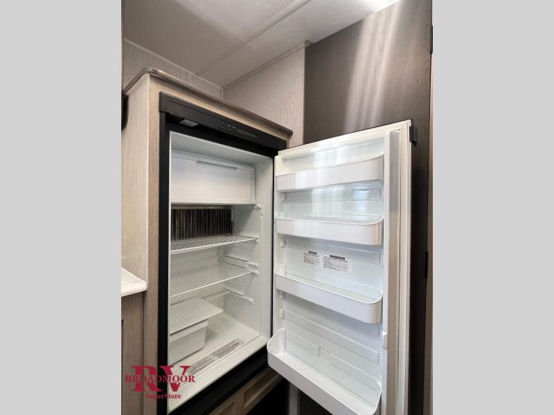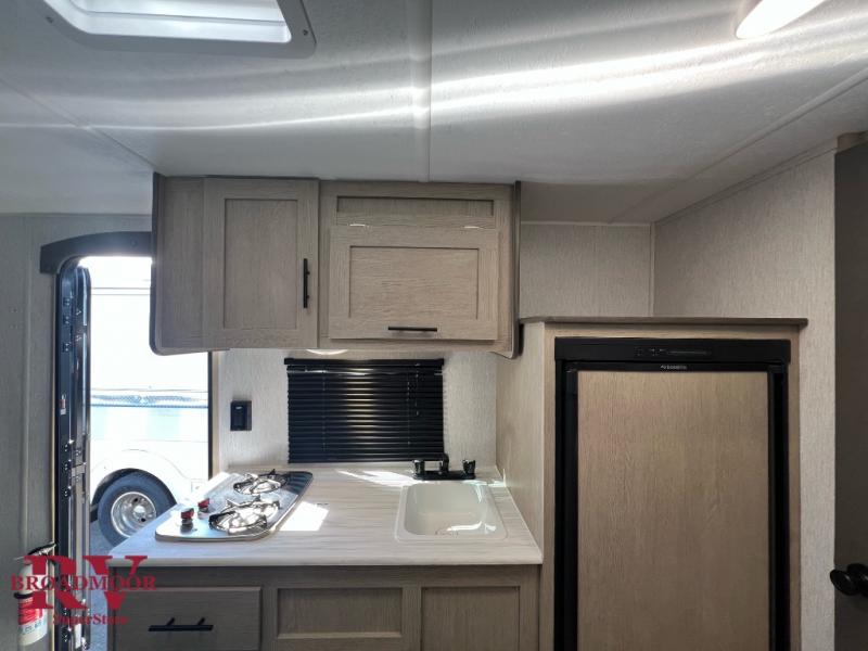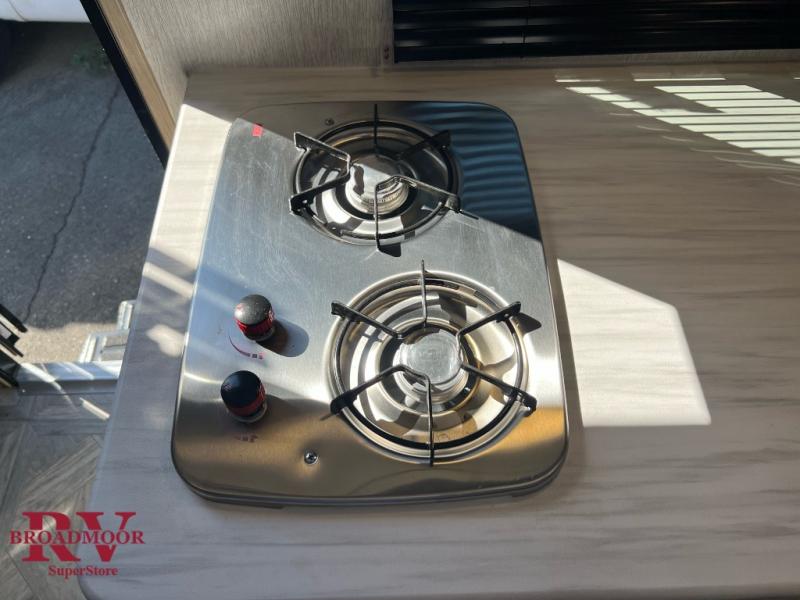 Pack your bags and head for the lake with this travel trailer in tow! Since you won't be sleeping in a tent on an air mattress, you'll love having the front queen bed for a great night's rest, and the wardrobe at the foot of the bed will keep your clothes organized. There are bunk beds in the back plus a private bath with a toilet and shower so you can freshen up each day. A two burner cooktop comes standard in the kitchen so you can make breakfast in the morning, and there is a 6 cu. ft. double door refrigerator for cold food storage. This model also includes a sofa that will double as seating and extra sleeping space; how convenient!