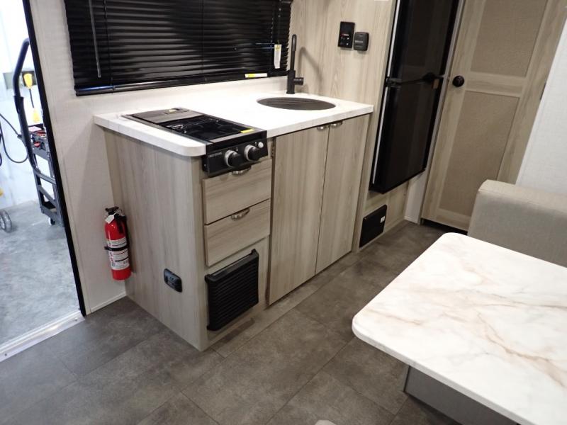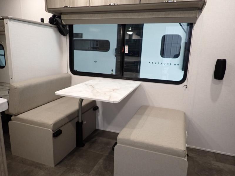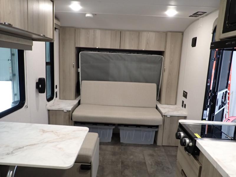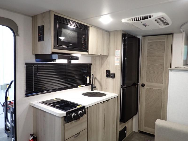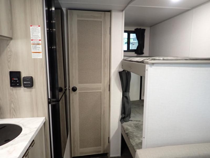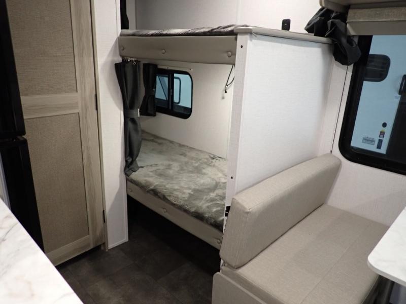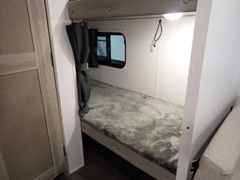 You can bring the whole family in this travel trailer and comfortably camp together! There is a set of bunk beds with storage below and a front queen bed just for you. The booth dinette could even transform into an extra sleeping space when you aren't using it to enjoy a meal prepared with the two burner cooktop. Any leftovers can be stored in the 11 cu. ft. frost free refrigerator to be enjoyed once again with the microwave. Freshen up each morning in the rear corner bathroom that includes a shower with a skylight and keep the dirt outside where it belongs with the outside shower that has hot and cold water!