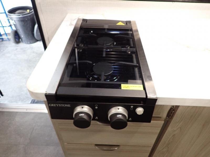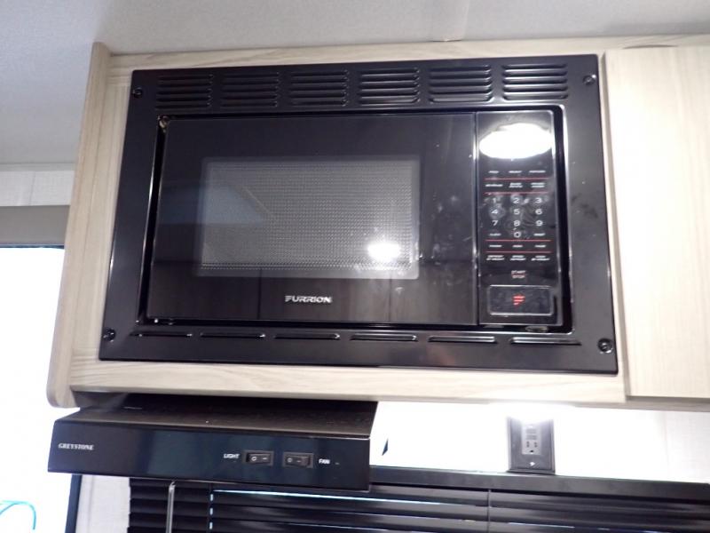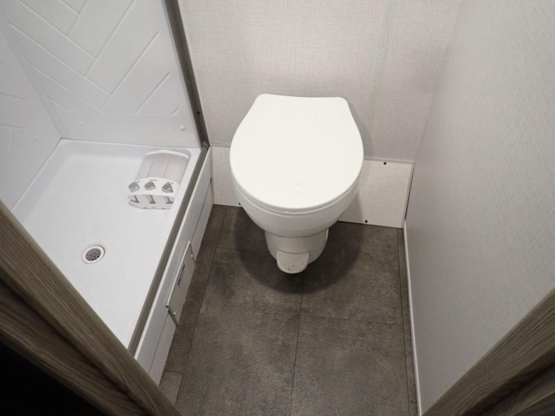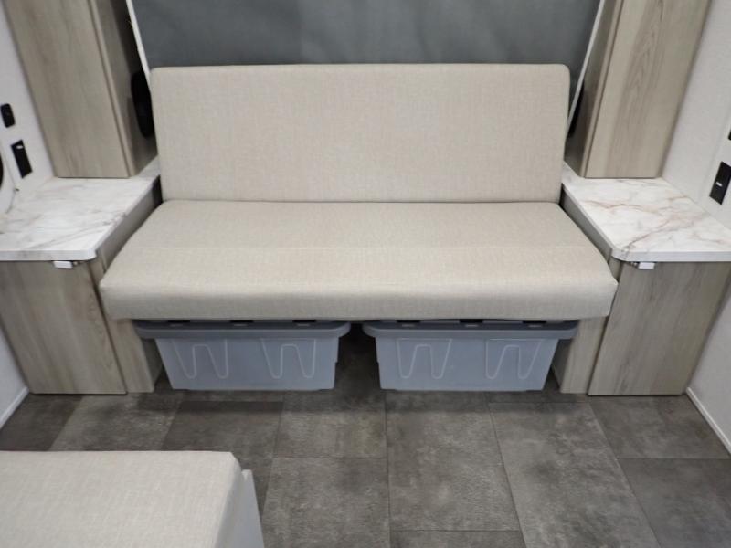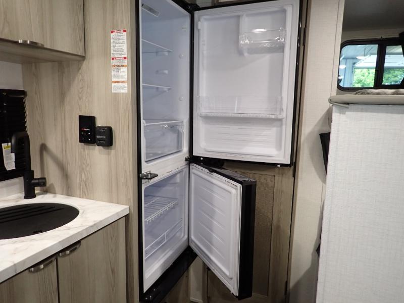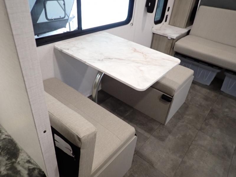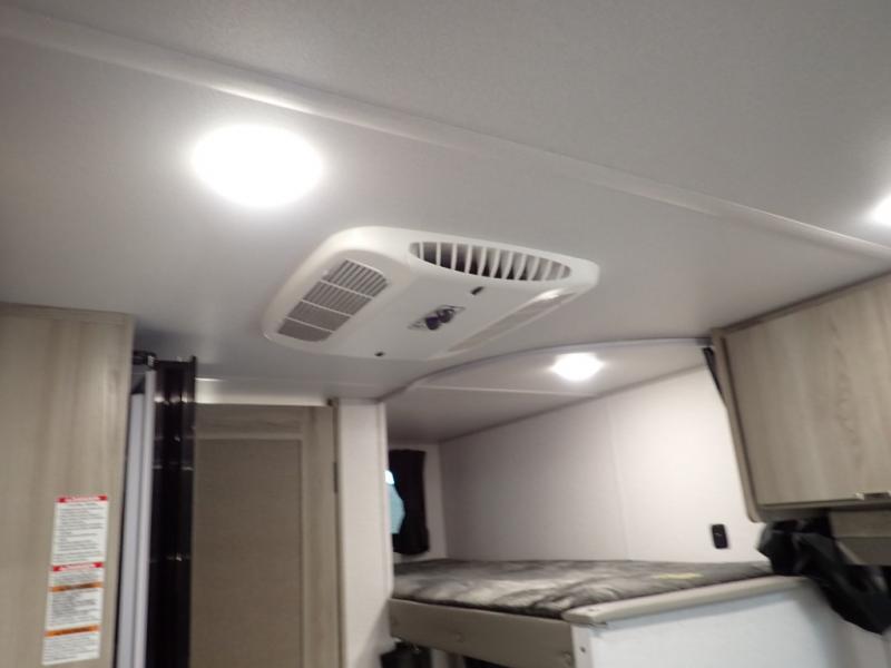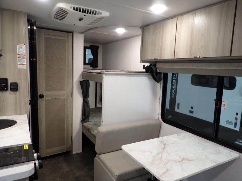 You can bring the whole family in this travel trailer and comfortably camp together! There is a set of bunk beds with storage below and a front queen bed just for you. The booth dinette could even transform into an extra sleeping space when you aren't using it to enjoy a meal prepared with the two burner cooktop. Any leftovers can be stored in the 11 cu. ft. frost free refrigerator to be enjoyed once again with the microwave. Freshen up each morning in the rear corner bathroom that includes a shower with a skylight and keep the dirt outside where it belongs with the outside shower that has hot and cold water!