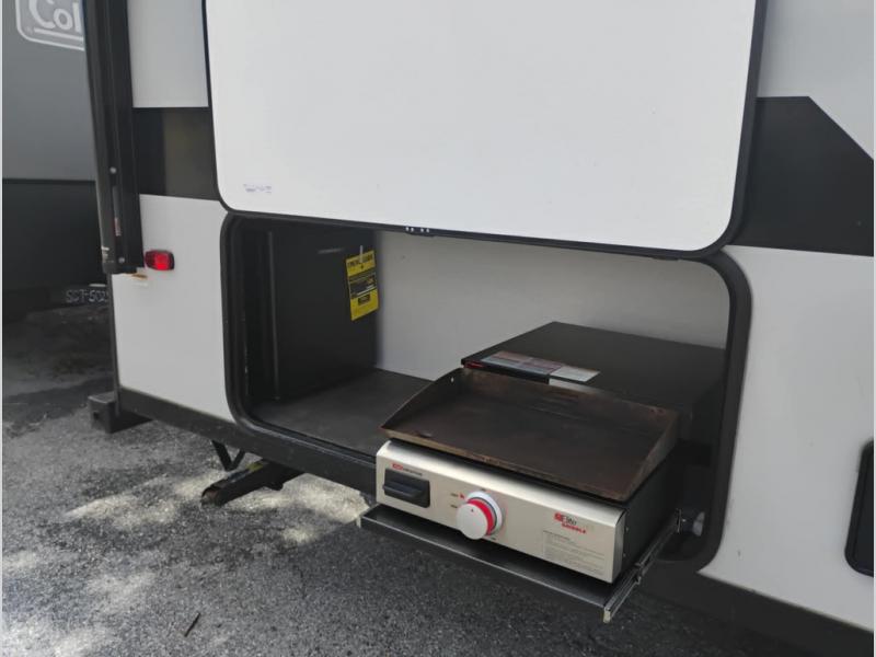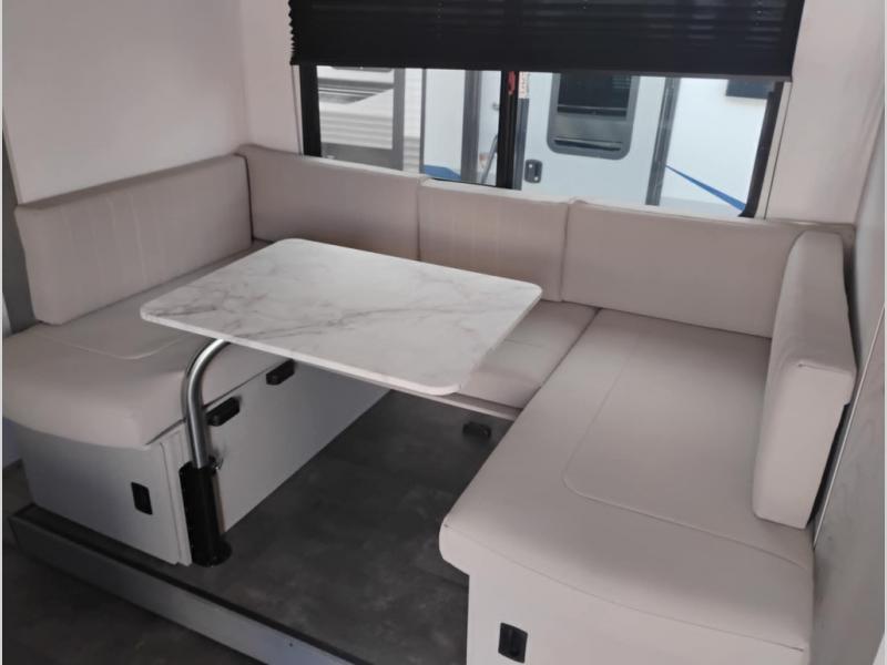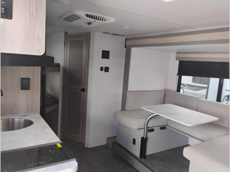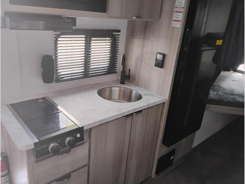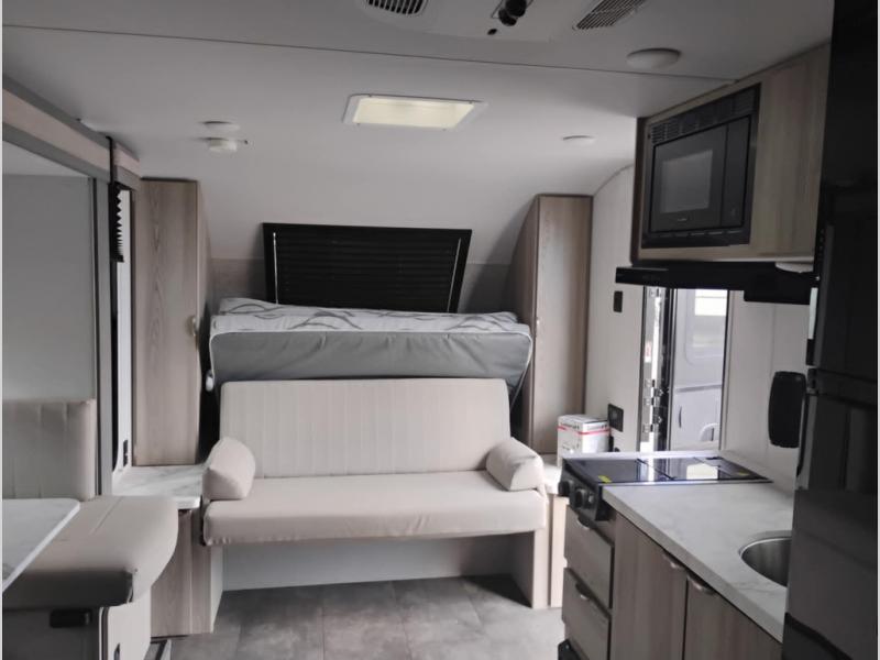Start camping the right way in this travel trailer! It features a front Murphy bed that will double as your seating and sleeping space each day. The corner set of double-size bunk beds come with storage to keep things out of the way and are conveniently next to the rear corner bathroom with a shower with a skylight to freshen up in each morning. You can prepare your best home cooked meals indoors with the two burner cooktop or head to the outside kitchen to fry up some burgers while breathing in some fresh air. Enjoy your meals, play card games, and even sleep at the U-shaped dinette slide. You will also appreciate the outside shower and the exterior full pass-through storage for camp gear!