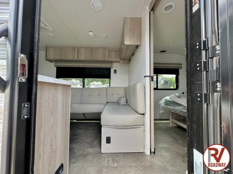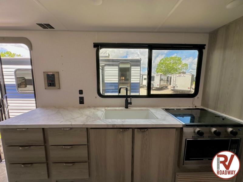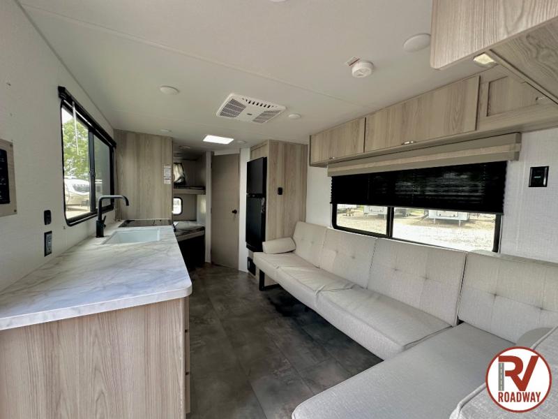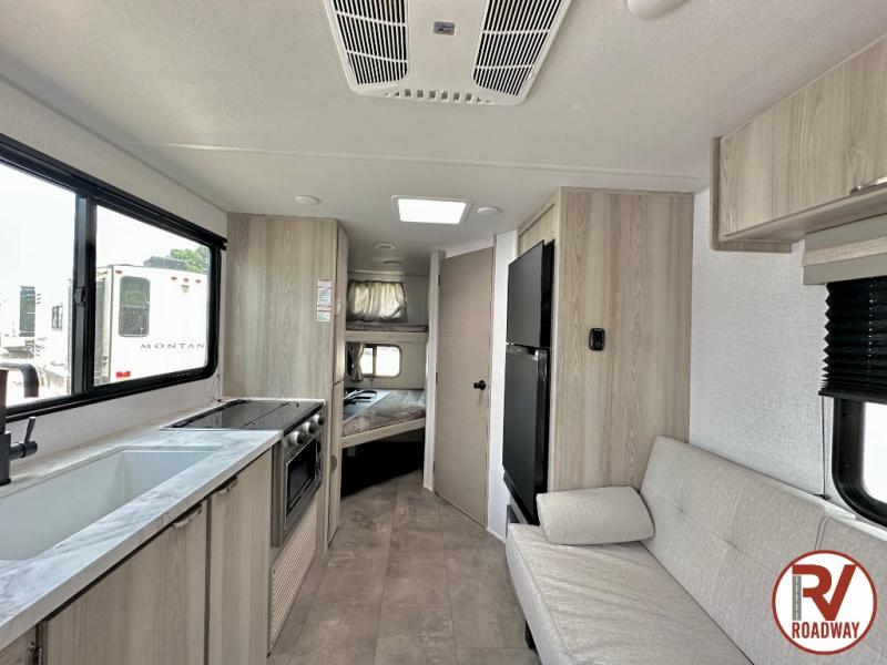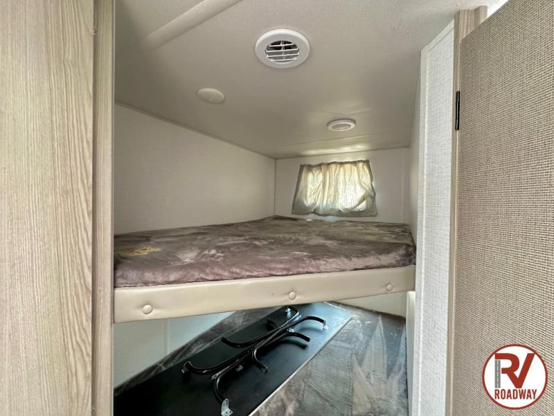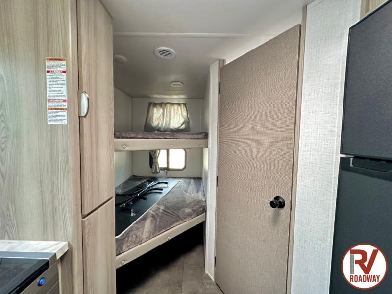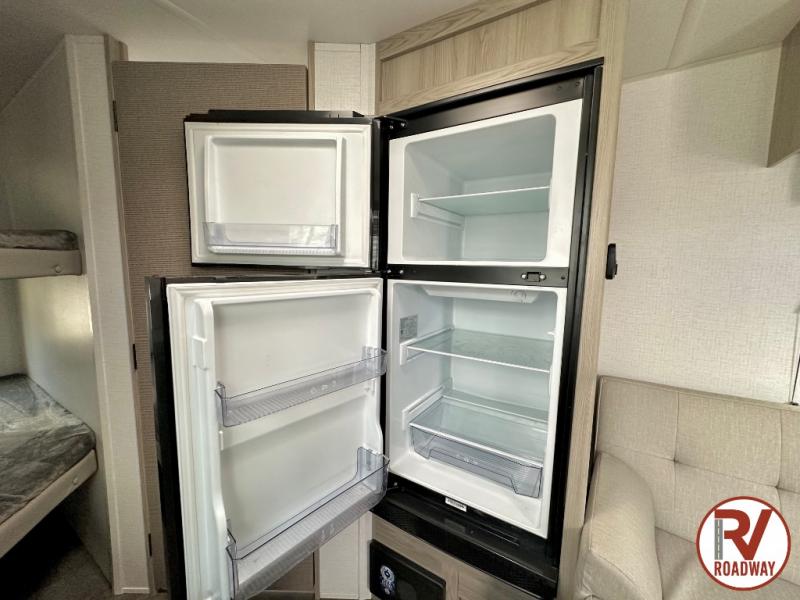 Camping is made easy in this travel trailer with more sleeping space and lots of comforts! The kids or your guests will enjoy the double-size bunks in the back, along with the full bath close by for easy nighttime use. You'll have the front private bedroom with a king bed all to yourselves, and there are dual bedroom wardrobes to keep your space neat and clean. Everyone can meet in the combined kitchen and living room to relax on the super U-lounge with a removable table while the chef of your group makes breakfast on the two burner cooktop. There is also a microwave oven for quick meals, plus a pantry and 4.5 cu. ft. refrigerator for food storage!
