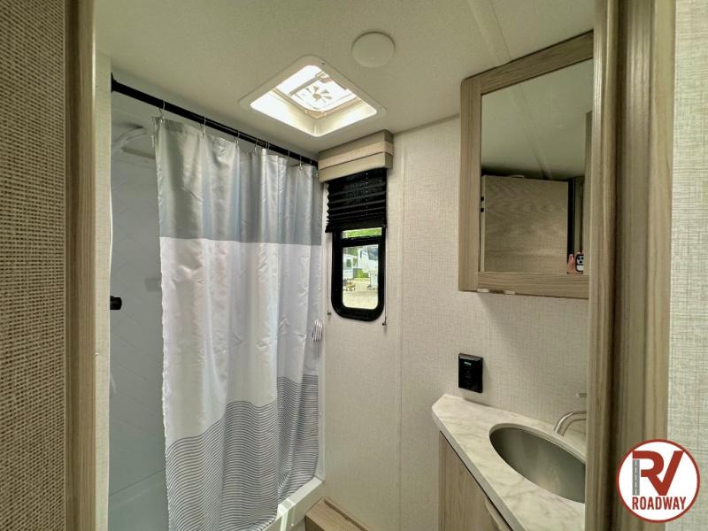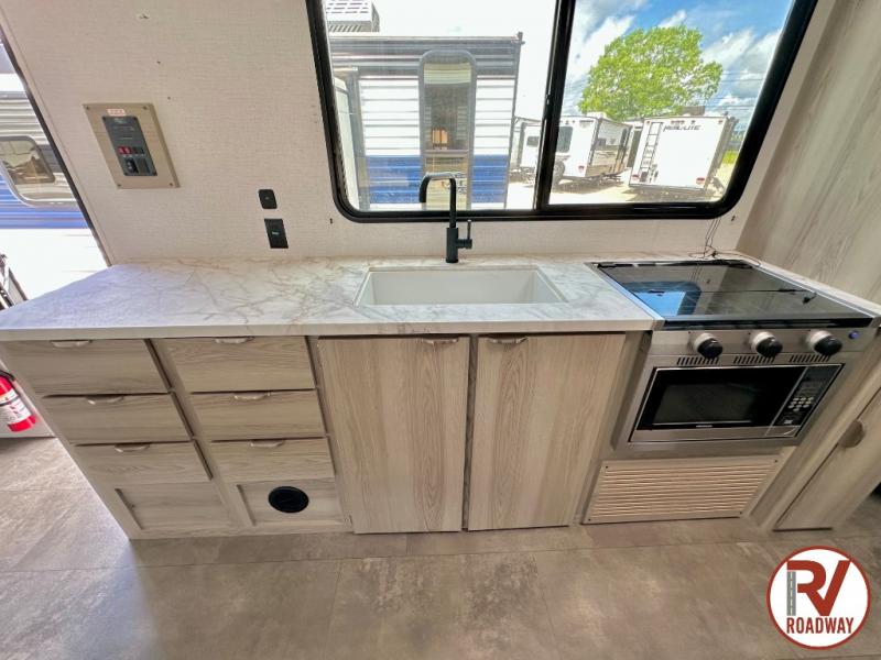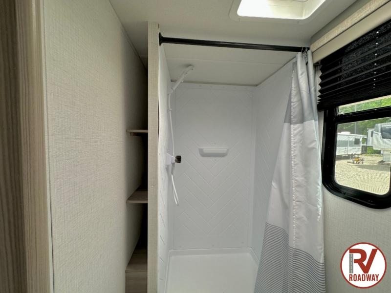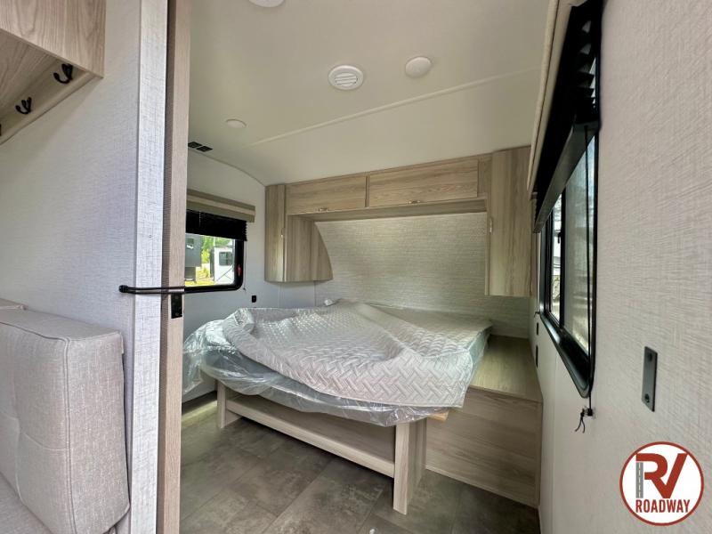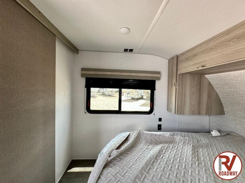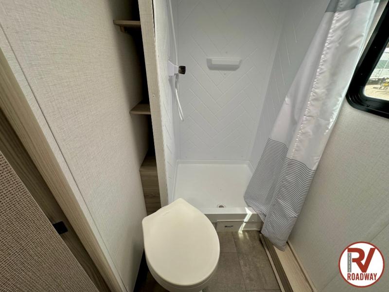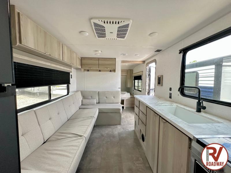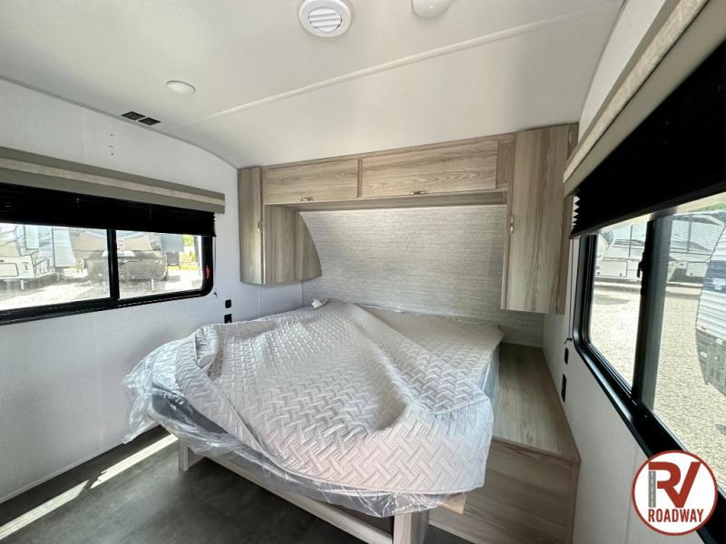 Camping is made easy in this travel trailer with more sleeping space and lots of comforts! The kids or your guests will enjoy the double-size bunks in the back, along with the full bath close by for easy nighttime use. You'll have the front private bedroom with a king bed all to yourselves, and there are dual bedroom wardrobes to keep your space neat and clean. Everyone can meet in the combined kitchen and living room to relax on the super U-lounge with a removable table while the chef of your group makes breakfast on the two burner cooktop. There is also a microwave oven for quick meals, plus a pantry and 4.5 cu. ft. refrigerator for food storage!