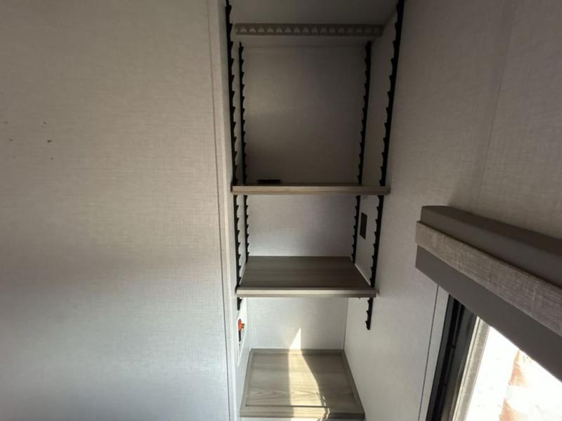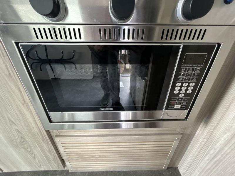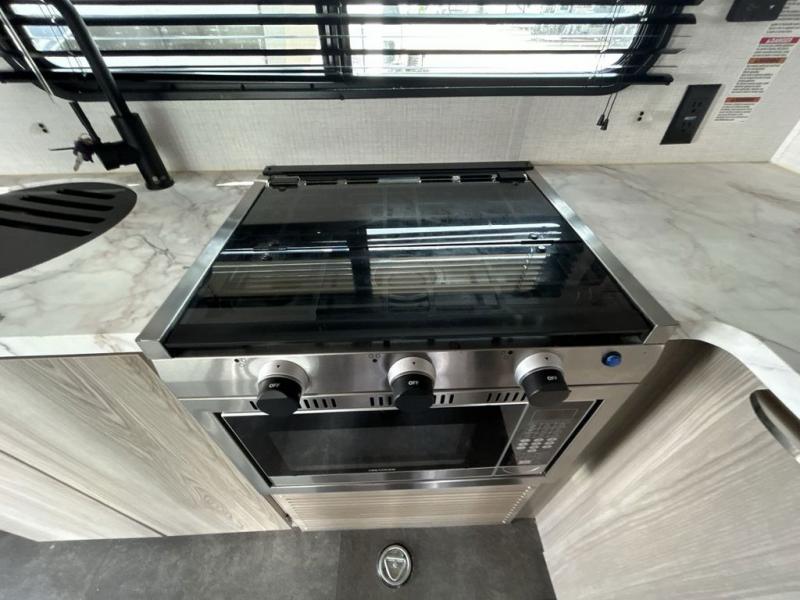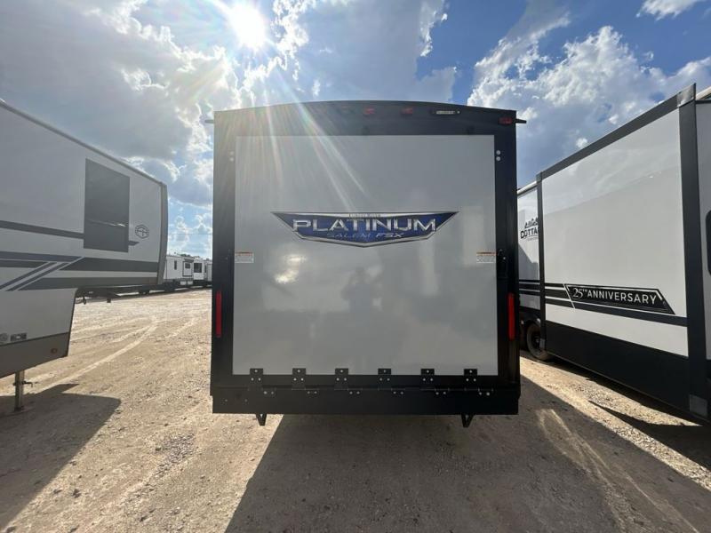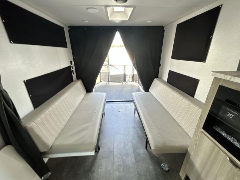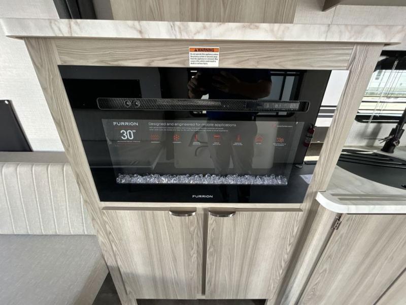 Make the most of your vacations with this Platinum version MAX toy hauler! The 14' garage area includes dual sofa sleepers with a table in between to dine at, plus a 3,000 lb. ramp door for easy unloading. Enjoy the fireplace for a cozy evening indoors while your dinner is cooking on the three burner cooktop or being heated up in the microwave. After a fun day of trail riding, you can clean the mud out of your hair with the 30" x 36" shower with a skylight in the full bathroom. The front private bedroom has a queen bed to lay your head on at night, shoe storage under the bed, a walk-in closet, and wardrobes on either side of the bed for even more clothing storage space.