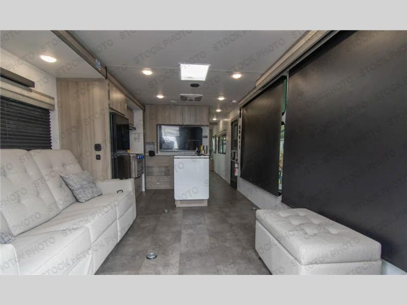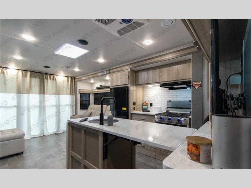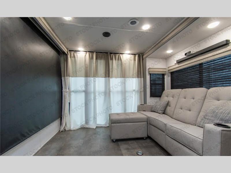 There is a lot to love about this toy hauler! Starting with the 1,500 lb. patio with a three seasons door that leads into the garage area. Once you remove your off-road toy from the 1,500 lb. tie downs, you can open up the slide that houses theater seating with a chaise lounge, a dual swinging 12V refrigerator, and cooktop. The kitchen also has a hutch and island with sink and flip-up countertop. You even have a movie theater projector with premium sound to watch your favorite movies in style. The set of bunk beds have their own privacy with a secret door to access them and a bike door for outside access. Everyone can freshen up with the large shower in the full bathroom. The front private bedroom has a king bed with Versa tilt, wardrobes on either side of the bed, and another wardrobe to keep your clothes looking their best!