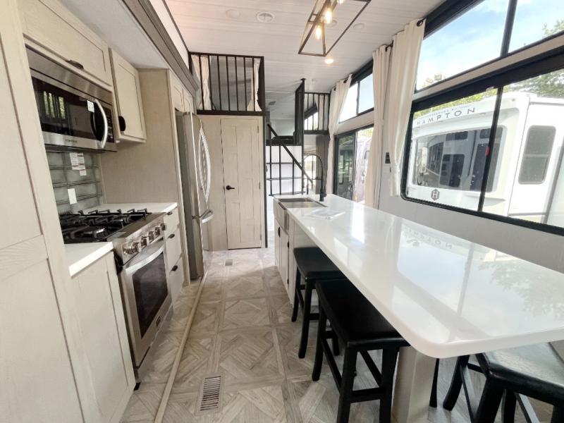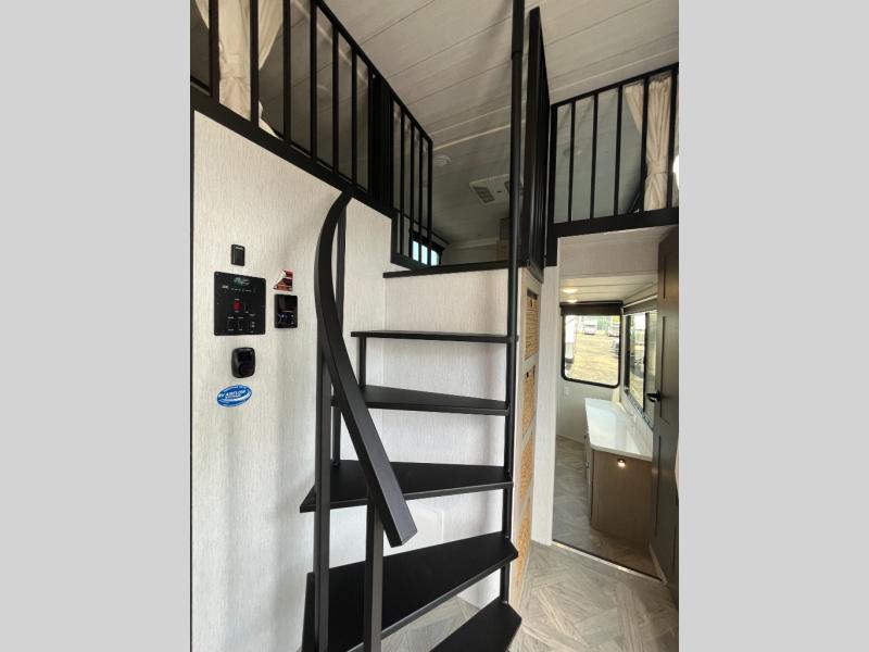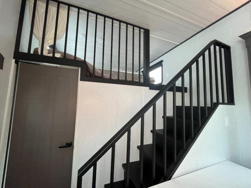 You will feel like you are home when you step inside! Not only will you be impressed with the super large slide in the main combined kitchen and living area, but check out the island with five counter height seats! The main entry closest to the front features a step up to a private bedroom featuring a custom king bed with Versa-Tilt within a slide, plus a fireplace, wardrobe, and drawers for your belongings. Just outside this door, a half bath around the corner and a spiral staircase to the front loft with two 42" x 74" bunk mats above. The kitchen is fully equipped for you to provide the best home cooked meals with a roll-out pantry, range and microwave, plus side-by-side refrigerator all part of the large slide that also houses an L-shaped sectional sofa with ottoman so everyone can have a seat! Opposite the sectional find an entertainment center with pop-up TV and fireplace. A second set of stairs leads up to the rear loft featuring a 62" x 74" Versa Queen mattress and dresser. Back down in the very back of the unit a large bathroom with walk-in shower, linen cabinet, toilet, and vanity with sink. There is also a space that has washer/dryer prep to add even more convenience. Outside, a 26' awning for outdoor living, and double entry doors to make it easy to move in and out.
