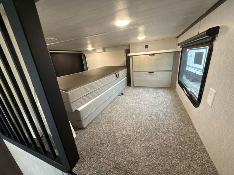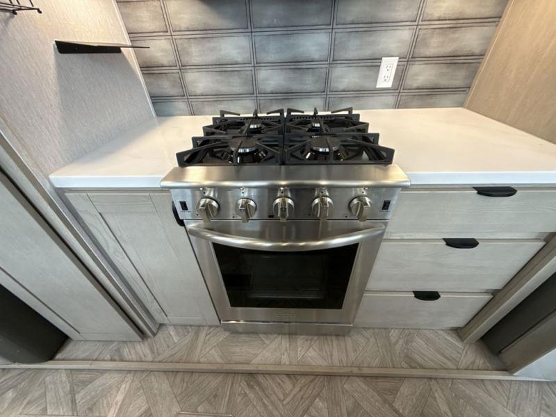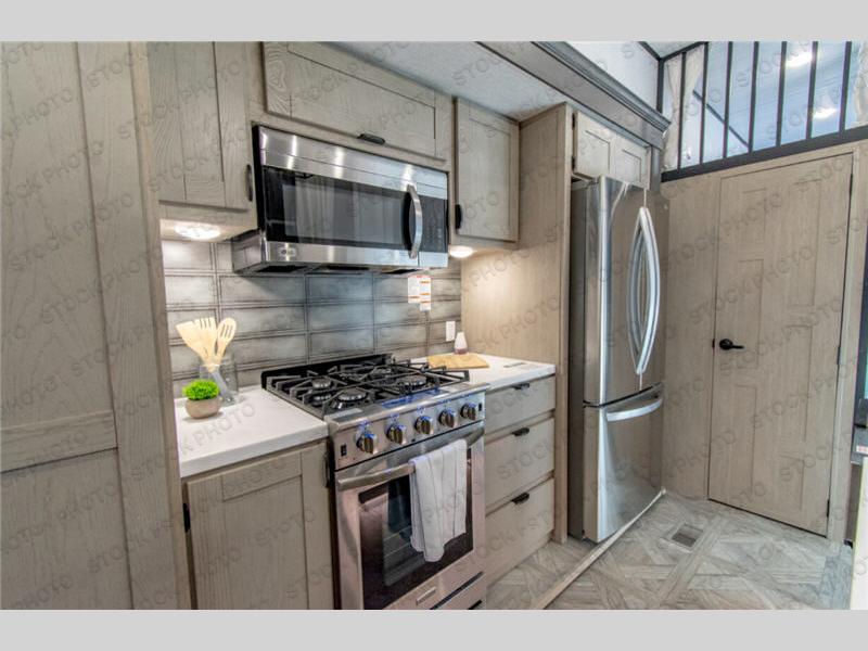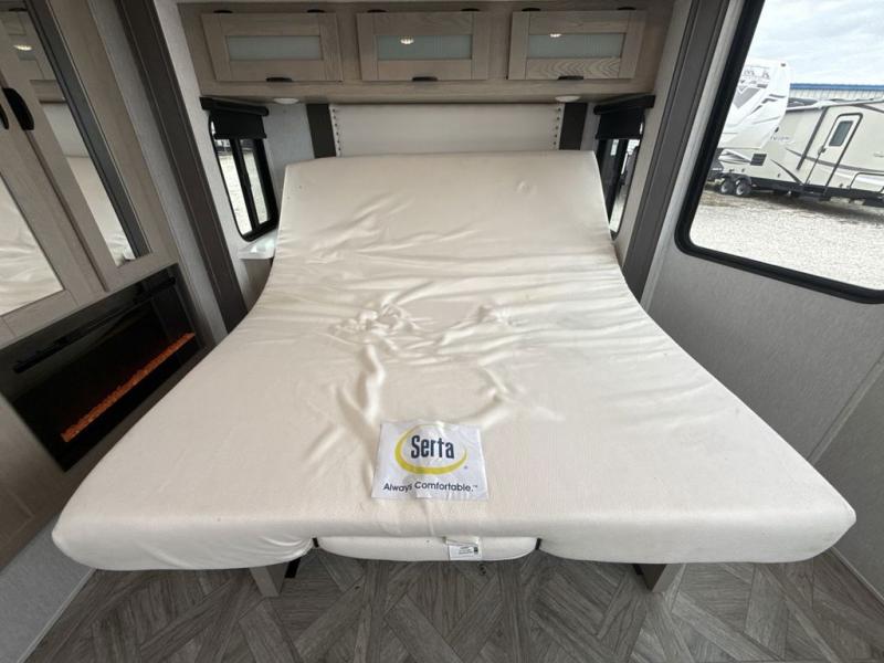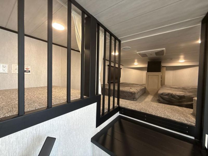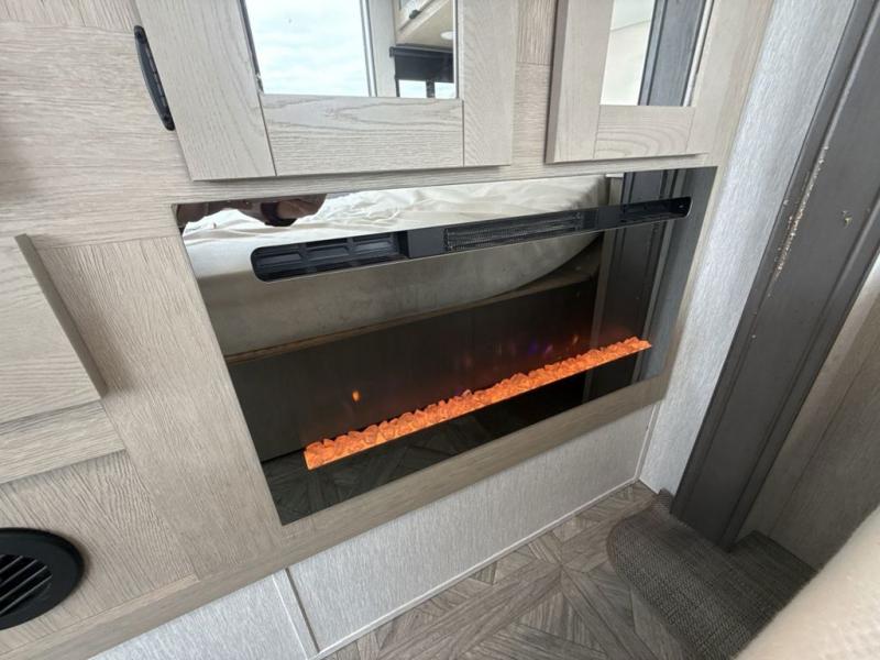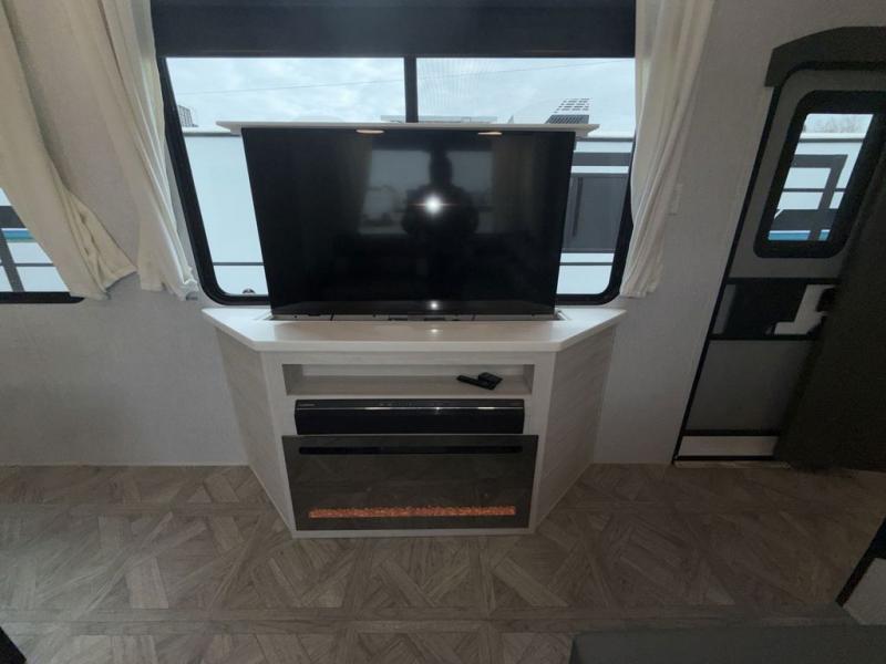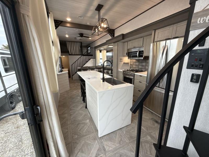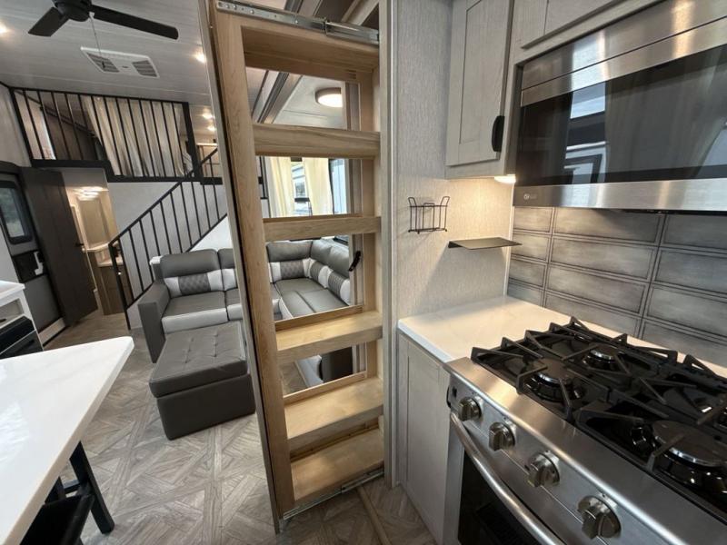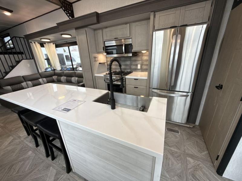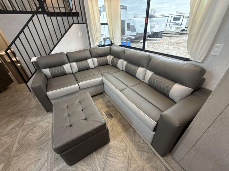 You will feel like you are home when you step inside! Not only will you be impressed with the super large slide in the main combined kitchen and living area, but check out the island with five counter height seats! The main entry closest to the front features a step up to a private bedroom featuring a custom king bed with Versa-Tilt within a slide, plus a fireplace, wardrobe, and drawers for your belongings. Just outside this door, a half bath around the corner and a spiral staircase to the front loft with two 42" x 74" bunk mats above. The kitchen is fully equipped for you to provide the best home cooked meals with a roll-out pantry, range and microwave, plus side-by-side refrigerator all part of the large slide that also houses an L-shaped sectional sofa with ottoman so everyone can have a seat! Opposite the sectional find an entertainment center with pop-up TV and fireplace. A second set of stairs leads up to the rear loft featuring a 62" x 74" Versa Queen mattress and dresser. Back down in the very back of the unit a large bathroom with walk-in shower, linen cabinet, toilet, and vanity with sink. There is also a space that has washer/dryer prep to add even more convenience. Outside, a 26' awning for outdoor living, and double entry doors to make it easy to move in and out.