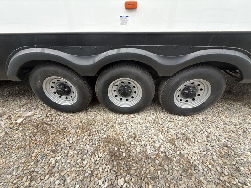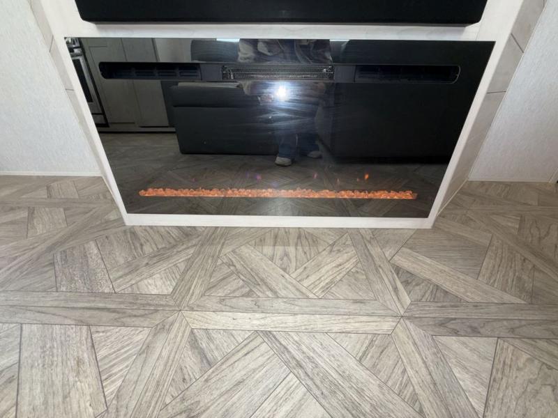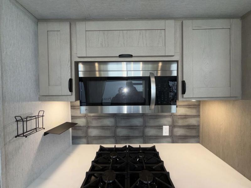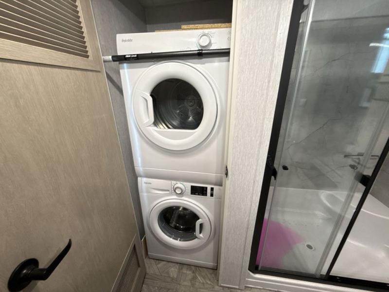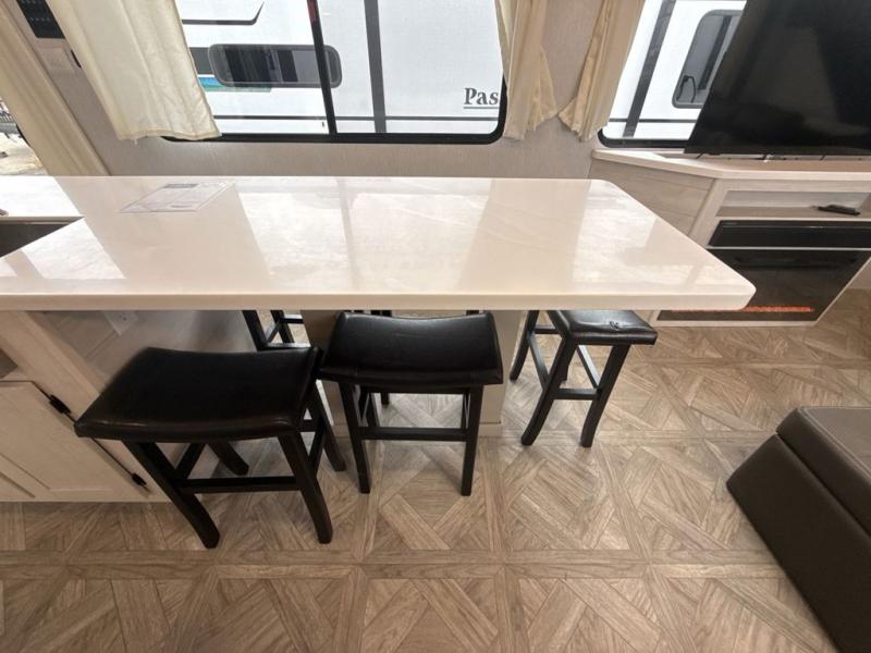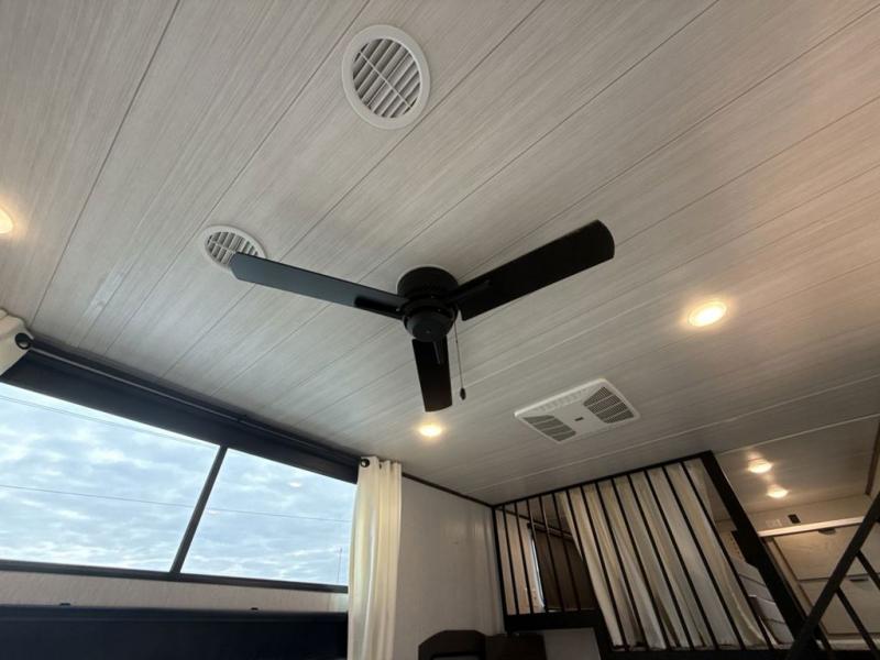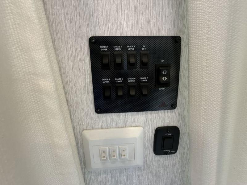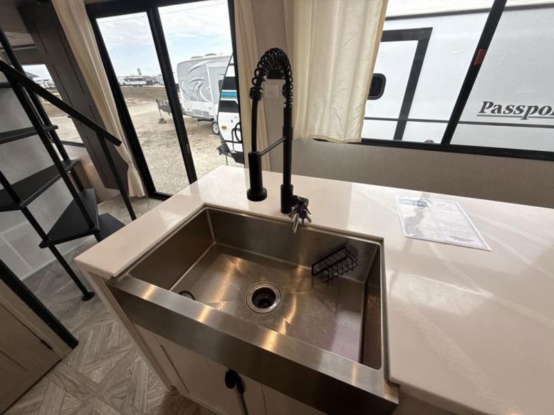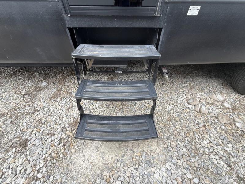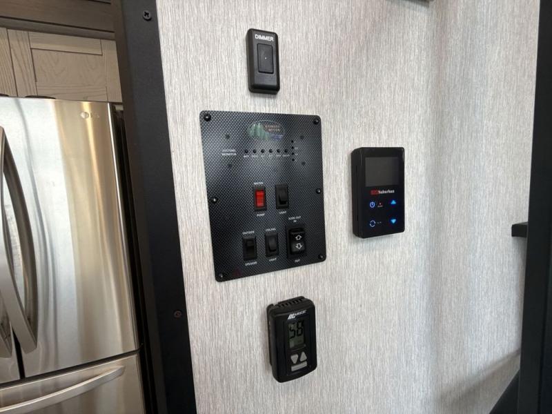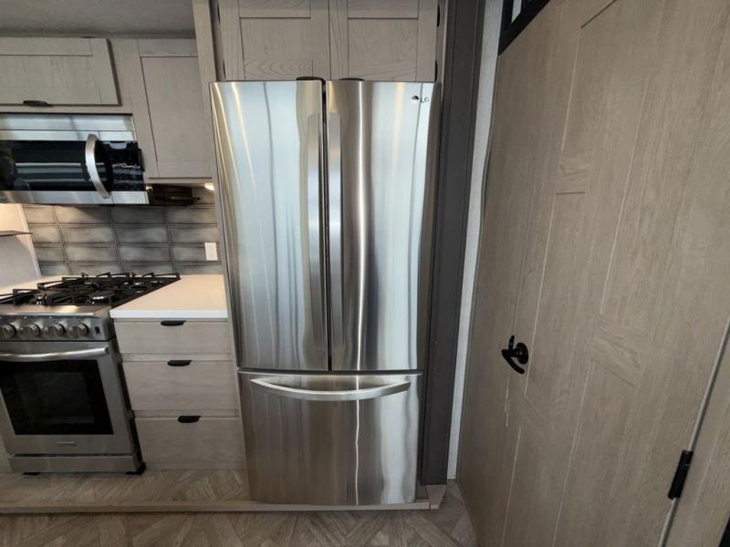 You will feel like you are home when you step inside! Not only will you be impressed with the super large slide in the main combined kitchen and living area, but check out the island with five counter height seats! The main entry closest to the front features a step up to a private bedroom featuring a custom king bed with Versa-Tilt within a slide, plus a fireplace, wardrobe, and drawers for your belongings. Just outside this door, a half bath around the corner and a spiral staircase to the front loft with two 42" x 74" bunk mats above. The kitchen is fully equipped for you to provide the best home cooked meals with a roll-out pantry, range and microwave, plus side-by-side refrigerator all part of the large slide that also houses an L-shaped sectional sofa with ottoman so everyone can have a seat! Opposite the sectional find an entertainment center with pop-up TV and fireplace. A second set of stairs leads up to the rear loft featuring a 62" x 74" Versa Queen mattress and dresser. Back down in the very back of the unit a large bathroom with walk-in shower, linen cabinet, toilet, and vanity with sink. There is also a space that has washer/dryer prep to add even more convenience. Outside, a 26' awning for outdoor living, and double entry doors to make it easy to move in and out.