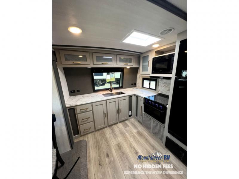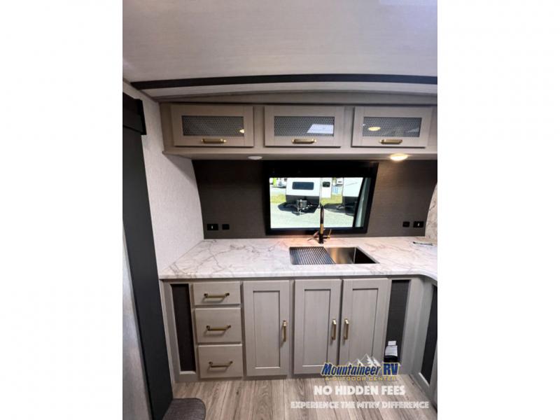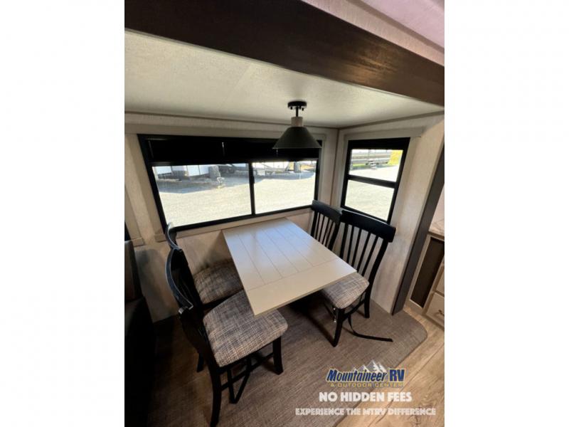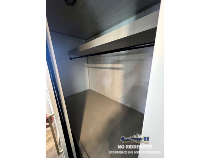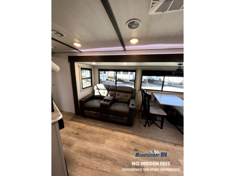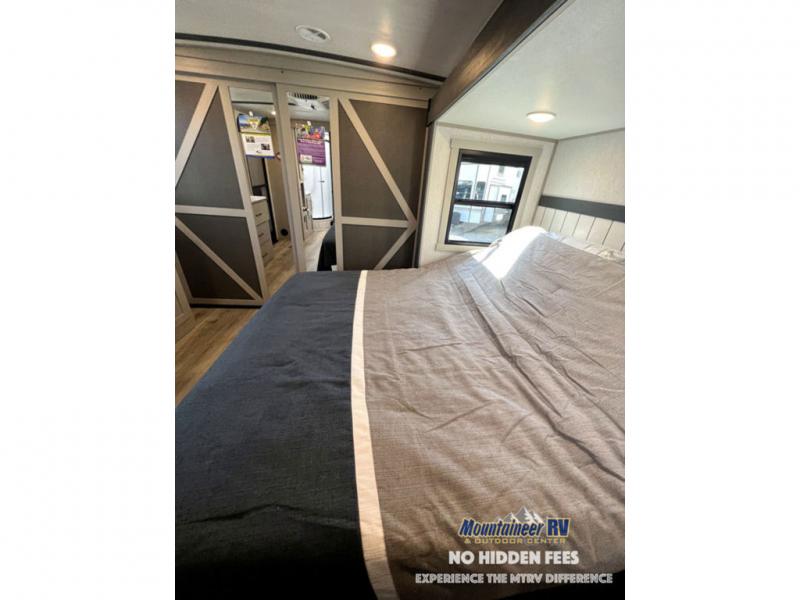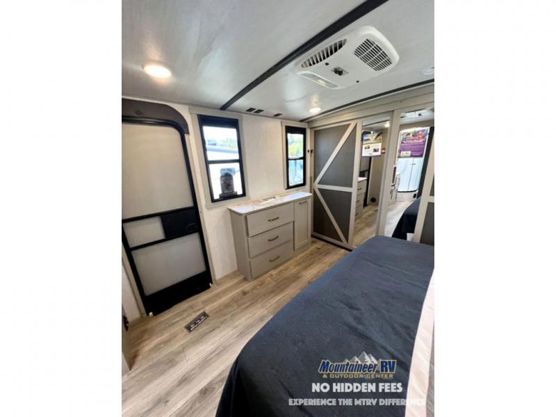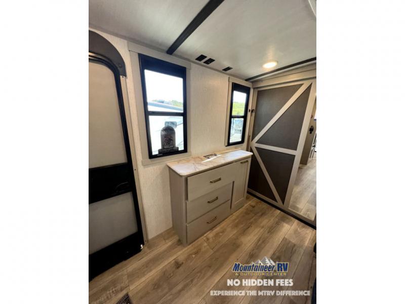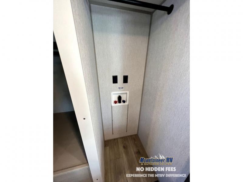 Once you step inside this dual entry travel trailer, you won't want to camp any other way! The rear private bedroom will have you feeling right at home with the custom king bed across from a dresser with a TV hookup, a large bedroom wardrobe, and there is even a closet with washer/dryer prep. The dual entry bath makes it easy for everyone to access and it has a radius shower with a skylight above for added natural lighting as you get ready each morning. Both the theater seating and the booth dinette have a panoramic window for you to look out at your beautiful scenery. The chef of the group will love cooking in the front kitchen with all of the extra countertop space, as well as outdoors with the outside kitchen/bar!