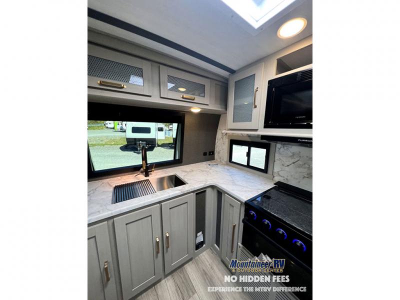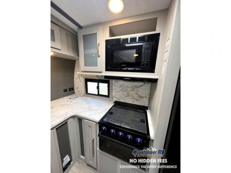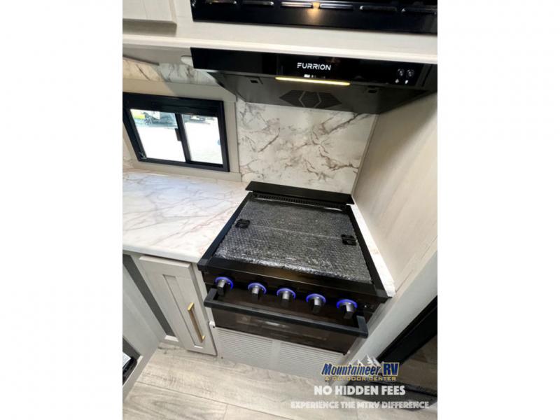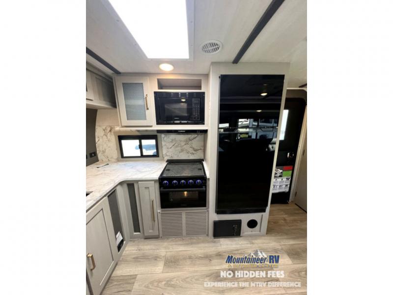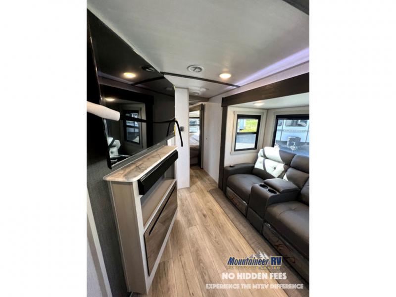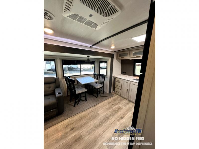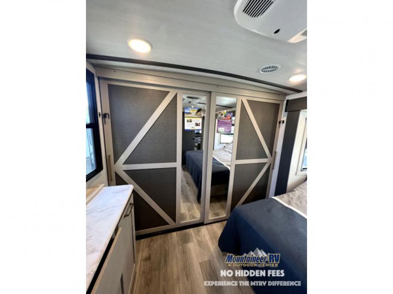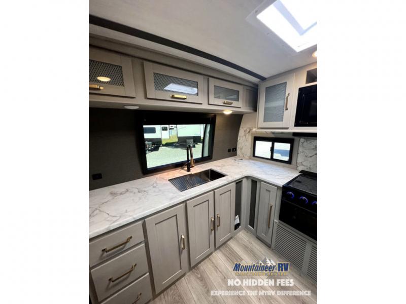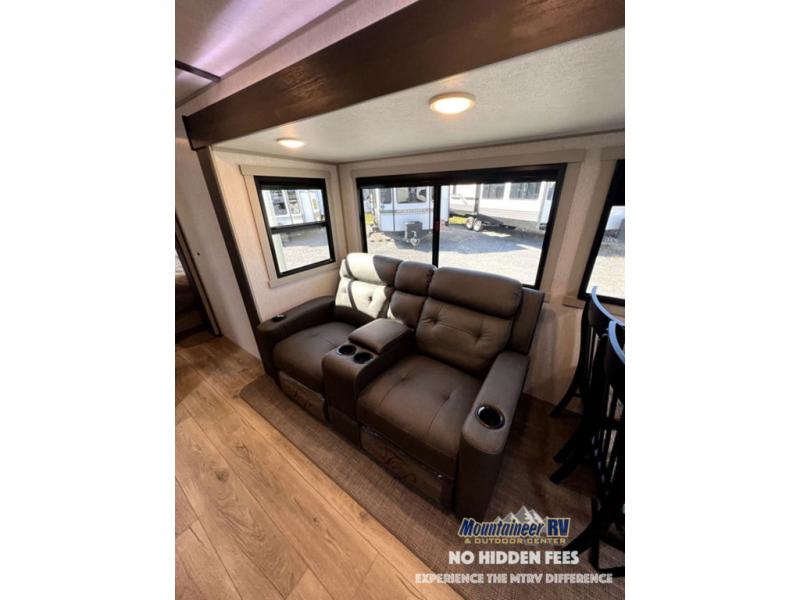 Once you step inside this dual entry travel trailer, you won't want to camp any other way! The rear private bedroom will have you feeling right at home with the custom king bed across from a dresser with a TV hookup, a large bedroom wardrobe, and there is even a closet with washer/dryer prep. The dual entry bath makes it easy for everyone to access and it has a radius shower with a skylight above for added natural lighting as you get ready each morning. Both the theater seating and the booth dinette have a panoramic window for you to look out at your beautiful scenery. The chef of the group will love cooking in the front kitchen with all of the extra countertop space, as well as outdoors with the outside kitchen/bar!