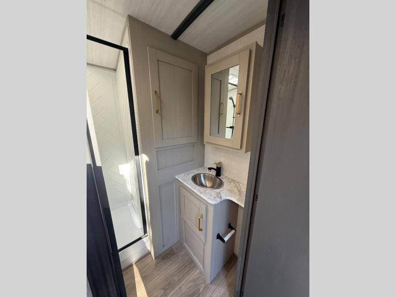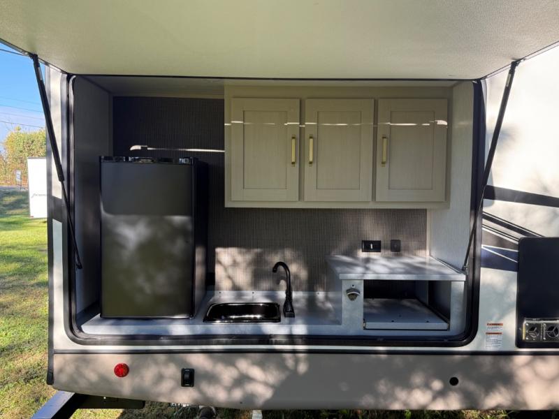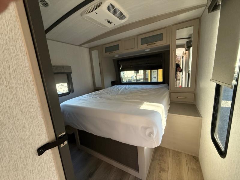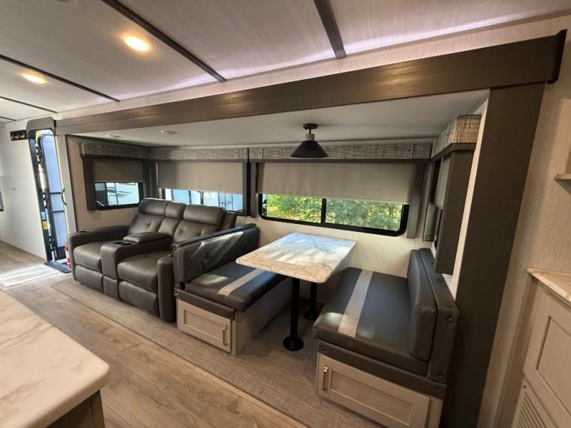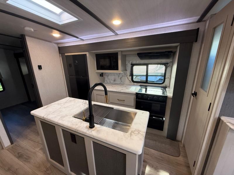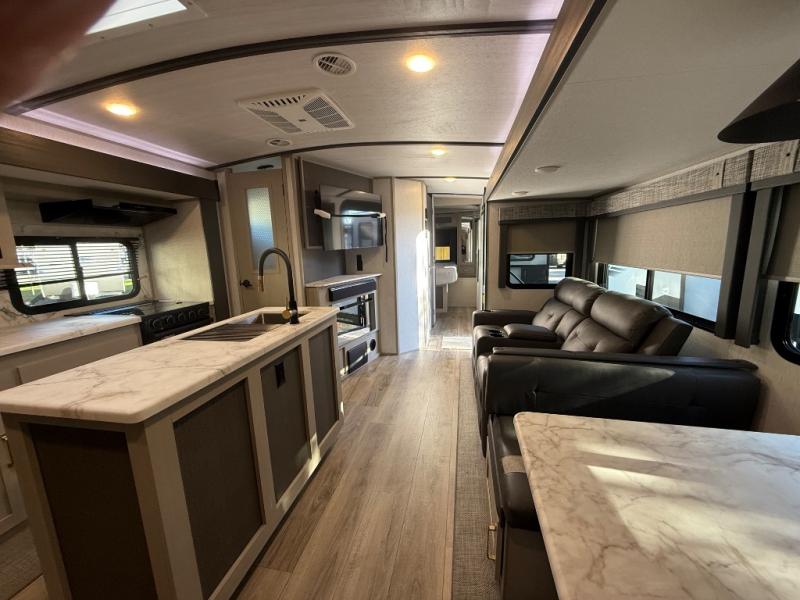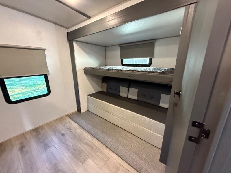 Your kids or friends are going to love camping in this travel trailer! It features a rear private bunkhouse with a bunk above a Versa queen convertible bed/sofa plus an additional bunk above an entertainment center with storage below. Just outside the bunkhouse is the kitchen with a 10 cu. ft. 12V black refrigerator, a microwave, a kitchen island, and a chef-sized walk-in pantry big enough to store everyone's favorite snacks. The booth dinette and the theatre seating are right next to panoramic windows so you can enjoy looking out at your beautiful scenery. You will also love taking a hot, steamy shower in the 30" x 36" shower with skylights and get a good night's rest on the queen bed with Versa Tilt in the front private bedroom!
