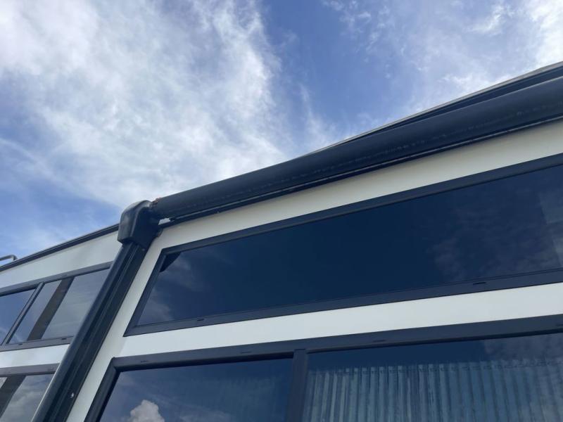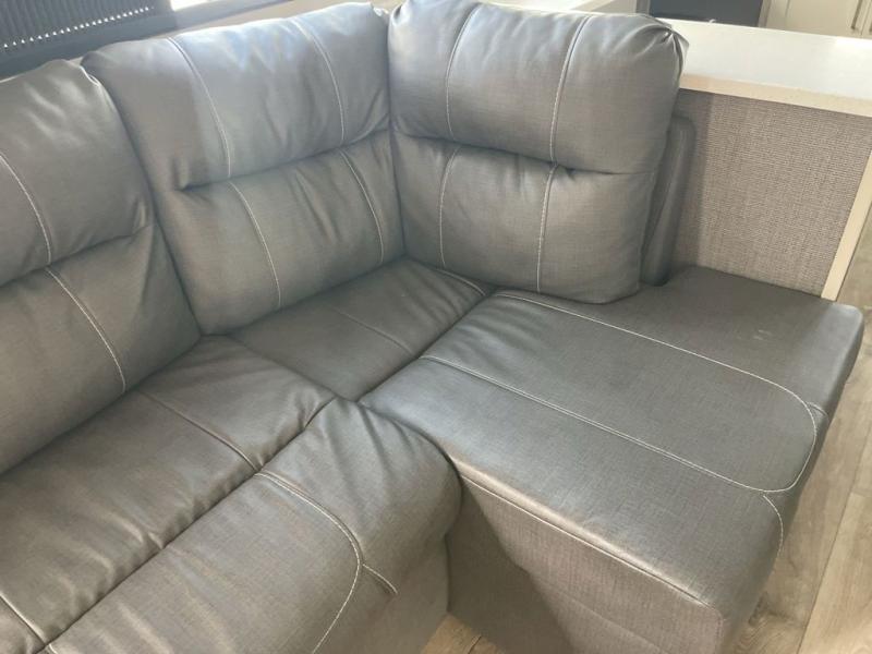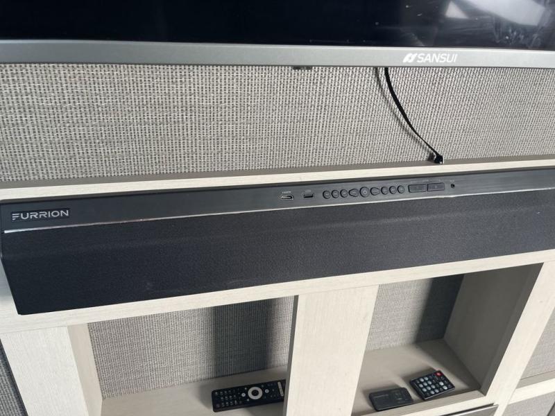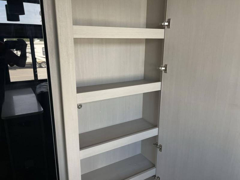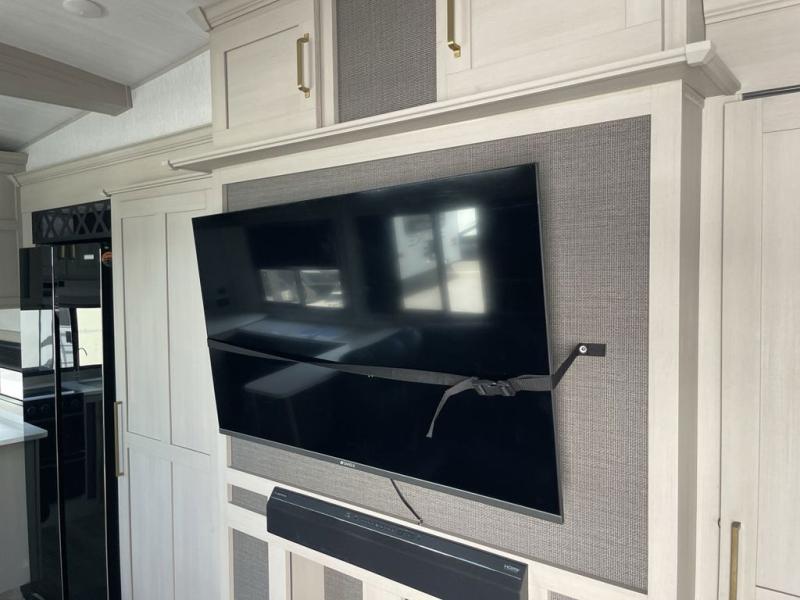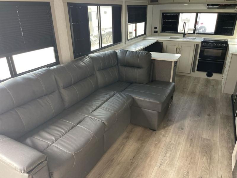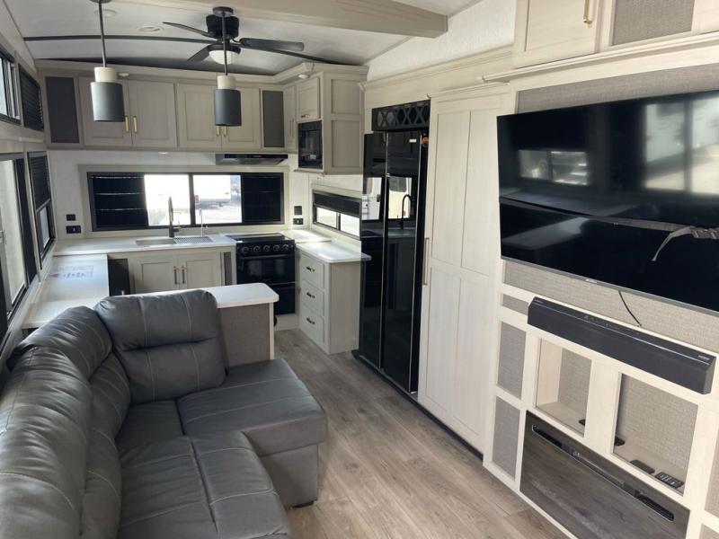 You'll be viewing this fifth wheel with eyes wide open from all of the stand-out features! The chef of your group won't be the only one to love the rear kitchen since it includes wrap-around countertops with four bar stools and panoramic windows for the best outdoor views. The 16' electric awning with LED lights will provide shade during the day, and the XL Texas-size pass-through can hold fishing gear, camp chairs, and more! Once you've entered the unit, you'll find the sectional sofa across from the large slide out with a hidden bunk room behind! There is a pocket door with storage, a dresser, bunk beds, and shelves for even more storage; how convenient! Head to the front private bedroom after a day of fun where you'll sleep soundly on the custom king bed with Versa-Tilt, a dresser with a bench beside it, plus a walk-in closet with shelves and washer/dryer prep!