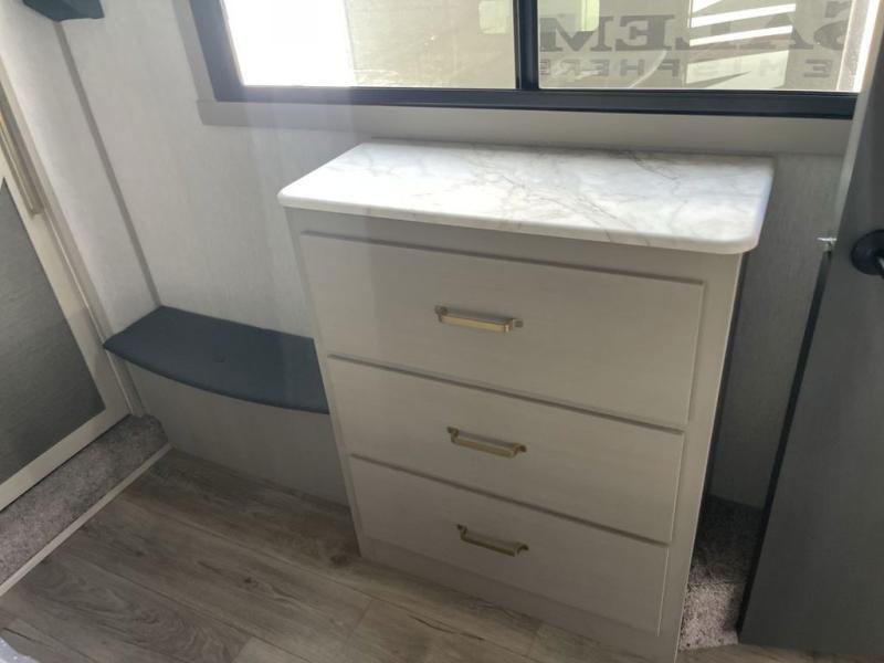 With each Forest River Salem Hemisphere fifth wheel and travel trailer, there are vacuum bonded "Aluma Frame" sidewalls and floors and square windows with built-in shades with reflecting thermal-foil backing and painted hardwood trim. You'll also find Goodyear radial tires with black accented rims and a 60K BTU on-demand tankless water heater for hassle-free camping. The 15K BTU Quiet Cool A/C on a Race Track duct system will keep you comfortable all summer long, and the LED TV and Furrion soundbar with FM/Bluetooth/HDMI/USB will keep you entertained on rainy days. You'll find many comforts inside, along with ample storage space for your belongings and gear, full bath and kitchen amenities, plus comfortable seating and sleeping spaces!