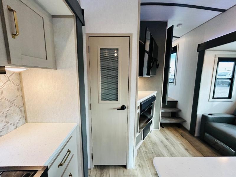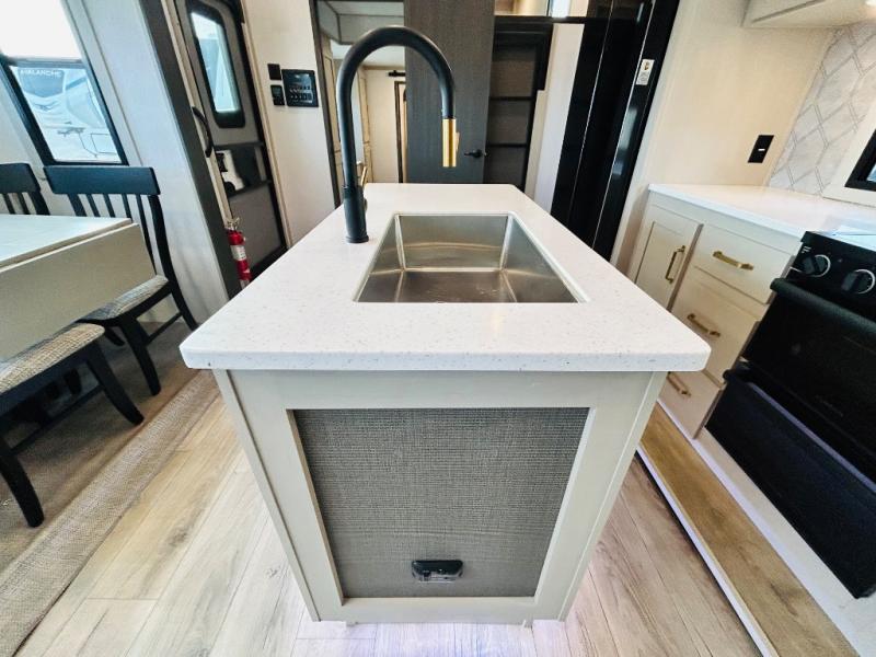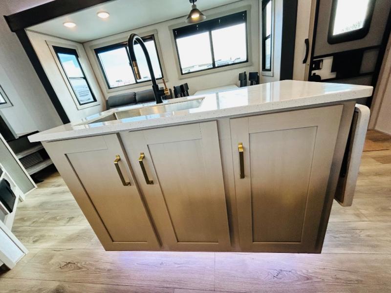 It's easy to see why this fifth wheel is named 375FAM; it's for the whole family or group of friends! There are two private bedrooms, two full baths, a loft, and four slides for tons of space! The front bedroom includes a custom king bed with Versa Tilt, a dresser with a bench beside it, plus a walk-in closet with shelves and washer/dryer prep! Head to the rear master bedroom to find a custom queen bed, dual wardrobes, plus a rear bath with the second entry door! The loft above this room includes two bunk mats and storage for your guests' things, or you can utilize this space for storage if you don't have extra campers tag along. Everyone can meet in the main living area/kitchen that includes table and chairs, theater seating, a spacious kitchen island with an extension, plus an entertainment center with a fireplace. There is also a 16 cu. ft. 12V refrigerator and walk-in pantry for food storage galore!