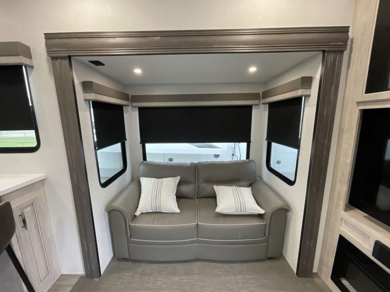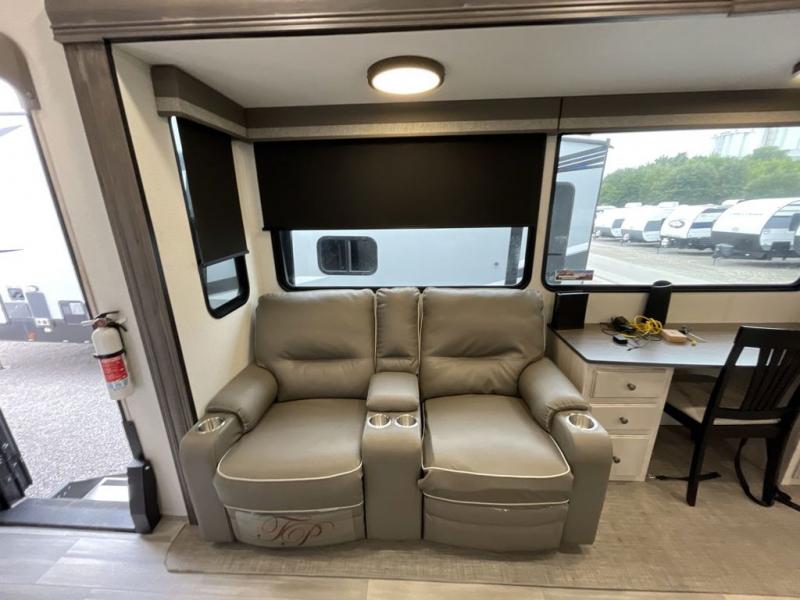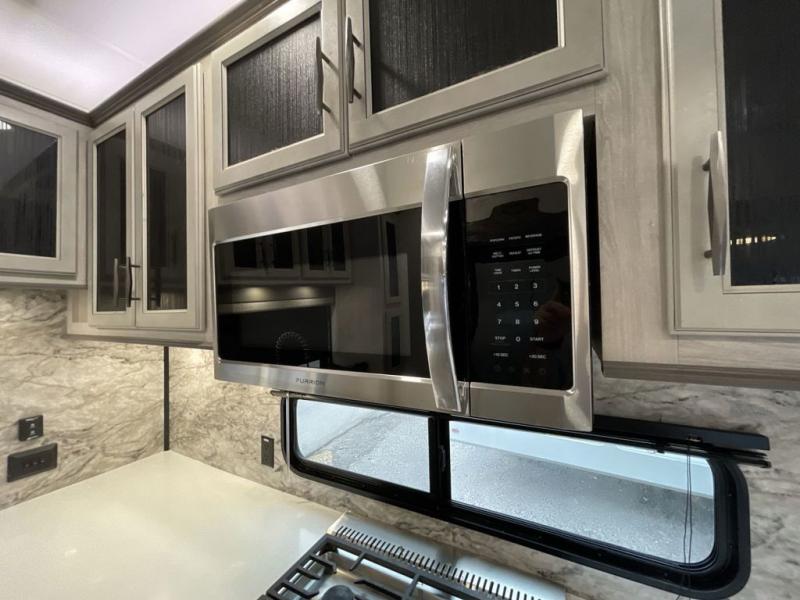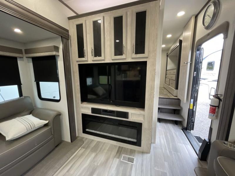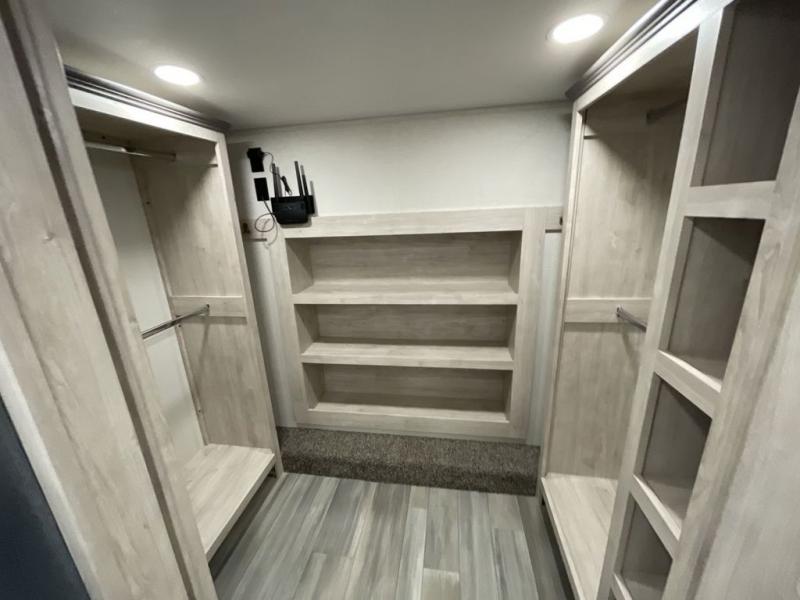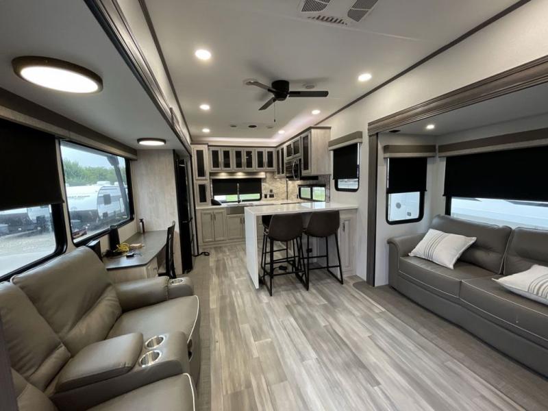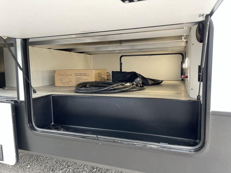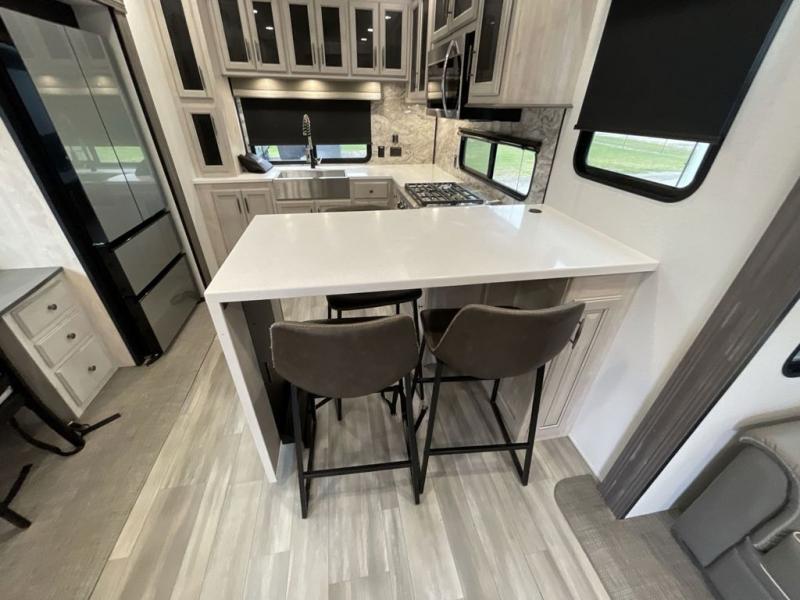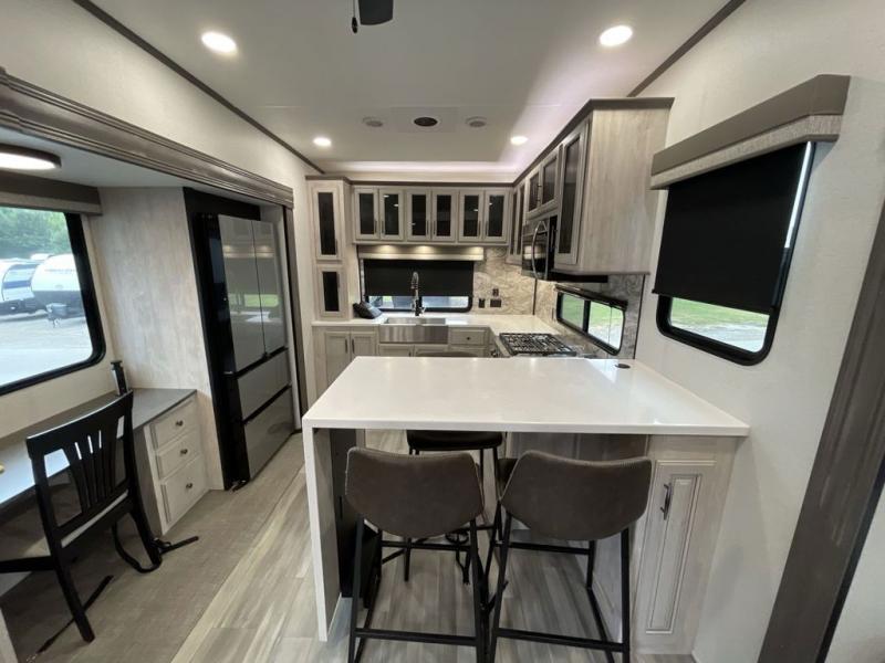 If you're looking to go full-time RVing, this fifth wheel is packed with convenient features! The master bedroom includes a king bed slide out with USB ports on either side of the bed so you both can charge your phones, and there is a dresser for your folded clothes. You will love the front bathroom with dual bath sinks, a shower with a seat, plus a walk-in closet with shelves, rods to hand clothes, and baskets for laundry! There is a unique middle utility room with washer and dryer prep and a rod to hang clothes that will make a perfect laundry room, or you can utilize this space for storage! Head to the main living area to relax on the theater seating or hide-a-bed sofa, and if you have guests stay over, they can sleep here. There is also an entertainment center with a 50" flat screen TV, but you might just leave that off if you're working at the desk with a chair that is provided. We've saved the best part for last; the kitchen! Here, you'll find ample counter space to prep home-cooked meals, a three burner high output range with a 22" oven, plus a large counter with barstools where you can enjoy breakfast at each morning. Choosing this fifth wheel is a no-brainer!