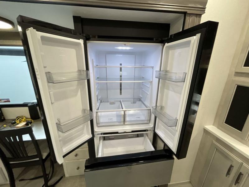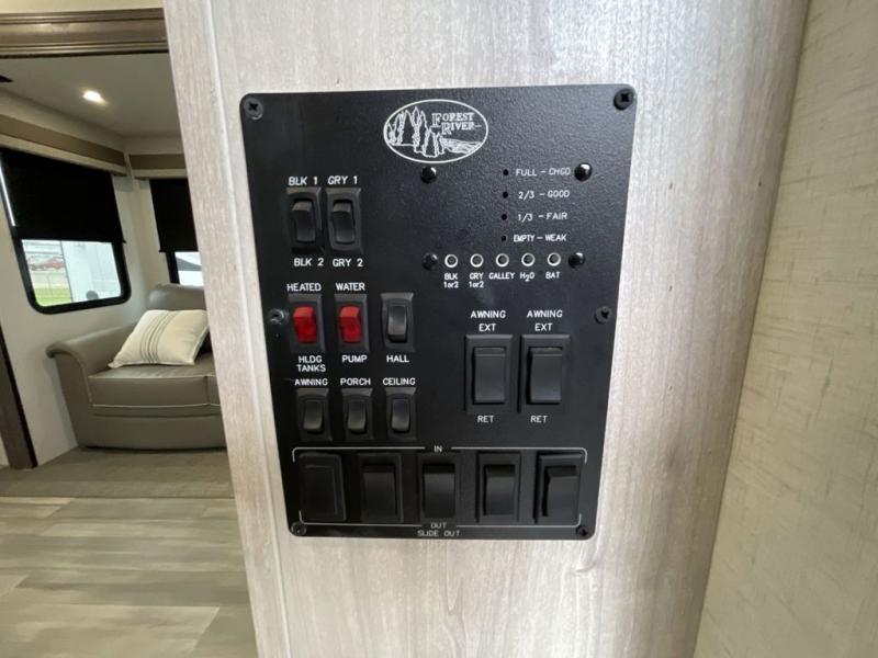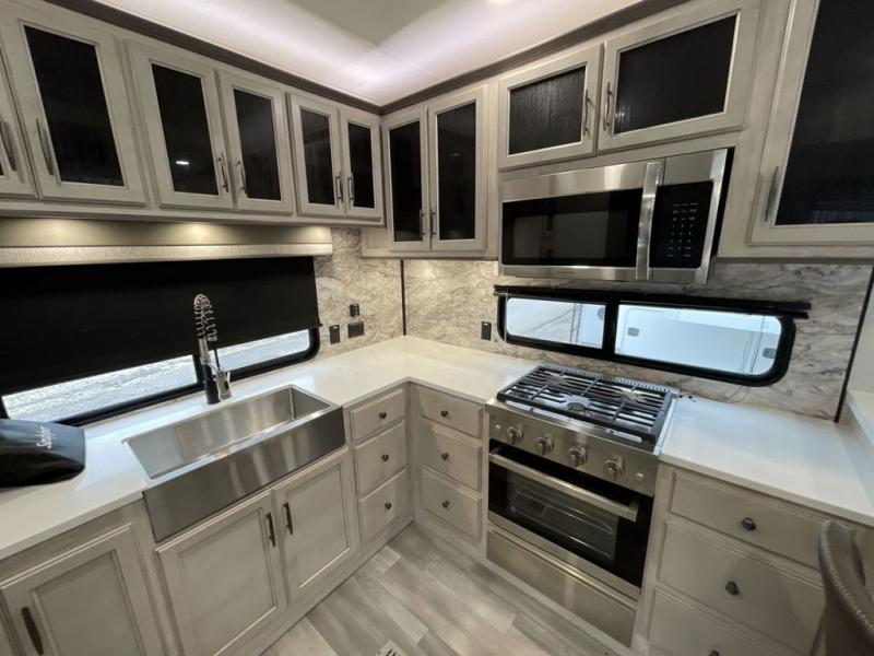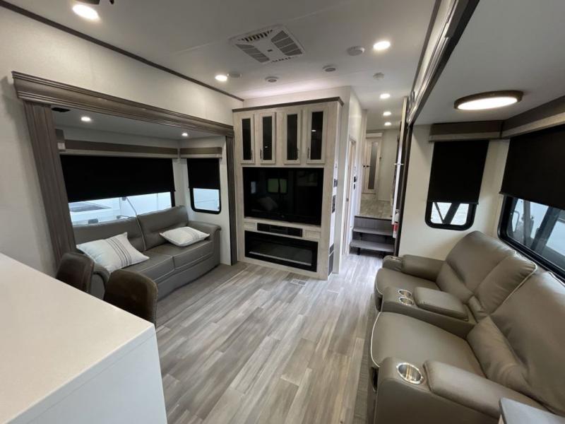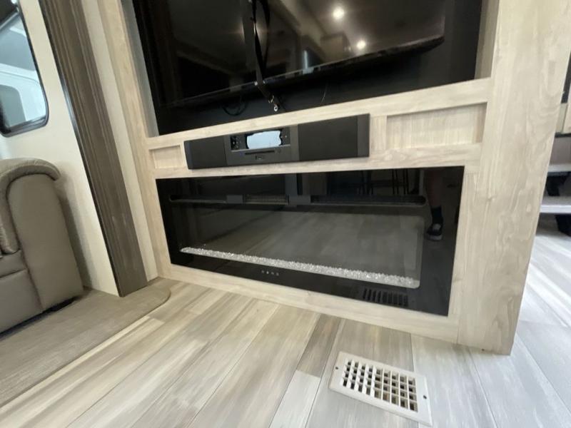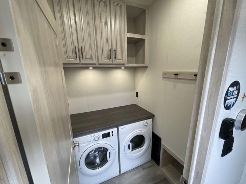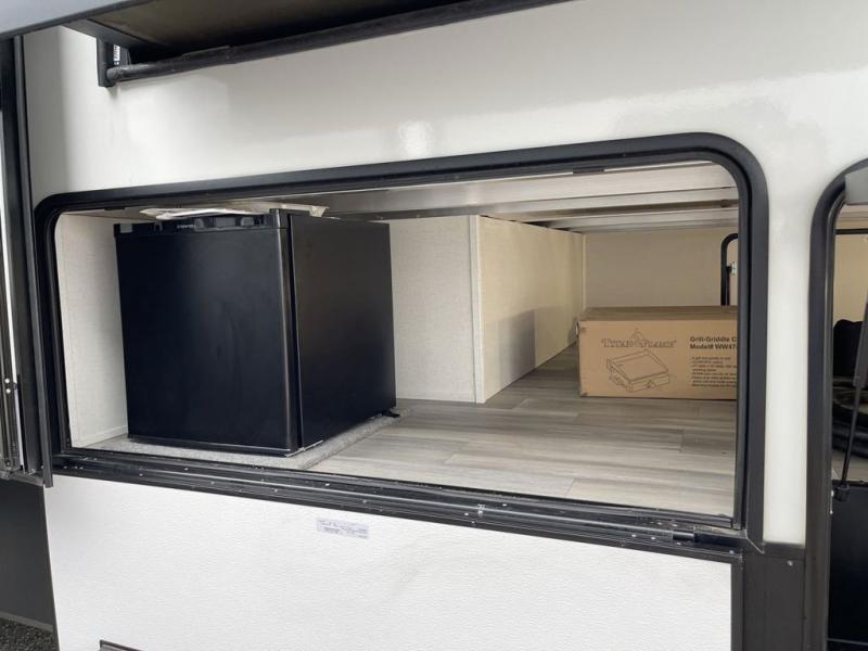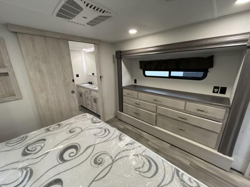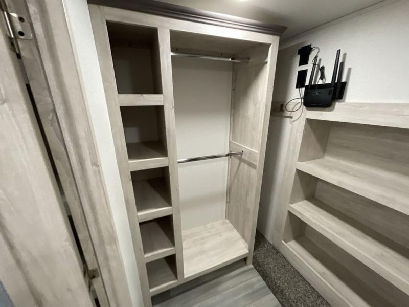 If you're looking to go full-time RVing, this fifth wheel is packed with convenient features! The master bedroom includes a king bed slide out with USB ports on either side of the bed so you both can charge your phones, and there is a dresser for your folded clothes. You will love the front bathroom with dual bath sinks, a shower with a seat, plus a walk-in closet with shelves, rods to hand clothes, and baskets for laundry! There is a unique middle utility room with washer and dryer prep and a rod to hang clothes that will make a perfect laundry room, or you can utilize this space for storage! Head to the main living area to relax on the theater seating or hide-a-bed sofa, and if you have guests stay over, they can sleep here. There is also an entertainment center with a 50" flat screen TV, but you might just leave that off if you're working at the desk with a chair that is provided. We've saved the best part for last; the kitchen! Here, you'll find ample counter space to prep home-cooked meals, a three burner high output range with a 22" oven, plus a large counter with barstools where you can enjoy breakfast at each morning. Choosing this fifth wheel is a no-brainer!