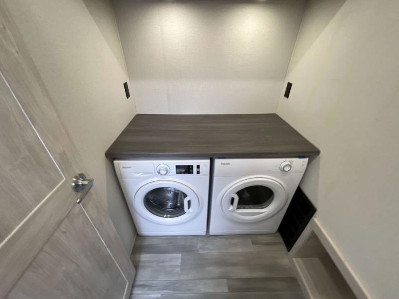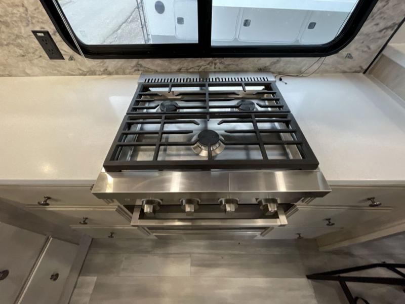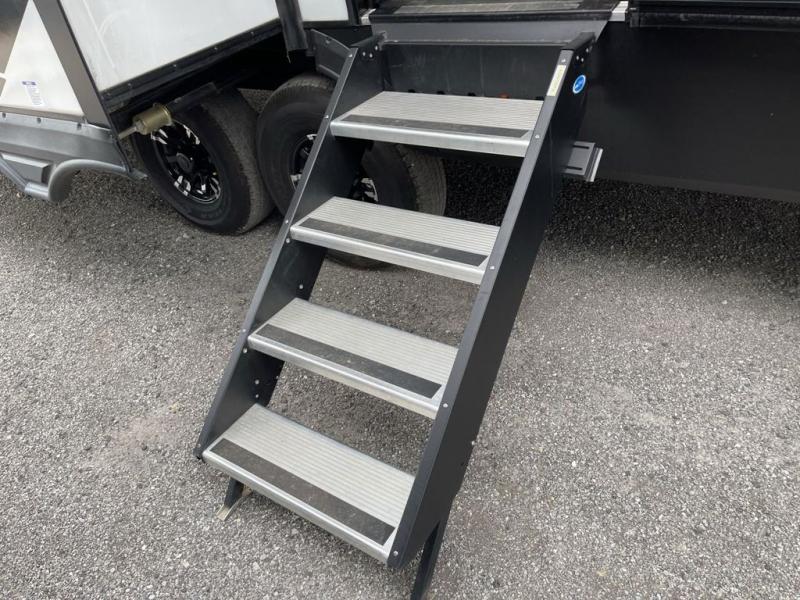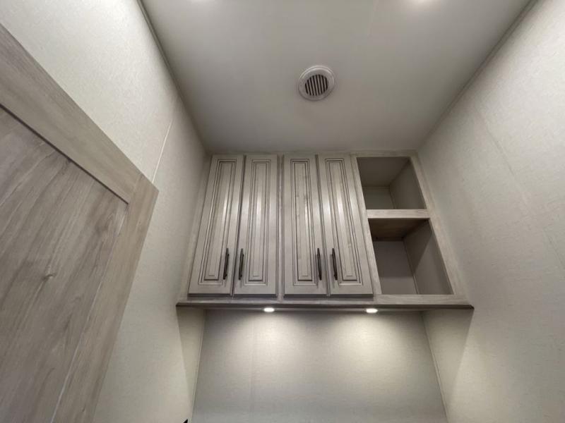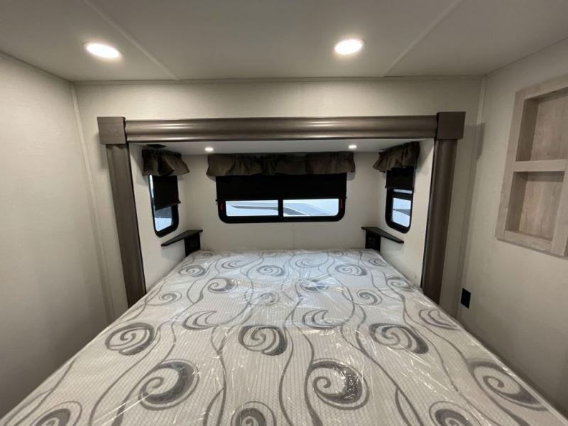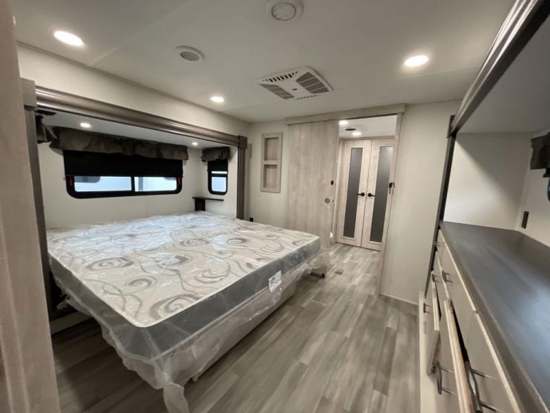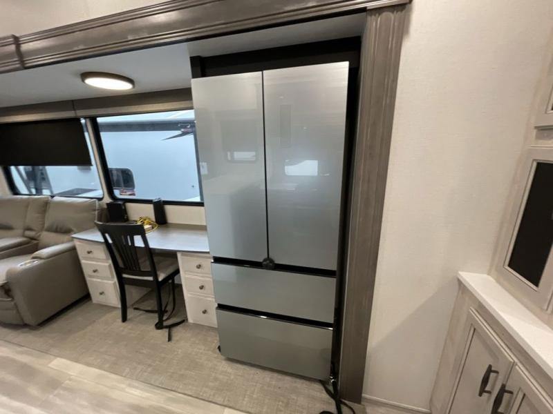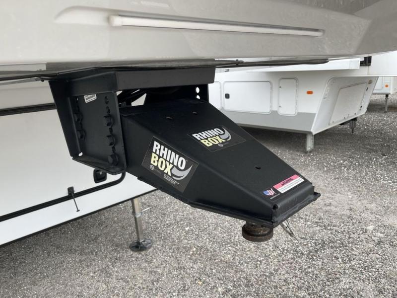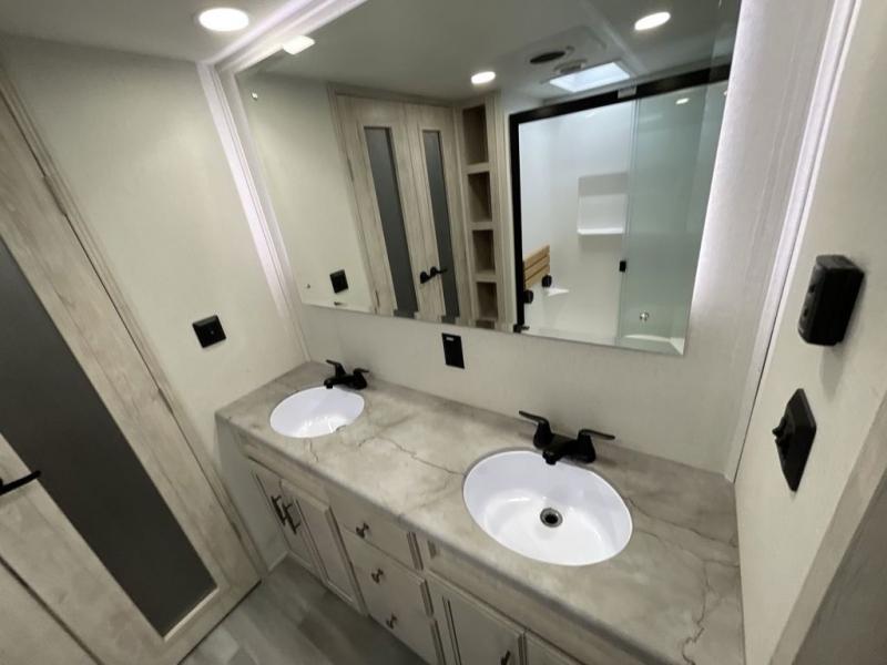If you're looking to go full-time RVing, this fifth wheel is packed with convenient features! The master bedroom includes a king bed slide out with USB ports on either side of the bed so you both can charge your phones, and there is a dresser for your folded clothes. You will love the front bathroom with dual bath sinks, a shower with a seat, plus a walk-in closet with shelves, rods to hand clothes, and baskets for laundry! There is a unique middle utility room with washer and dryer prep and a rod to hang clothes that will make a perfect laundry room, or you can utilize this space for storage! Head to the main living area to relax on the theater seating or hide-a-bed sofa, and if you have guests stay over, they can sleep here. There is also an entertainment center with a 50" flat screen TV, but you might just leave that off if you're working at the desk with a chair that is provided. We've saved the best part for last; the kitchen! Here, you'll find ample counter space to prep home-cooked meals, a three burner high output range with a 22" oven, plus a large counter with barstools where you can enjoy breakfast at each morning. Choosing this fifth wheel is a no-brainer!