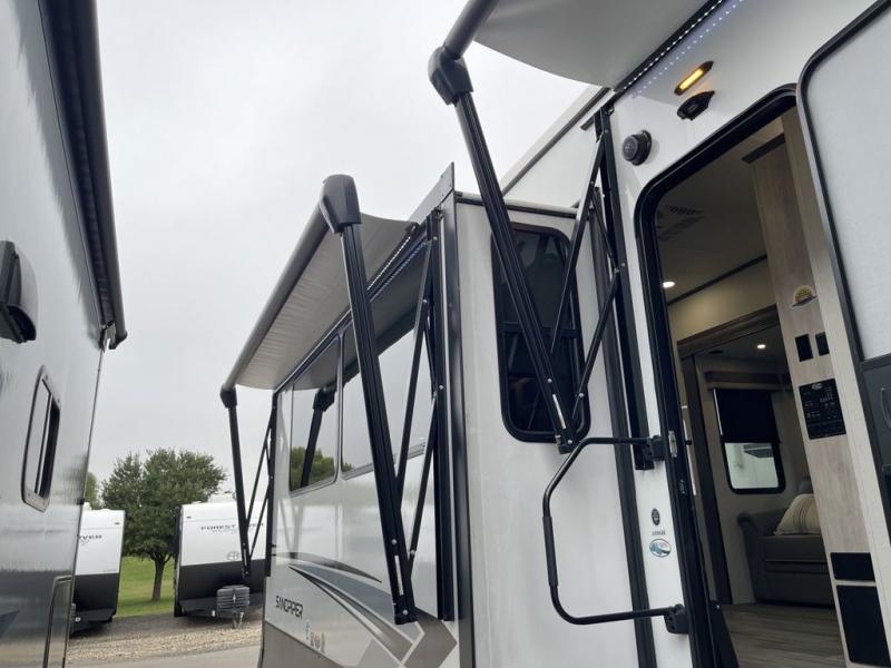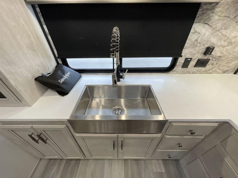 You will find the perfect balance of size, space, features, and luxury with any one of these Forest River Sandpiper fifth wheels! They are constructed with a welded aluminum framed vacuum bonded laminated superstructure, a cambered powder coated frame with rust prohibitor, and a fully enclosed underbelly to protect the units vitals during any season. The large tinted windows come with a 80/20 UV prohibitor or you can choose the optional dual pane windows. Some hassle-free amenities include a 60k BTU on-demand water heater, full coach water filter system, tire pressure monitor system, and an electric leveling system! Inside, you'll enjoy stainless steel appliances, solid surface countertops, upgraded raised panel cabinet doors, and rustic wood plank linoleum to name a few comforts!