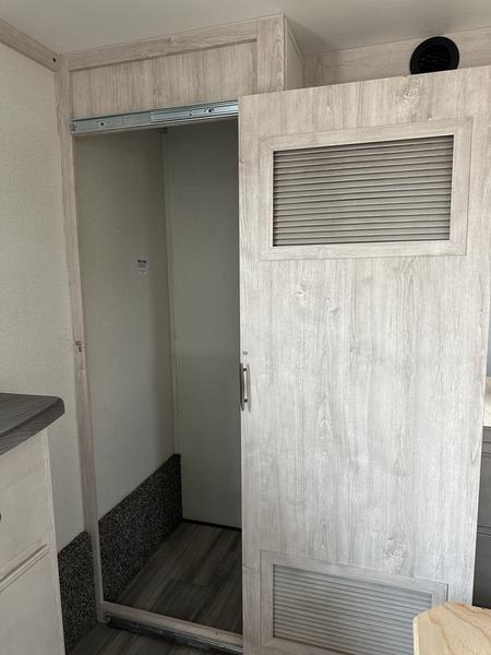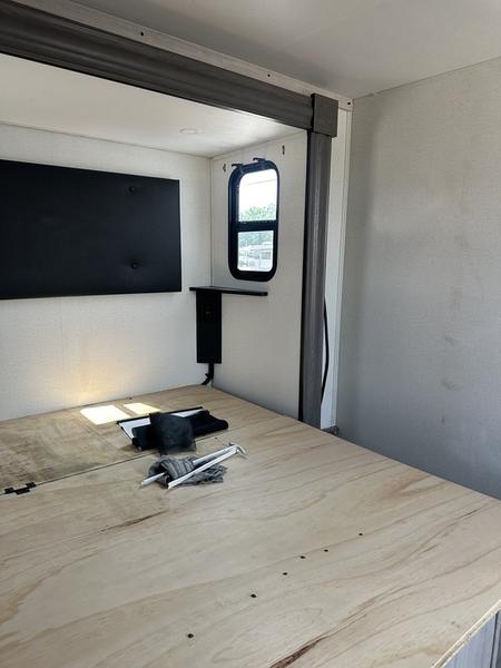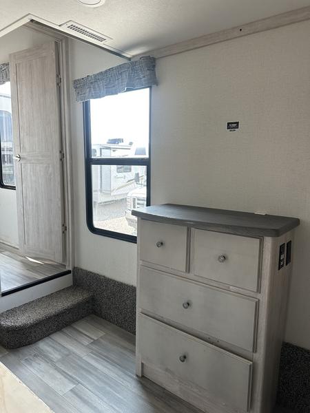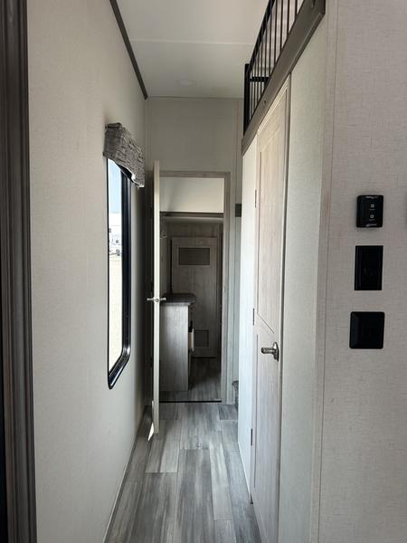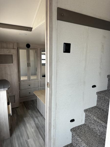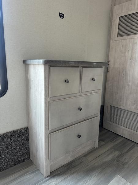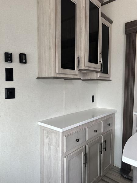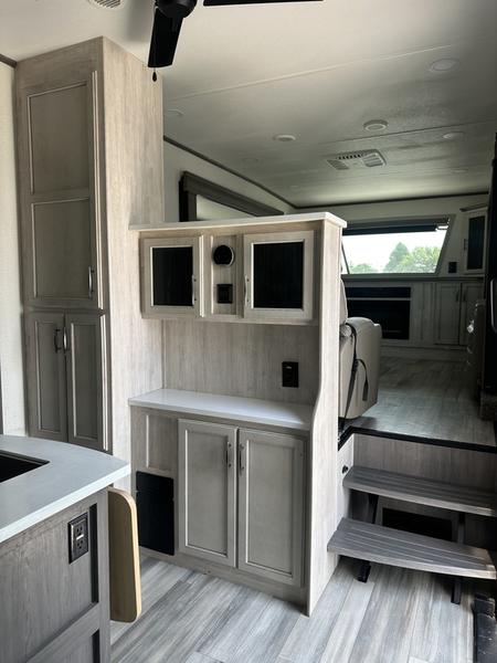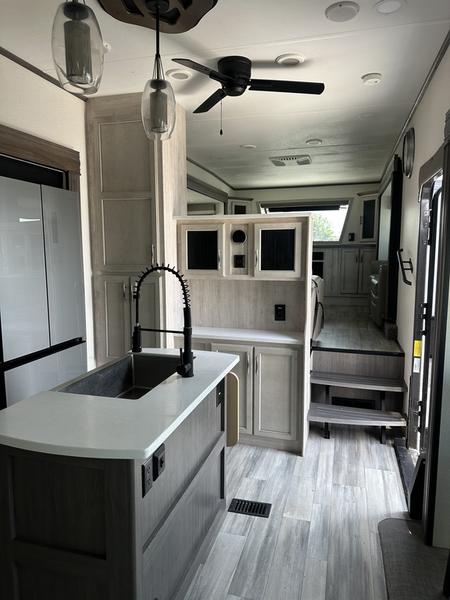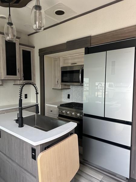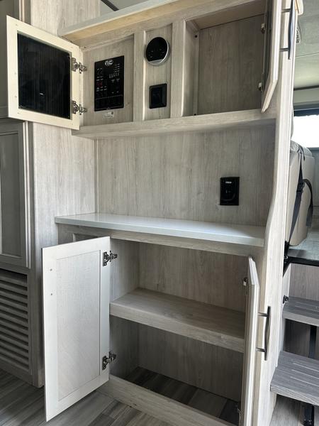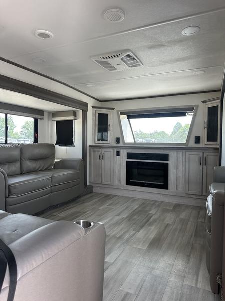 Wow! Check out this fifth wheel with a full loft for the little ones, plus a half loft that can become a play room/storage room. The main floor includes five slides for maximum space, a front living area with dual hide-a-bed sofas, plus an entertainment center with a 50" flat screen TV for movie nights! Once your guests have converted the living room to their bedroom at night, you can take the rear private bedroom. There is a king bed slide out here, plus a wardrobe, plus a closet with washer and dryer prep for full-time living. The full bath is easily accessible for everyone, and the middle kitchen will be a favorite with the chef of your group. Here, you'll find a 17 cu. ft. 12V refrigerator, an island, tons of counter space, plus a hutch to display nice dishes, and a pantry for dry goods. Don't let this fifth wheel slip away!