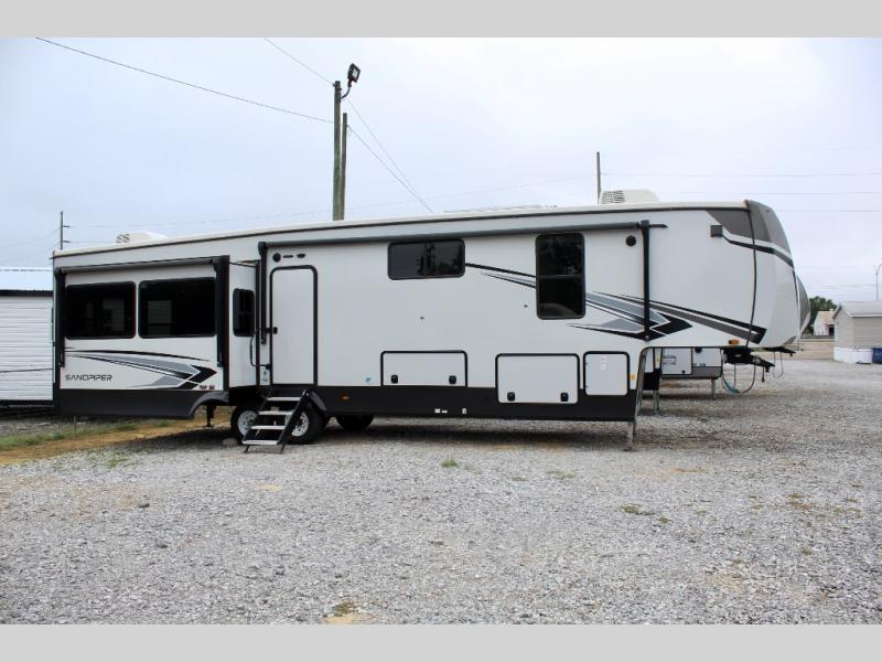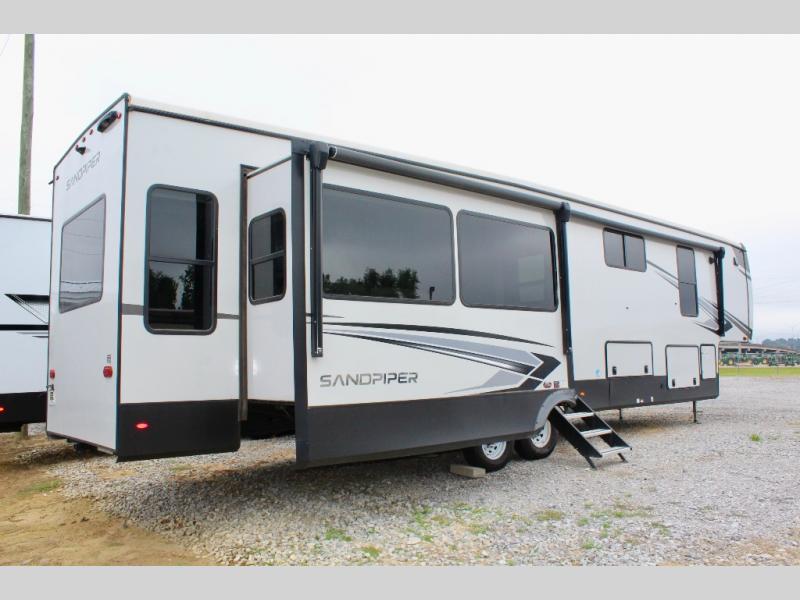 You will find the perfect balance of size, space, features, and luxury with any one of these Forest River Sandpiper fifth wheels! They are constructed with a welded aluminum framed vacuum bonded laminated superstructure, a cambered powder coated frame with rust prohibitor, and a fully enclosed underbelly to protect the units vitals during any season. The large tinted windows come with a 80/20 UV prohibitor and the unobstructed pass-through storage area is big enough to store all of your outdoor gear. You will be able to see clearly even outside at night with the porch light that has an interior switch and the electric awning with an LED light strip. The interiors are designed with modern décor, rustic wood plank linoleum, and stainless steel appliances. Don't pass up your chance to camp in true luxury, come find your model today!