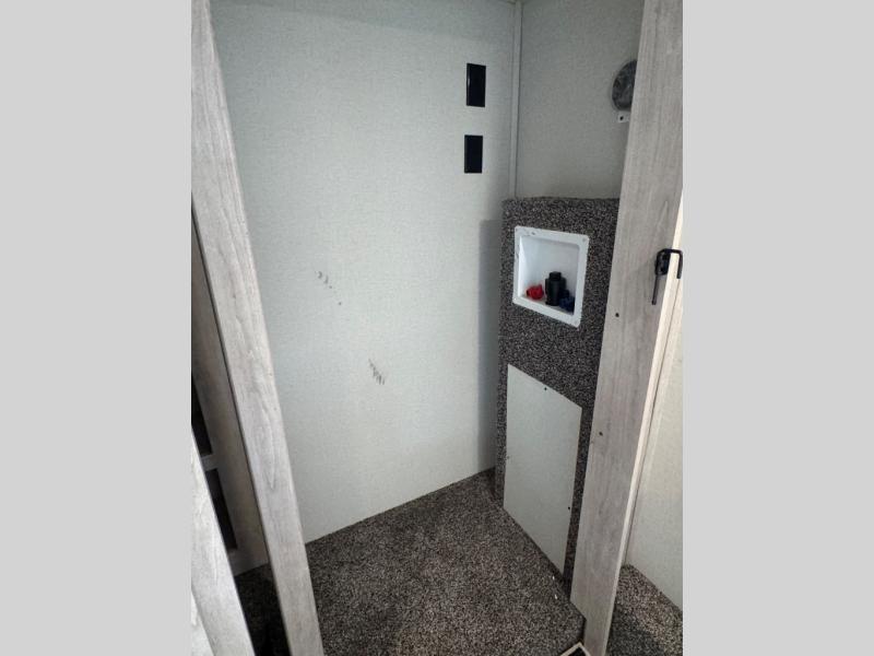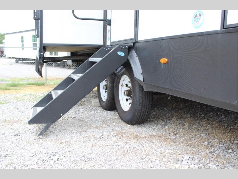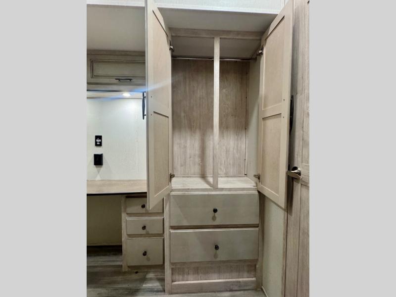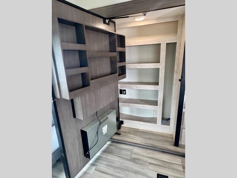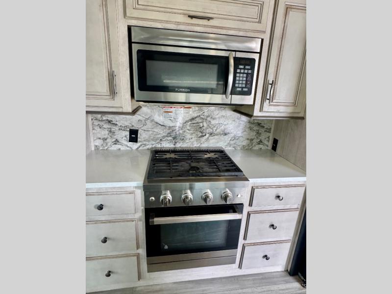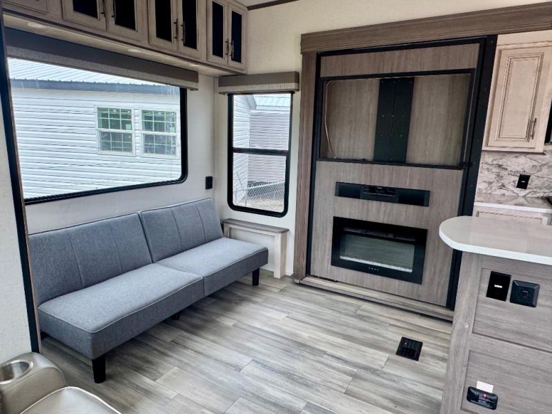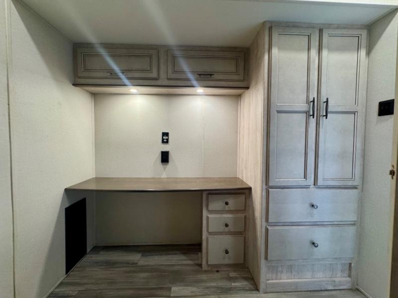 Pick your favorite camping spot and head out for relaxing weekends in this four slide out fifth wheel! You will feel at home in the front private bedroom with its king bed slide out, large front wardrobe with shelves, plus washer and dryer prep if you plan to go full-time. Your guests can make their beds in the middle bunkroom that includes a hide-a-bed sofa with a bunk above, plus a desk if you choose to make this room an office. There is even a loft above this room for more sleeping or storage space. Everyone will love to meet in the middle living area that includes a rear hide-a-bed sofa, theater seating across from the entertainment center, and a free-standing table and chairs for dining. And the chef will enjoy having a kitchen island for more prep space, along with a 17 cu. ft. 12V refrigerator and a three burner high output range with a 22" oven. Don't overlook the exterior with an outside kitchen, 20' power awning, and pass-through storage!