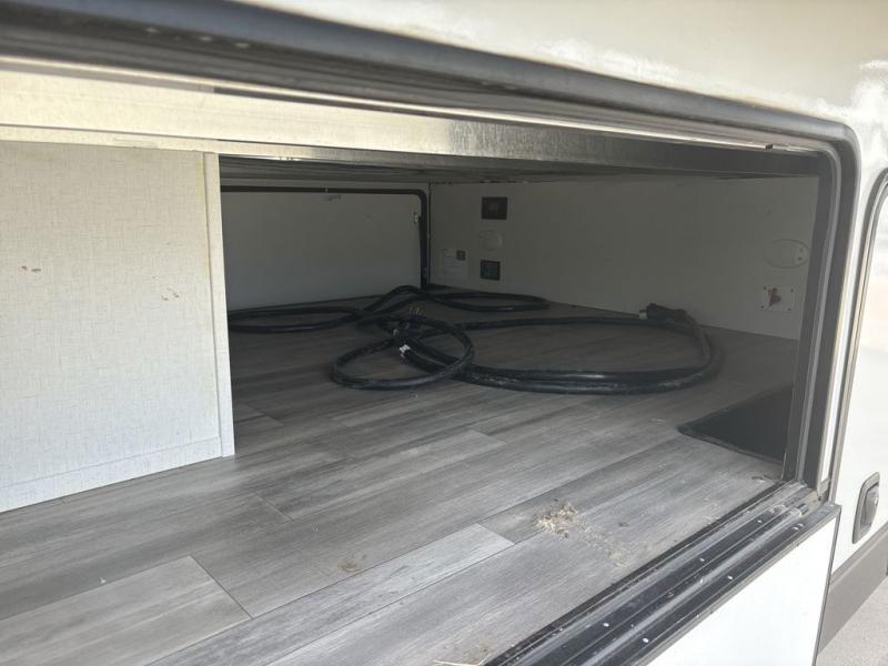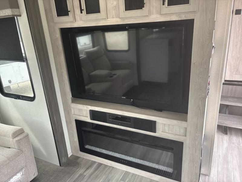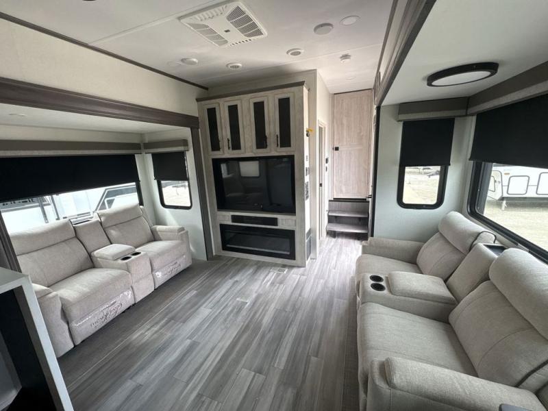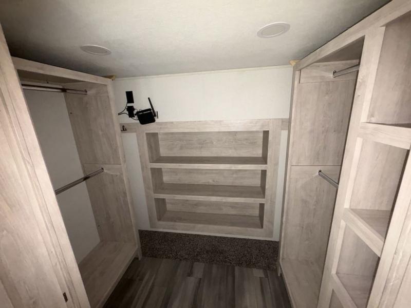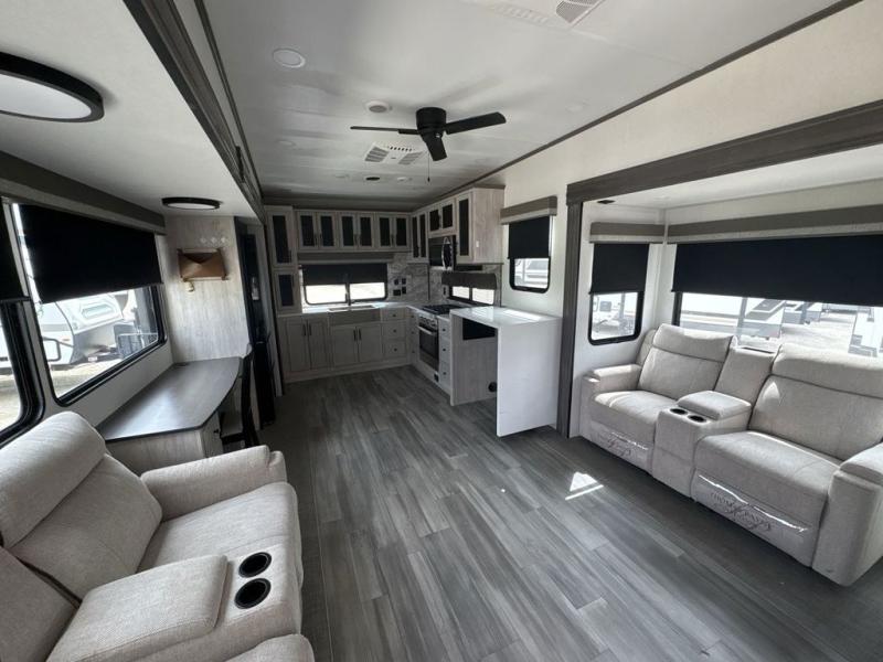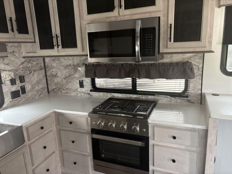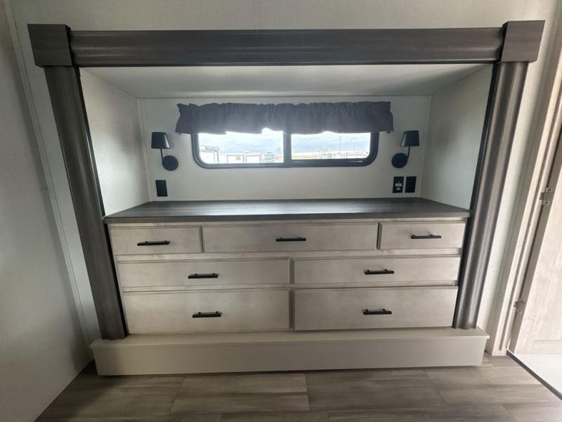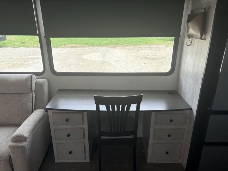 If you're looking to go full-time RVing, this fifth wheel is packed with convenient features! The master bedroom includes a king bed slide out with USB ports on either side of the bed so you both can charge your phones, and there is a dresser for your folded clothes. You will love the front bathroom with dual bath sinks, a shower with a seat, plus a walk-in closet with shelves, rods to hand clothes, and baskets for laundry! There is a unique middle utility room with washer and dryer prep and a rod to hang clothes that will make a perfect laundry room, or you can utilize this space for storage! Head to the main living area to relax on the theater seating or hide-a-bed sofa, and if you have guests stay over, they can sleep here. There is also an entertainment center with a 50" flat screen TV, but you might just leave that off if you're working at the desk with a chair that is provided. We've saved the best part for last; the kitchen! Here, you'll find ample counter space to prep home-cooked meals, a three burner high output range with a 22" oven, plus a large counter with barstools where you can enjoy breakfast at each morning. Choosing this fifth wheel is a no-brainer!