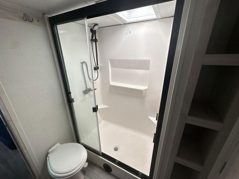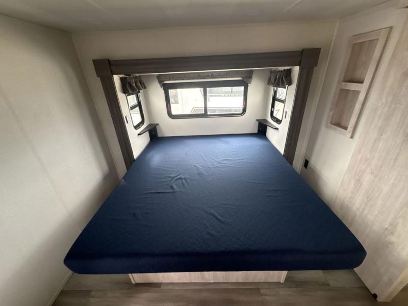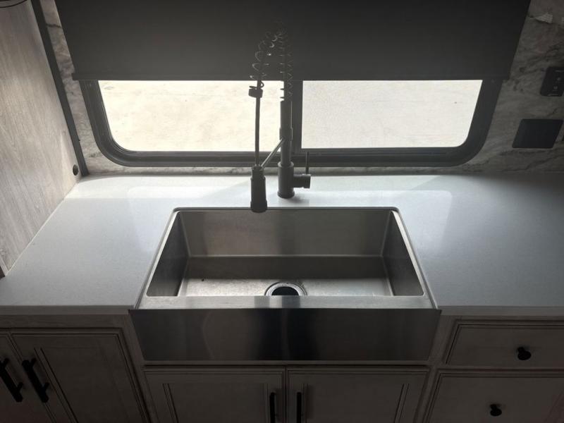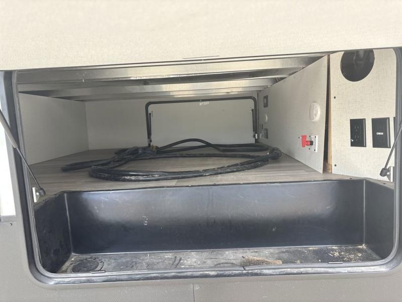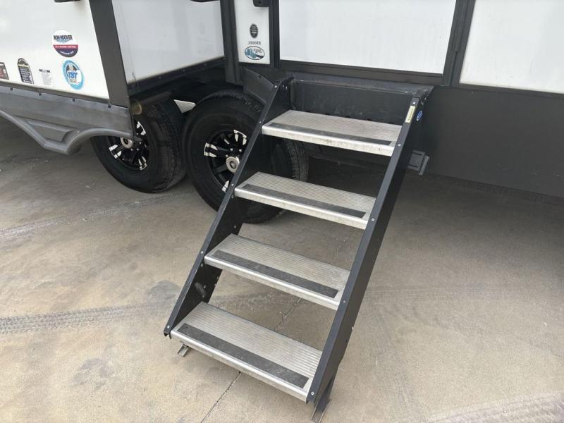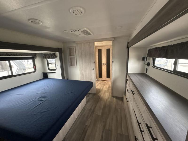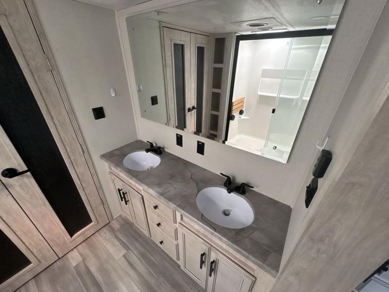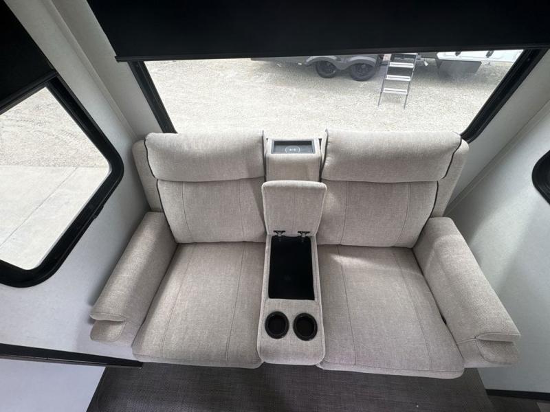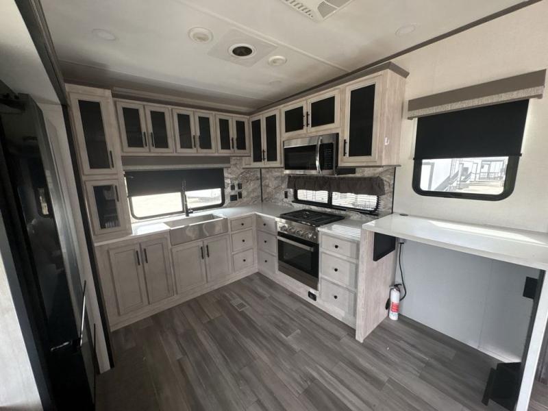 If you're looking to go full-time RVing, this fifth wheel is packed with convenient features! The master bedroom includes a king bed slide out with USB ports on either side of the bed so you both can charge your phones, and there is a dresser for your folded clothes. You will love the front bathroom with dual bath sinks, a shower with a seat, plus a walk-in closet with shelves, rods to hand clothes, and baskets for laundry! There is a unique middle utility room with washer and dryer prep and a rod to hang clothes that will make a perfect laundry room, or you can utilize this space for storage! Head to the main living area to relax on the theater seating or hide-a-bed sofa, and if you have guests stay over, they can sleep here. There is also an entertainment center with a 50" flat screen TV, but you might just leave that off if you're working at the desk with a chair that is provided. We've saved the best part for last; the kitchen! Here, you'll find ample counter space to prep home-cooked meals, a three burner high output range with a 22" oven, plus a large counter with barstools where you can enjoy breakfast at each morning. Choosing this fifth wheel is a no-brainer!