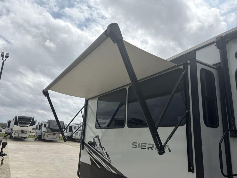 Each one of these Forest River Sierra fifth wheels are equipped with everything you need to make the most of each adventure! The underbelly armor will protect your unit's vitals from road debris and the painted two tone aerodynamic fiberglass front cap has an improved turning radius to make them easier to navigate. With an electric leveling system, you can set your unit up quick and easy then get to having fun faster than ever. The welded aluminum framed, vacuum bonded laminated superstructure will hold up through every adventure and the cambered powder coated frame comes with rust prohibitor to last longer. Each model also includes the Summit Package that comes with a king Wi-Fi extender system and Olympus antenna, a full coach water filter system, Goodyear tires with 7,000 lb. axles, and the list goes on. The interior is just as impressive with rustic wood plank linoleum, recessed residential lighting, a memory foam mattress, and mocha accent crown molding over the kitchen cabinets!