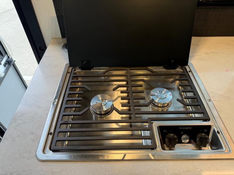 Well-Equipped Kitchen: Includes a cooktop, microwave, refrigerator, and generous counter space for meal prep on the road