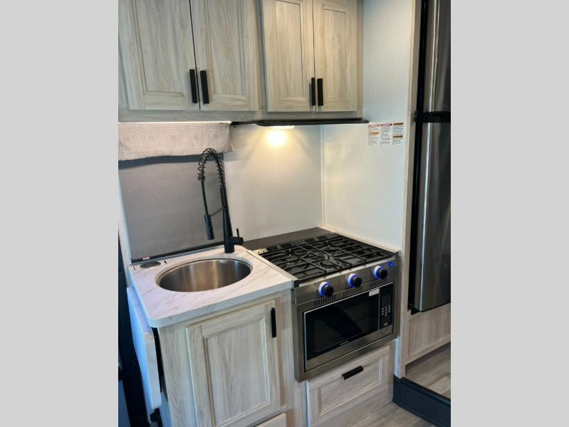 Take your family on great adventures in this Sunseeker LE Class C gas motorhome! This coach has a full kitchen equipped with a flip-up countertop, 1.3-cubic foot convection microwave, recessed three-burner range, soft-touch self-closing drawer guides, and a 10.7-cubic foot 12V refrigerator. Across from the kitchen is a U-shaped dinette that also has four seatbelts for traveling, and there are two large storage drawers in the dinette. The bathroom has an electric roof fan, an oxygen-infused shower head with flexible extension, and a shower skylight for more natural light in the morning. There is also a 12V LED TV for entertainment at night out in the main living area.