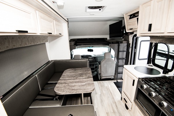 Take your family on great adventures in this Sunseeker LE Class C gas motorhome! This coach has a full kitchen equipped with a flip-up countertop, 1.3-cubic foot convection microwave, recessed three-burner range, soft-touch self-closing drawer guides, and a 10.7-cubic foot 12V refrigerator. Across from the kitchen is a U-shaped dinette that also has four seatbelts for traveling, and there are two large storage drawers in the dinette. The bathroom has an electric roof fan, an oxygen-infused shower head with flexible extension, and a shower skylight for more natural light in the morning. There is also a 12V LED TV for entertainment at night out in the main living area.