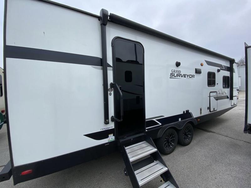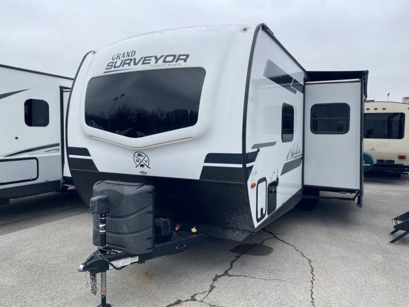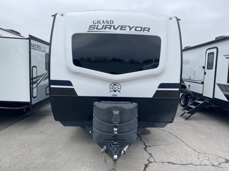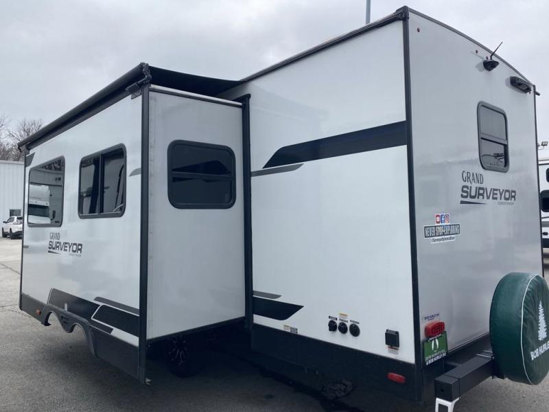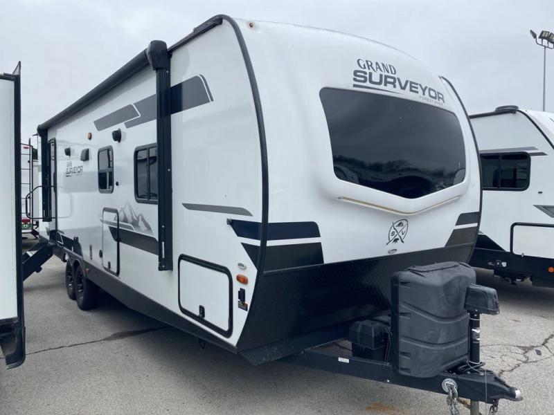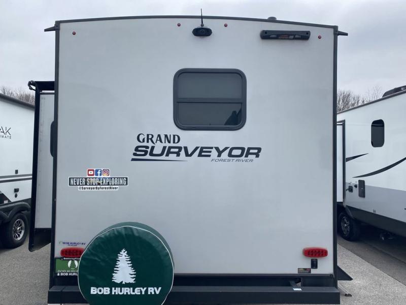 With any Grand Surveyor travel trailer by Forest River you will enjoy turn-key ready-to-go features and quality construction! Each model includes Azdel composite walls and a gel coated fiberglass front cap with an automotive style tinted windshield for a sleek look. There are friction hinge black glass entry door(s), an adjustable platform step with a night light, plus Goodyear tires and a power tongue jack for easy towing. The interior will have you feeling right at home with roller shades, residential faucets, sinks, and bathroom vanity, plus Surf(x) seamless countertops throughout. You can also plan for adventure with a 2" rear accessory and exterior spray port, and there are slam latch baggage doors throughout to keep all your gear secure. Other stand-out features include a central vacuum system, a 200 watt solar panel with a 30 amp controller, a tankless water heater, carpet-free interiors, and the list goes on!