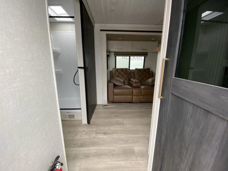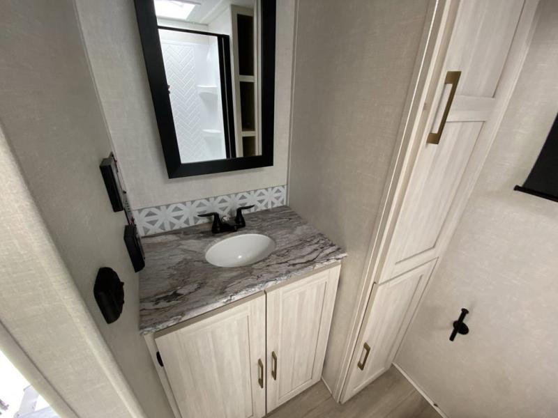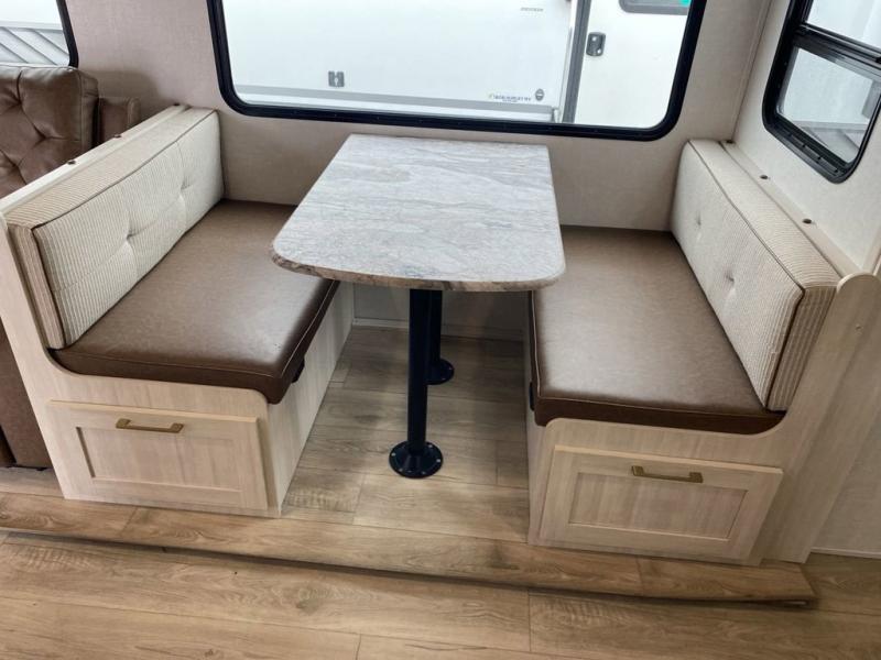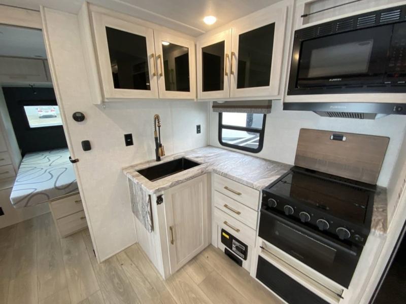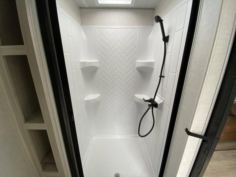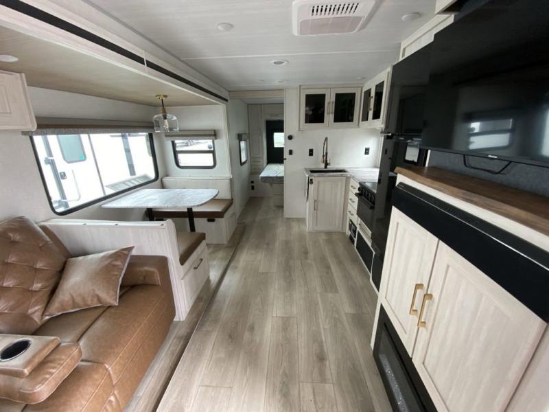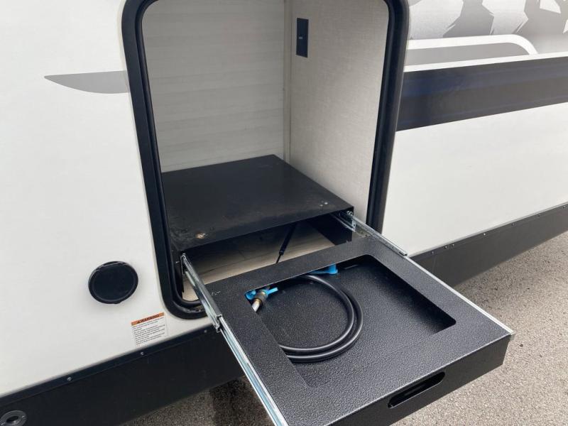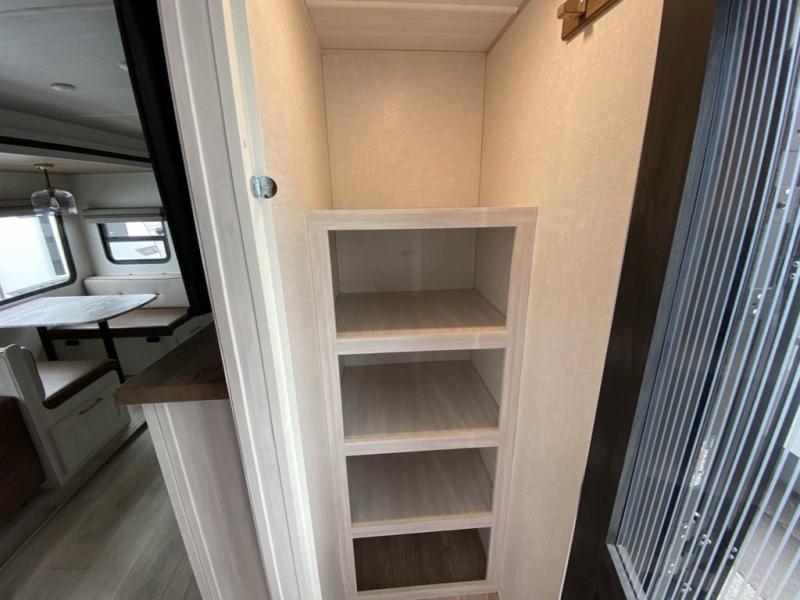 No need to rough it when you camp; this trailer offers amenities that allow you to "Glamp" if you want! The rear spacious bathroom is tucked away behind a beautiful barn door, and inside features a 30" x 36" shower, wardrobe, and linen storage. The front master bedroom offers privacy, a walk-around custom king bed, dual wardrobes and underbed storage, plus TV prep if you want the option to watch movies in bed. The L-shaped counter in the kitchen provides enough space to have everything at your fingertips while you cook, plus there is a countertop extension for more prep and serving space if needed. A nice walk-in pantry just inside the entry door will be perfect for chips and snacks or canned goods for those longer camping trips. If dining inside, the booth dinette with pull-out dinette drawers will be comfortable plus you will enjoy the view provided by the panoramic windows within the slide out. An outside kitchen will be a favorite for anyone that cooks, and the 19' awning will provide some protection from the elements and offering an outdoor living area to enjoy with everyone.