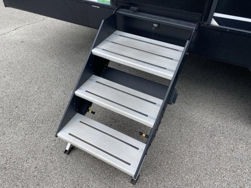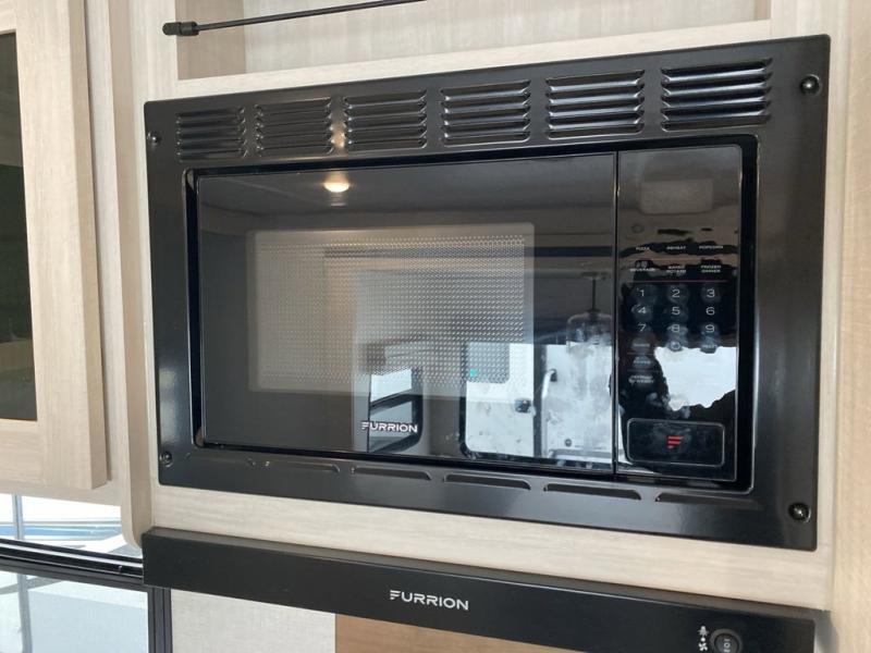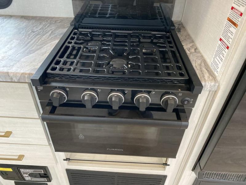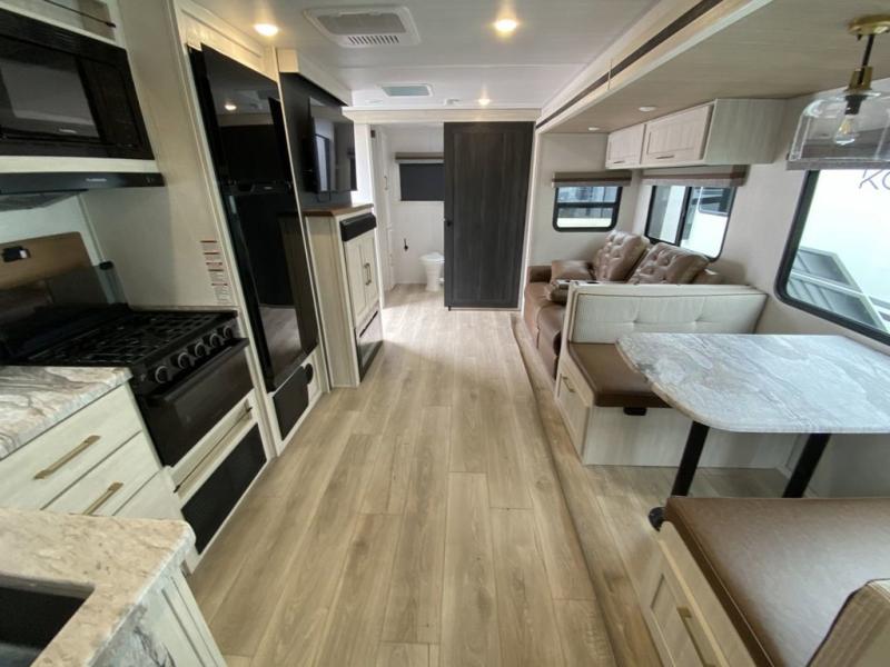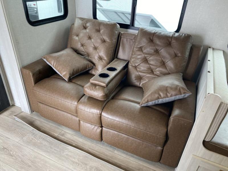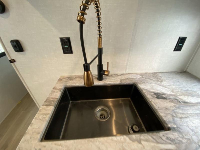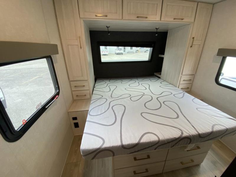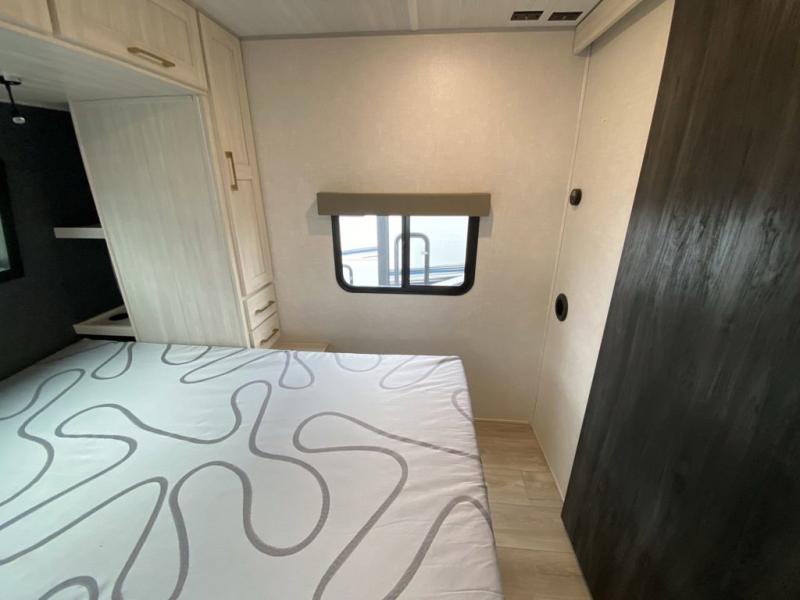 No need to rough it when you camp; this trailer offers amenities that allow you to "Glamp" if you want! The rear spacious bathroom is tucked away behind a beautiful barn door, and inside features a 30" x 36" shower, wardrobe, and linen storage. The front master bedroom offers privacy, a walk-around custom king bed, dual wardrobes and underbed storage, plus TV prep if you want the option to watch movies in bed. The L-shaped counter in the kitchen provides enough space to have everything at your fingertips while you cook, plus there is a countertop extension for more prep and serving space if needed. A nice walk-in pantry just inside the entry door will be perfect for chips and snacks or canned goods for those longer camping trips. If dining inside, the booth dinette with pull-out dinette drawers will be comfortable plus you will enjoy the view provided by the panoramic windows within the slide out. An outside kitchen will be a favorite for anyone that cooks, and the 19' awning will provide some protection from the elements and offering an outdoor living area to enjoy with everyone.