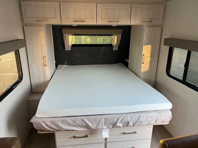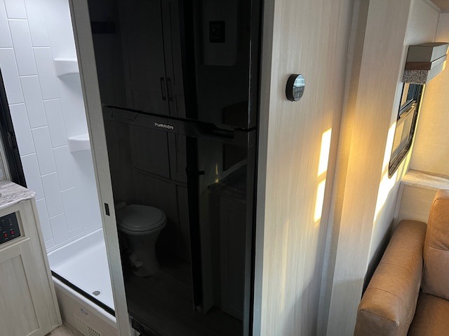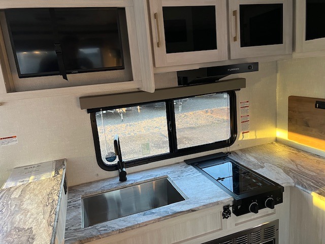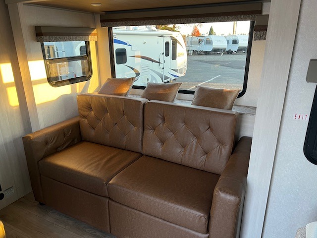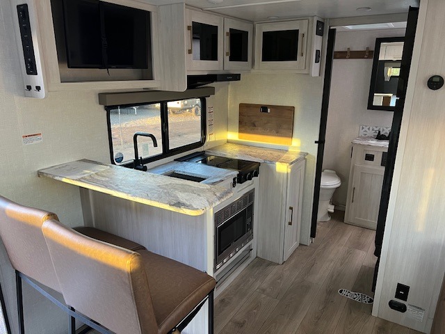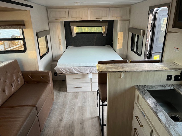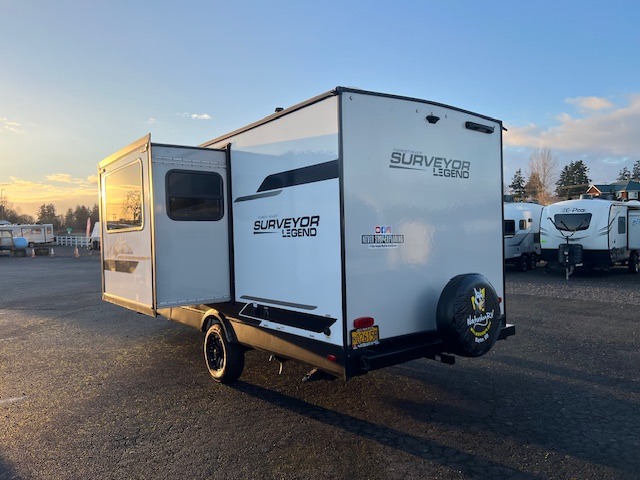 Hit the road with this Surveyor Legend trailer in tow, featuring a tri-fold sofa slide for added seating, sleeping, and interior space. You will also love the breakfast bar with two stools for dining. The queen bed up front will provide a great night's rest, and there is overhead storage at the head of the bed along with dual wardrobes for your things on either side. If you have an overnight guest or two little ones, they can sleep on the tri-fold sofa slide, and everyone will appreciate the privacy of the full rear bath. You will have everything needed each day to prepare meals, including a two burner cooktop, a convection microwave, and refrigerator for your perishables. The pass-through storage will be be perfect for fishing poles, outdoor chairs, yard games, plus there is additional outdoor storage along the rear curbside for your hiking gear!