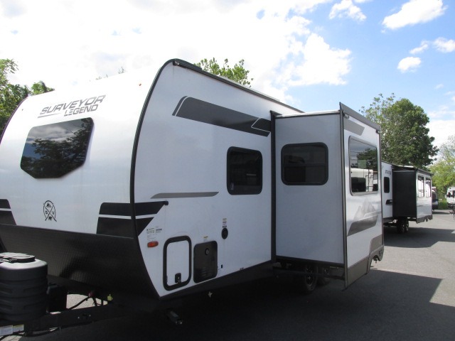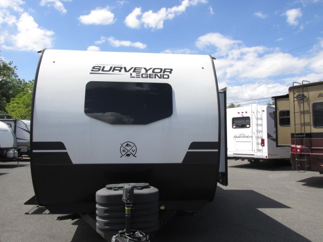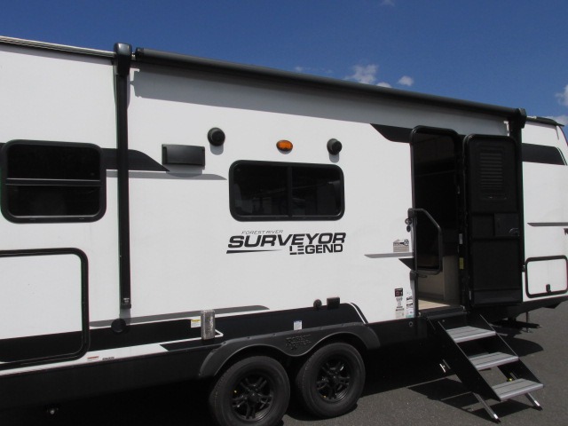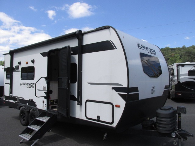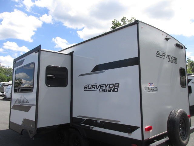 With any Surveyor Legend travel trailer by Forest River you will enjoy quality craftsmanship, convenient amenities, and at-home comforts. The Azdel composite walls provide a longer-lasting trailer, and the power tongue jack with a hitch light will get you back on the road in no-time. There are also Goodyear tires and a tire pressure monitoring system for hassle-free towing. Each model includes the Surveyor Legend Package that comes standard with oversized dinette storage access doors, front slam latch baggage doors, plus an automotive style tinted front windshield. You'll appreciate camping with a tankless water heater for endless hot showers, a 2" accessory hitch to bring bikes along, plus carpet-free interiors and a central vacuum system for easy clean up.