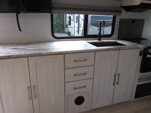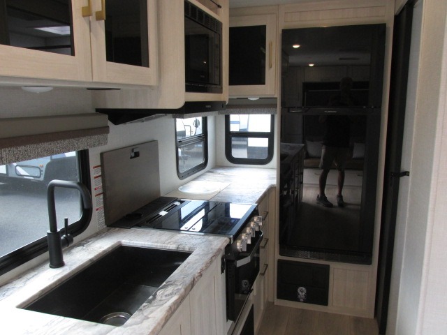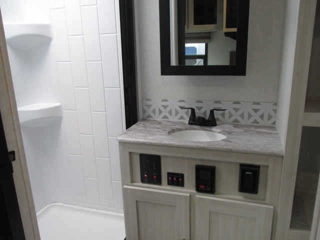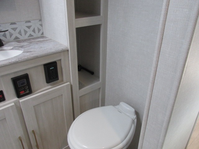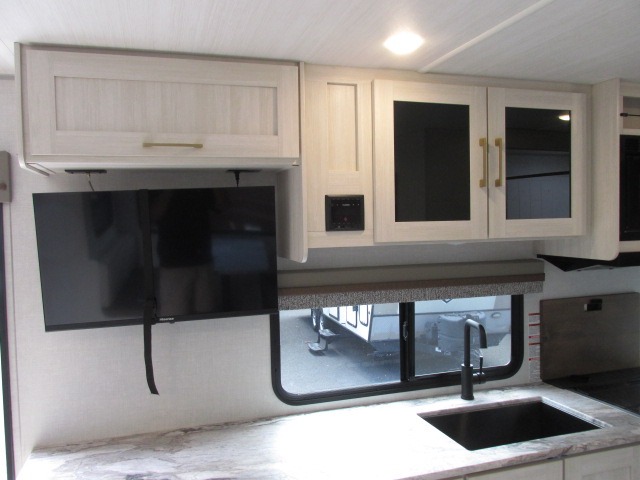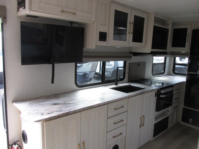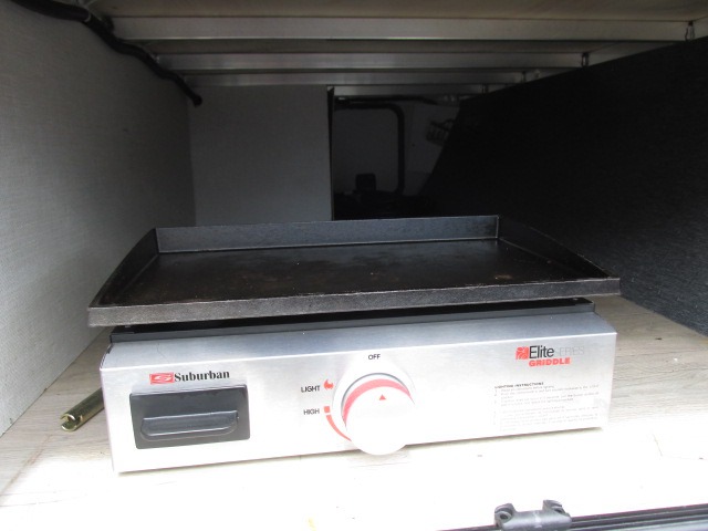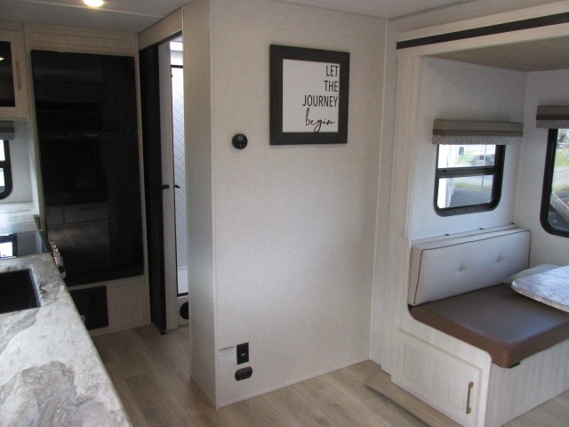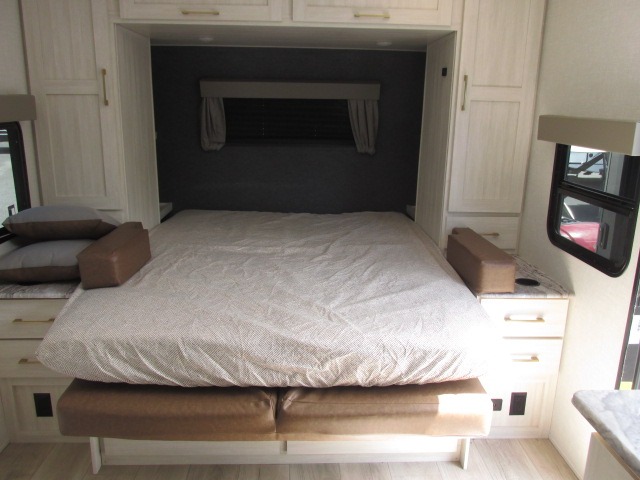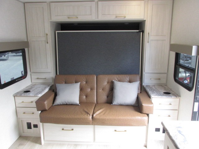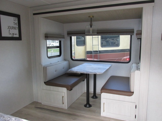 Head to your local state park for fun weekends in this cute couple's trailer. You can convert the sofa to a queen-size Murphy bed each night, and if you have guests they can sleep on the booth dinette. The chef of your group will have their choice to cook indoors on the three burner cooktop, or outdoors on the gas griddle. There is also an outdoor kitchen with a sink, a refrigerator, and a shelf to store spices. Each day you can clean up in the full bath with an upgraded slow-close shower door and a linen closet for clean towels. This model even includes decorative wall art to make you feel right at home.