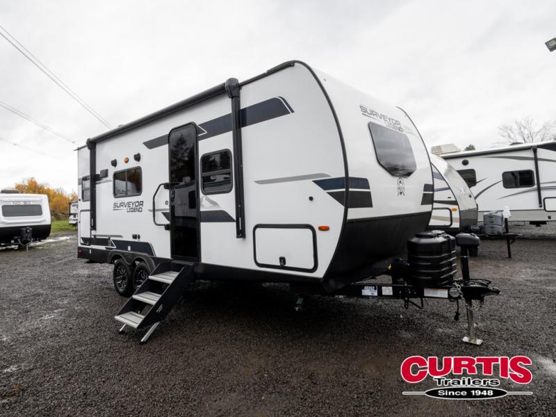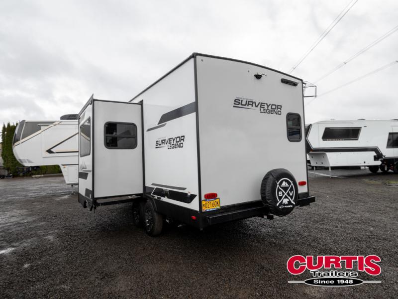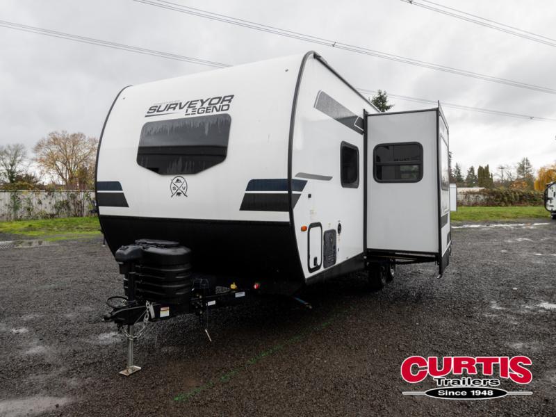 With any Surveyor Legend travel trailer by Forest River you will enjoy quality craftsmanship, convenient amenities, and at-home comforts. The Azdel composite walls provide a longer-lasting trailer, and the power tongue jack with a hitch light will get you back on the road in no-time. There are also Goodyear tires and a tire pressure monitoring system for hassle-free towing. Each model includes the Surveyor Legend Package that comes standard with oversized dinette storage access doors, front slam latch baggage doors, plus an automotive style tinted front windshield. You'll appreciate camping with a tankless water heater for endless hot showers, a 2" accessory hitch to bring bikes along, plus carpet-free interiors and a central vacuum system for easy clean up.
