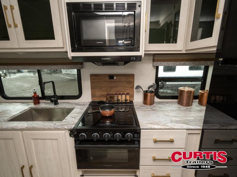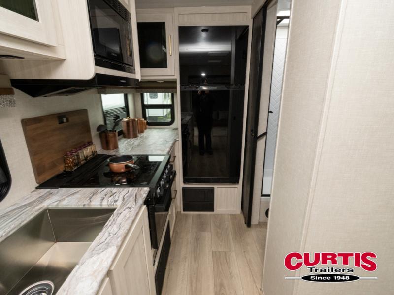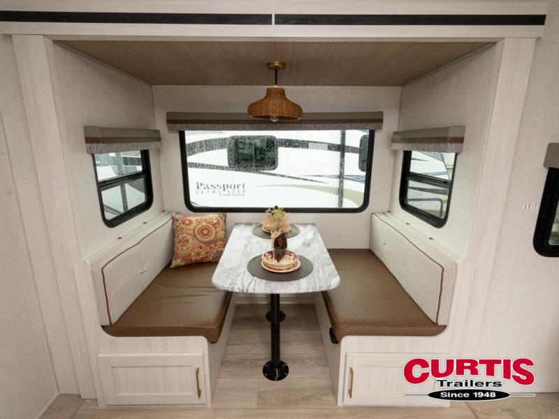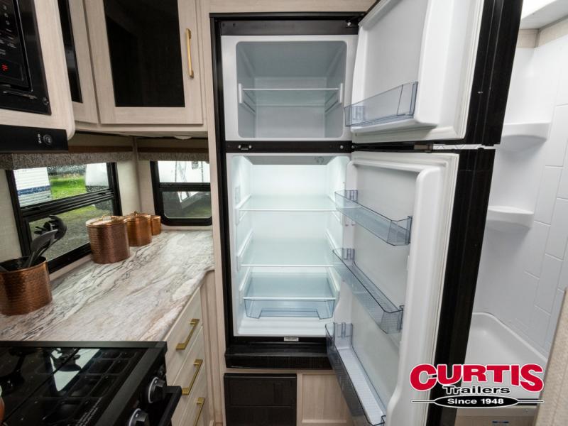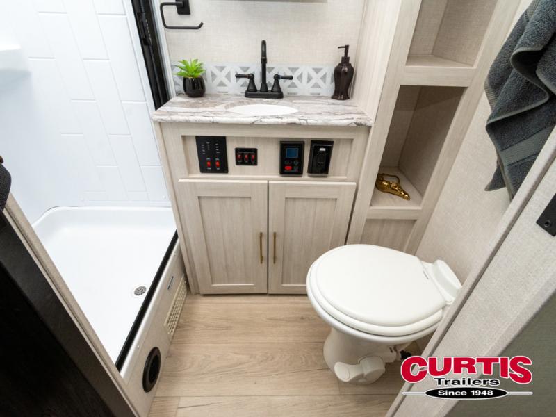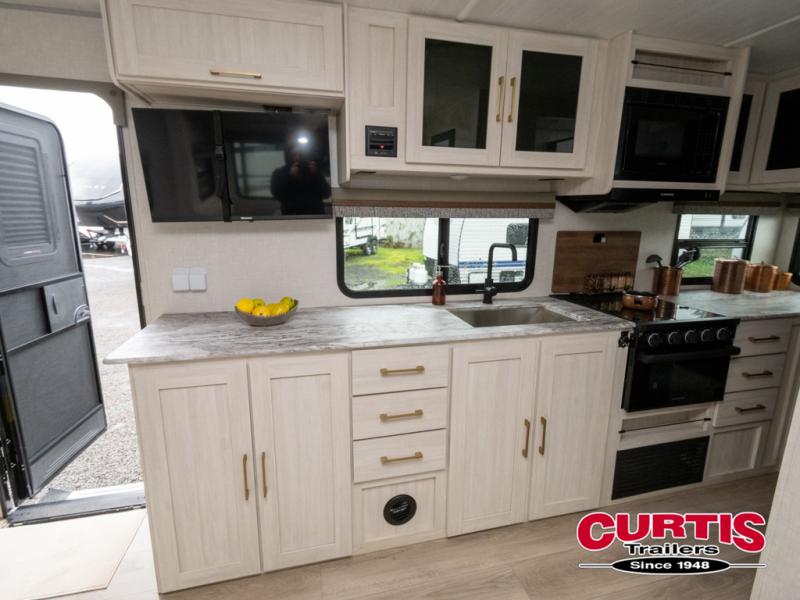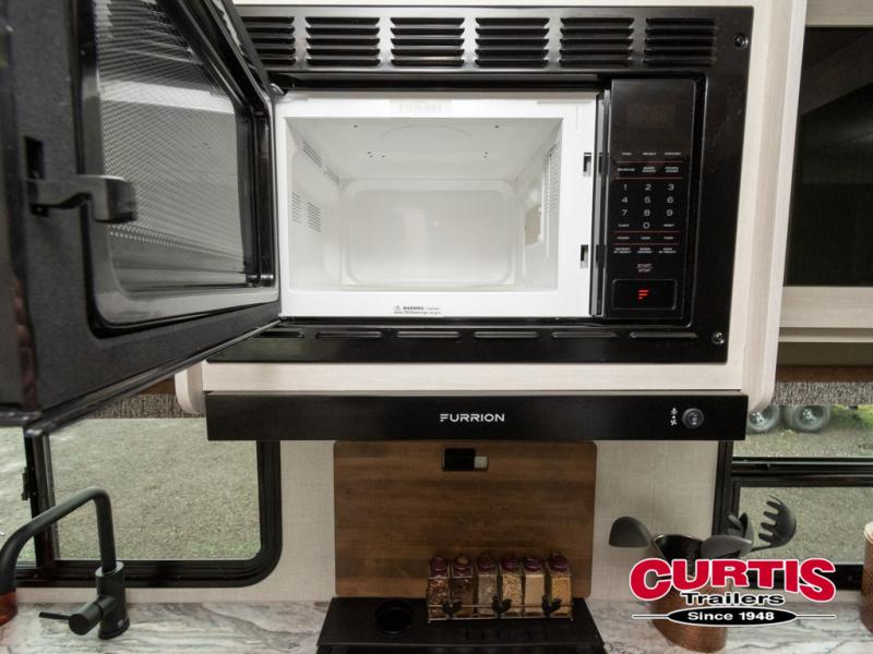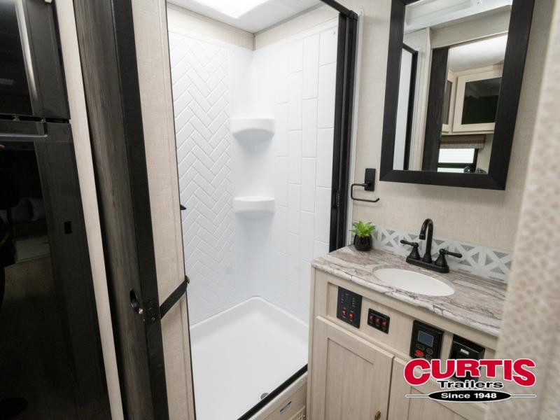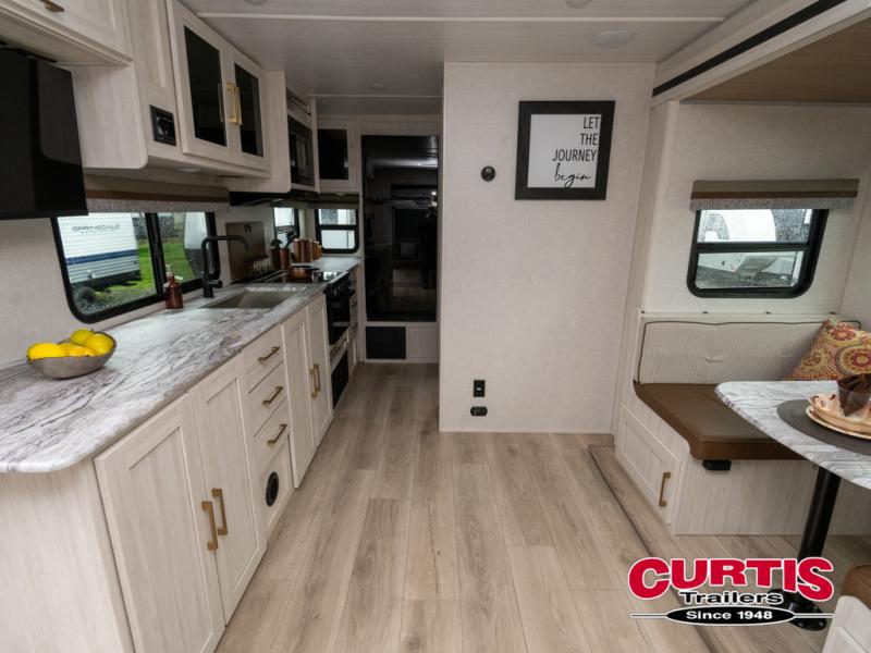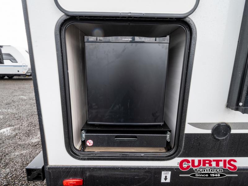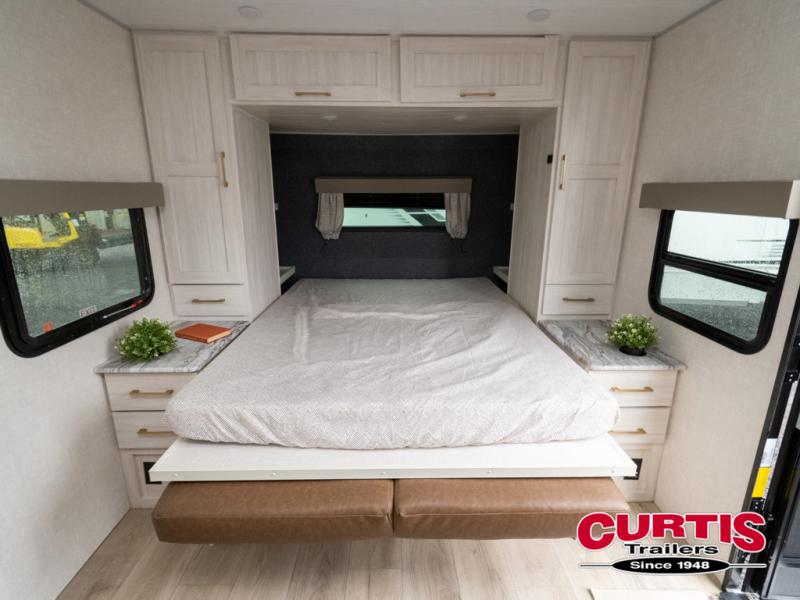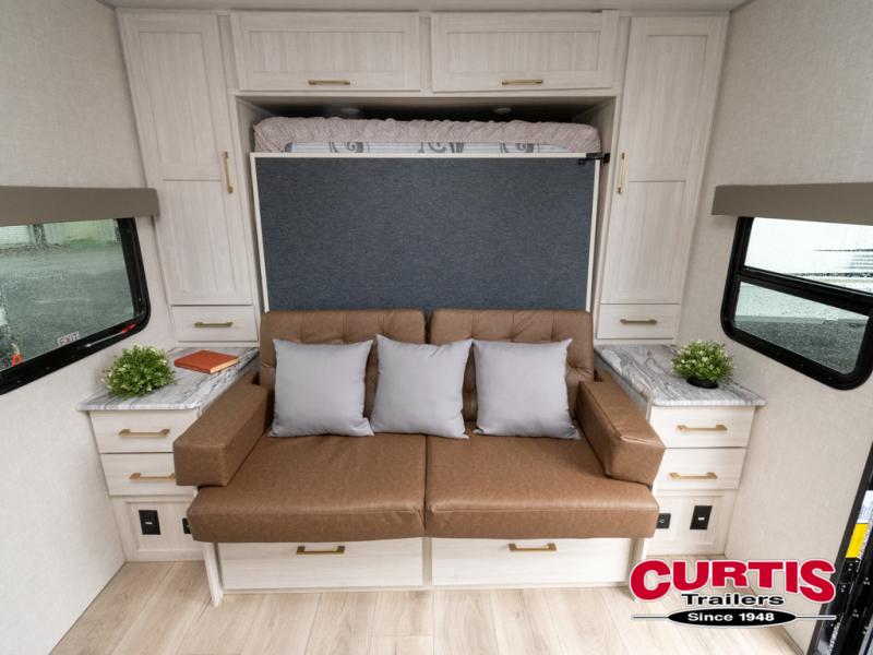Head to your local state park for fun weekends in this cute couple's trailer. You can convert the sofa to a queen-size Murphy bed each night, and if you have guests they can sleep on the booth dinette. The chef of your group will have their choice to cook indoors on the three burner cooktop, or outdoors on the gas griddle. There is also an outdoor kitchen with a sink, a refrigerator, and a shelf to store spices. Each day you can clean up in the full bath with an upgraded slow-close shower door and a linen closet for clean towels. This model even includes decorative wall art to make you feel right at home.