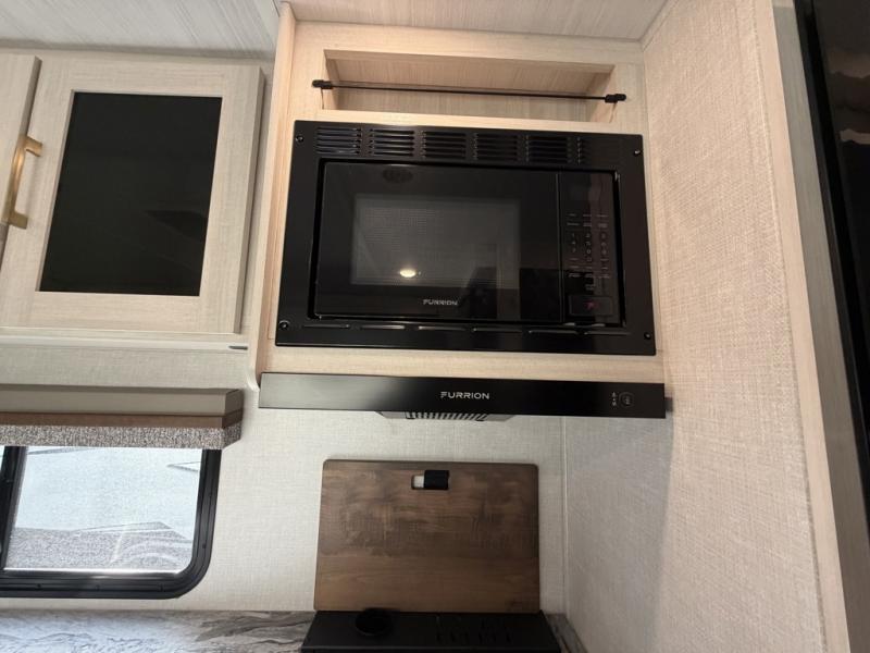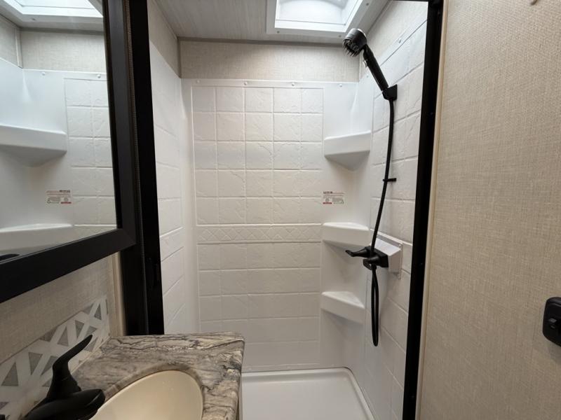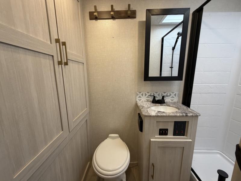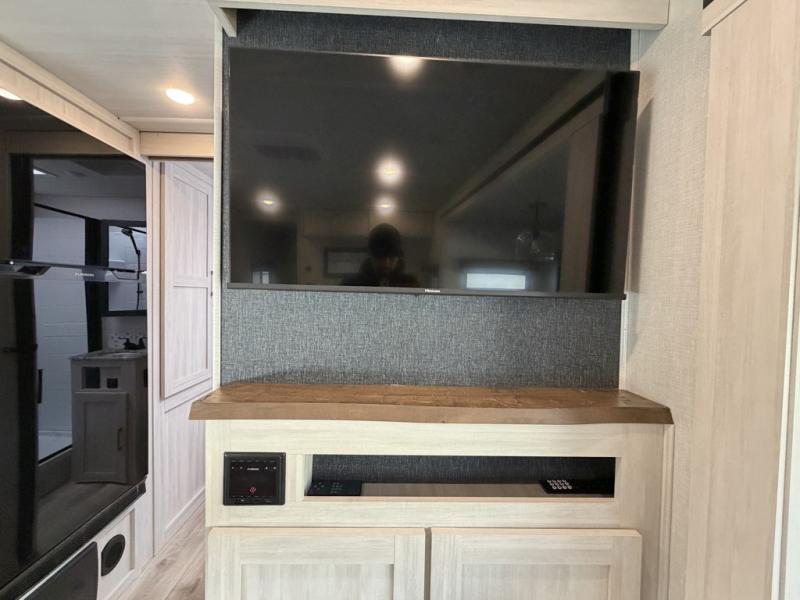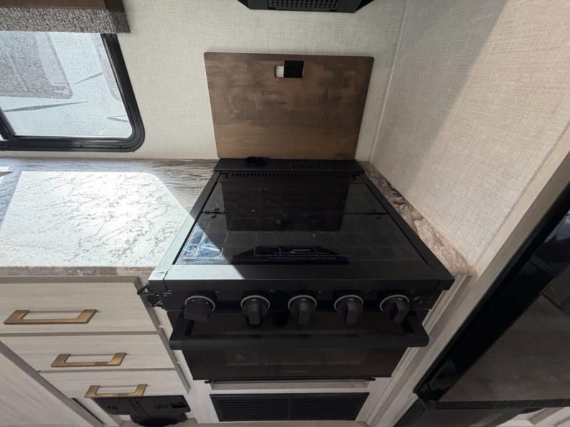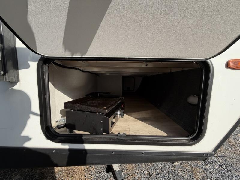 Whether you're camping with friends or family, you'll love the space and comfort found in this travel trailer. The outside kitchen is packed with features, such as a gas griddle, sink, refrigerator, and a shelf, plus there is a 21' electric awning for shade. Head inside to relax on the tri-fold sofa, or play a game at the booth dinette. You will also love the HD TV for your favorite shows at night. This model includes a full rear bath with a linen closet for clean towels and an upgraded slow-close shower door.