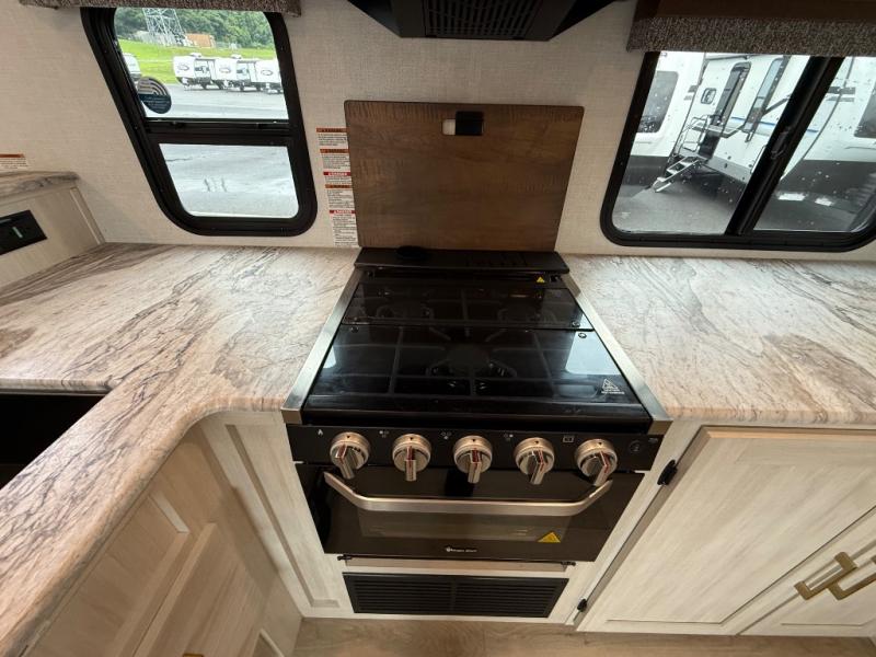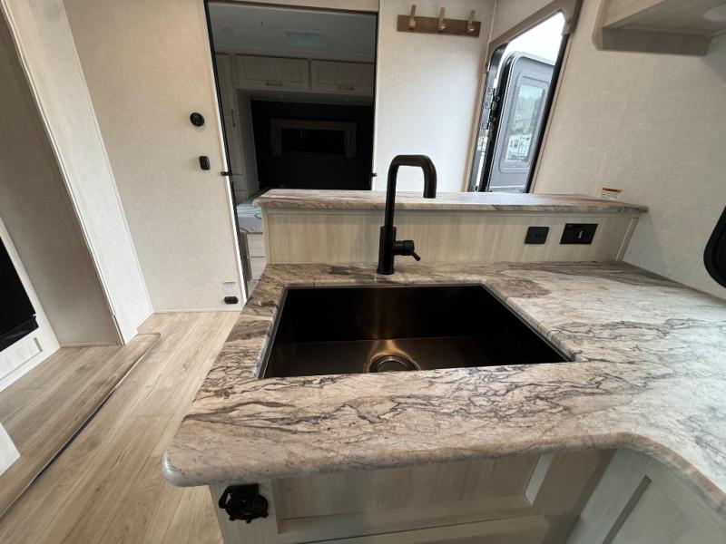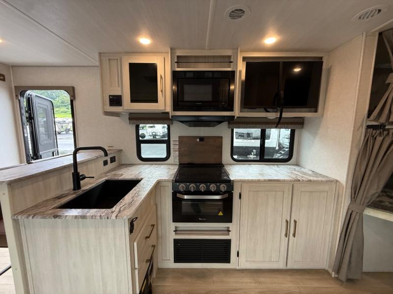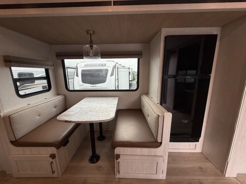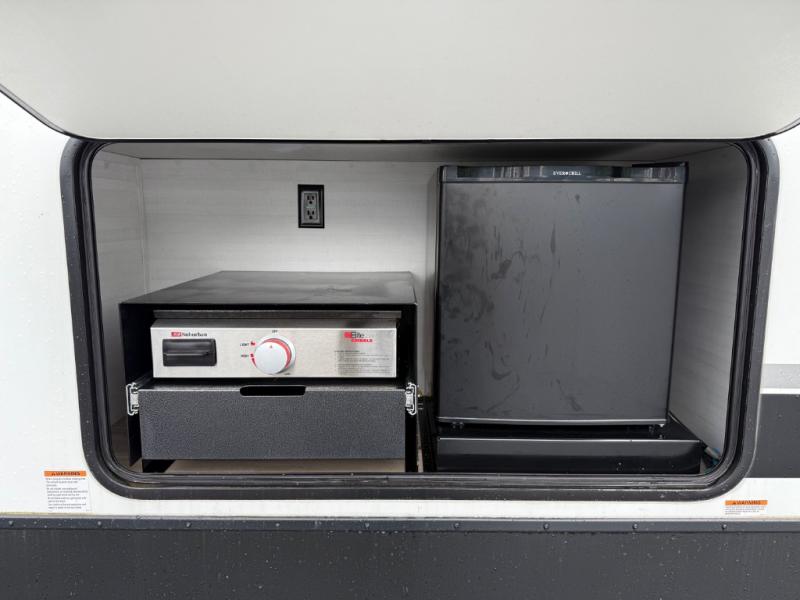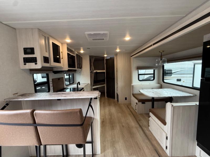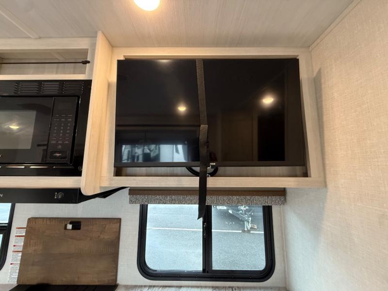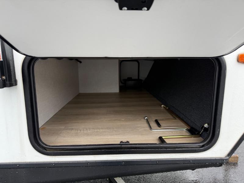 Every trip to the campground will be spent in comfort with this single slide out travel trailer. Once you arrive at the site, remove the kayaks or bikes from the rear storage door, start lunch on the outside kitchen, and put out the 15' power awning with LED lights. The interior includes a booth dinette slide with storage, a bar top with stools, plus an HD TV for movie nights. After a day of fun, head to the front private bedroom for a great night's rest on the queen bed, and you can store your belongings in the dual bedroom wardrobes!