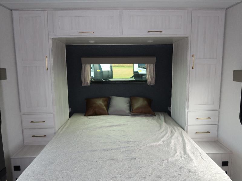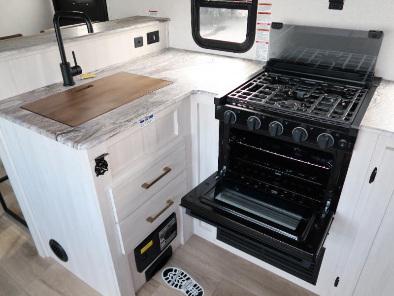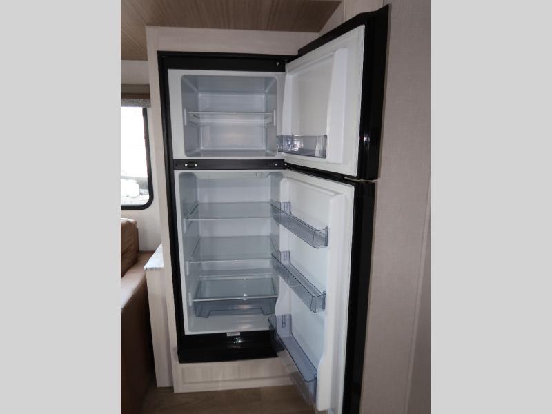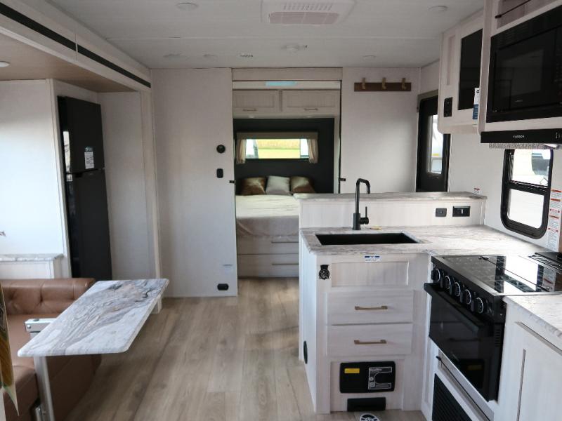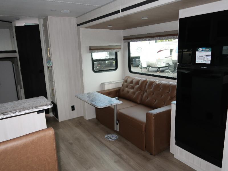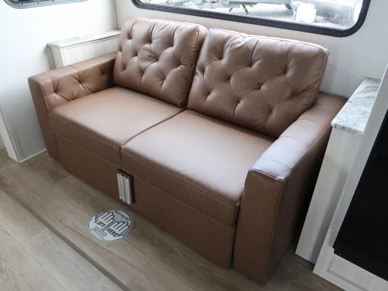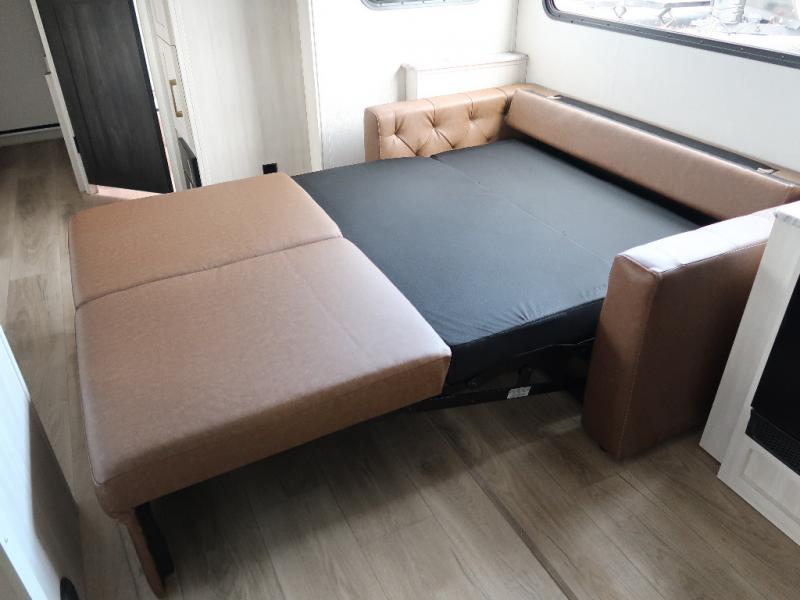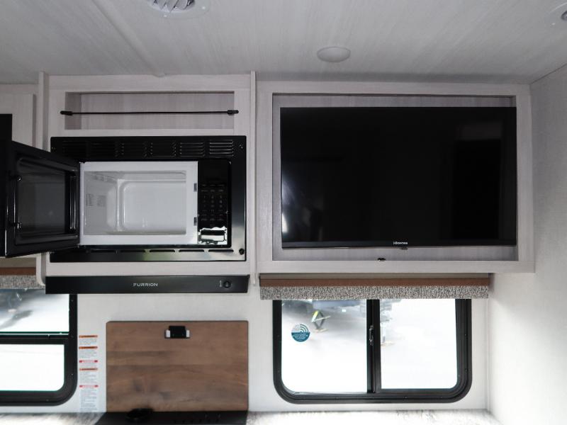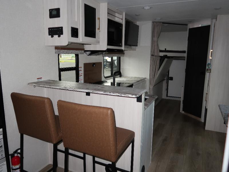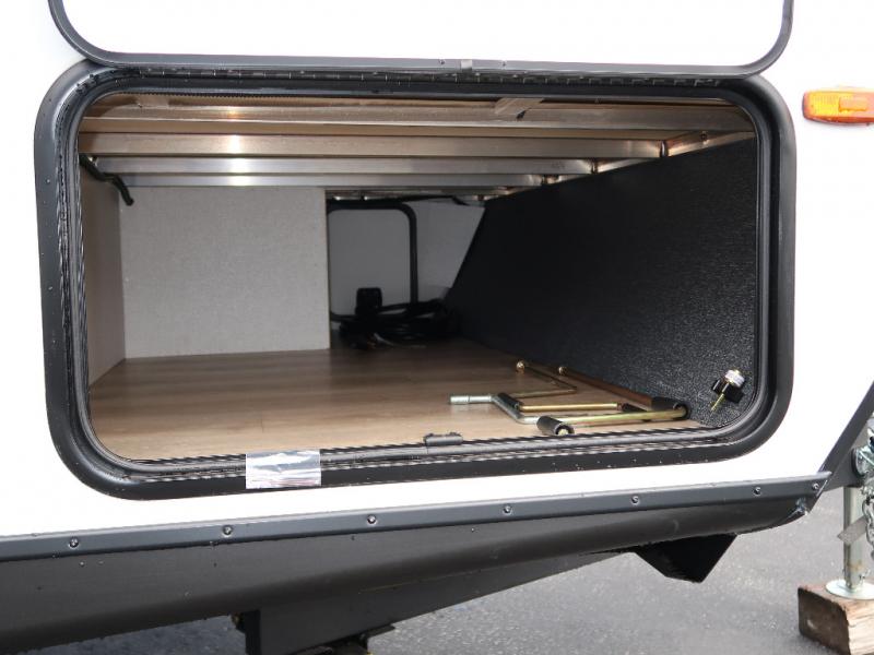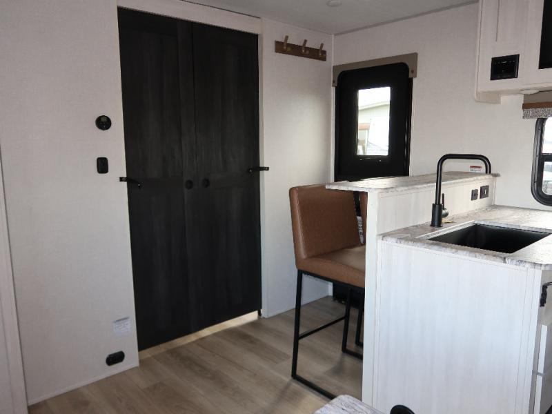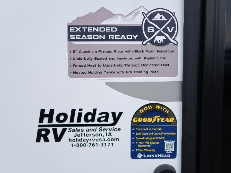 Every trip to the campground will be spent in comfort with this single slide out travel trailer. Once you arrive at the site, remove the kayaks or bikes from the rear storage door, start lunch on the outside kitchen, and put out the 15' power awning with LED lights. The interior includes a booth dinette slide with storage, a bar top with stools, plus an HD TV for movie nights. After a day of fun, head to the front private bedroom for a great night's rest on the queen bed, and you can store your belongings in the dual bedroom wardrobes!