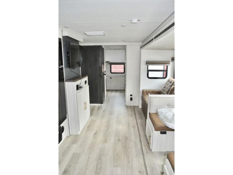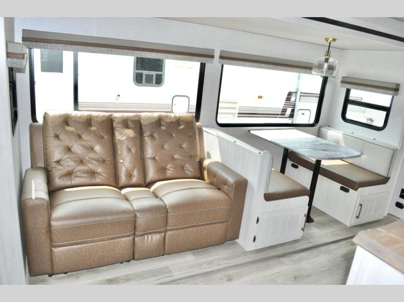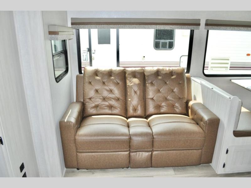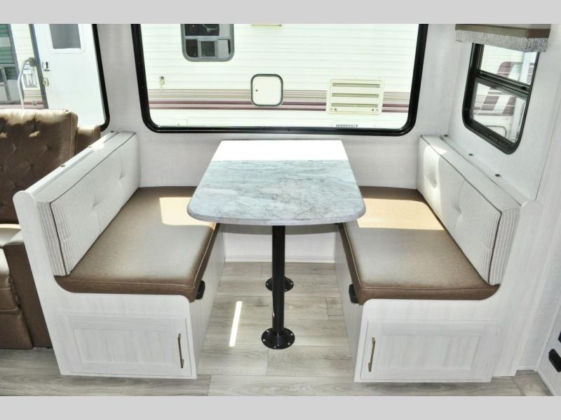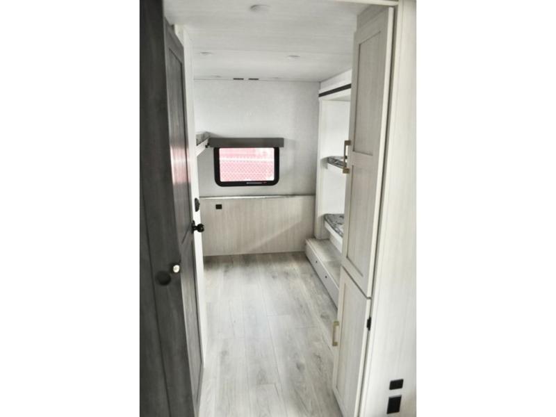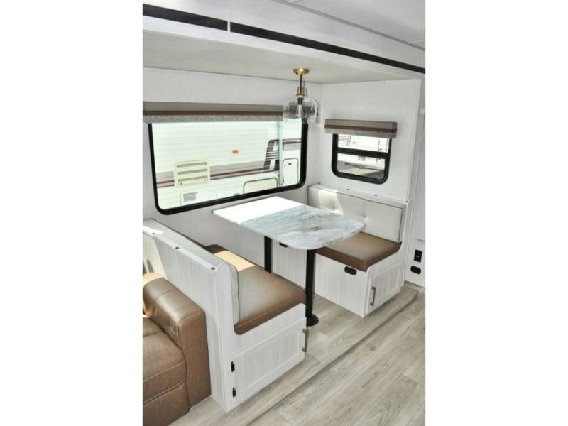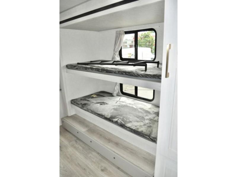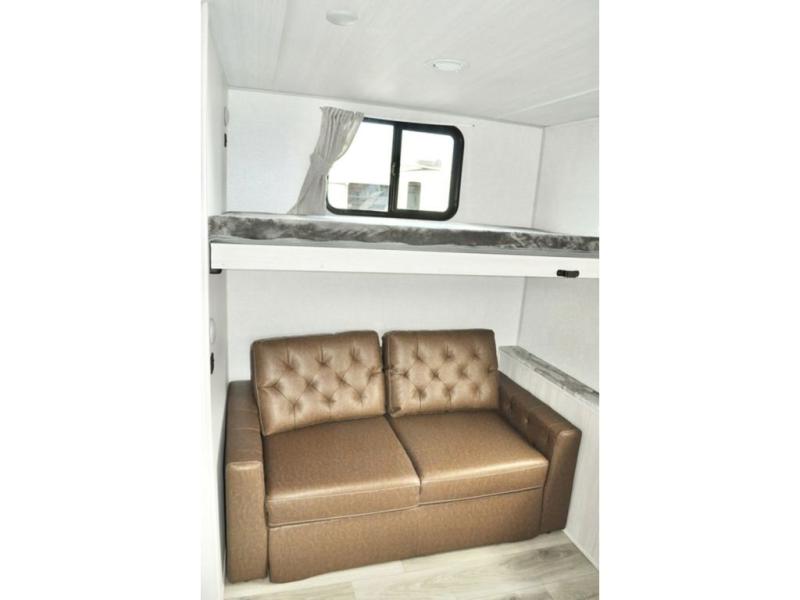 This travel trailer is perfect for larger groups or families since it can sleep up to ten people each night! There is a private bunkhouse with three bunks, a tri-fold sofa, plus storage space and a removable table! The front master bedroom is just as accommodating with its dual bedroom wardrobes, overhead cabinets, and quick access to the walk-through bath. The main living are will be a favorite hangout spot with a tri-fold sofa, a booth dinette, and an HD TV for movies. The chef of your group can cook meals in the fully-equipped kitchen, or head outdoors to cook on the outside kitchen. There is also a 21' electric awning here with LED lights for an inviting outdoor living space.