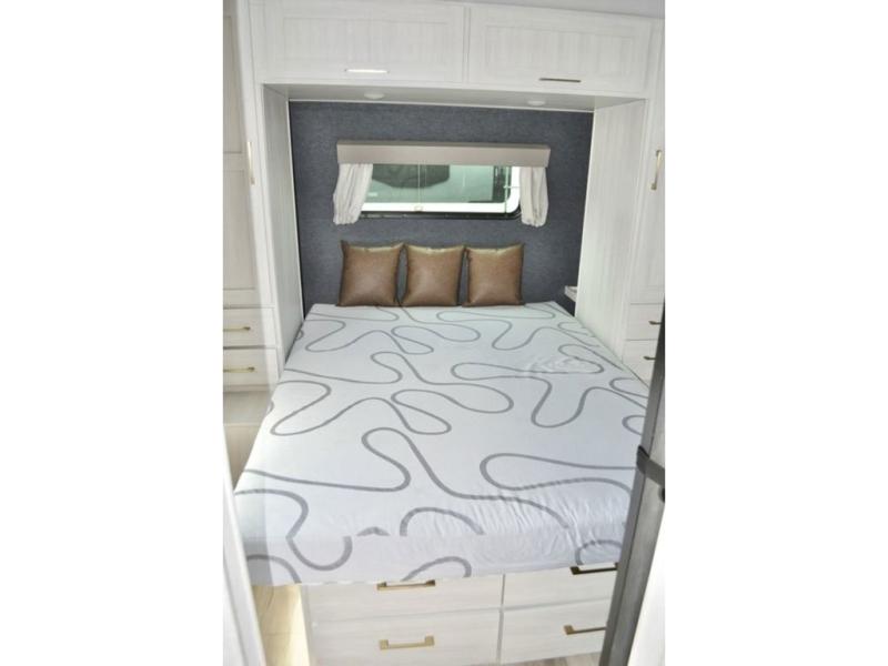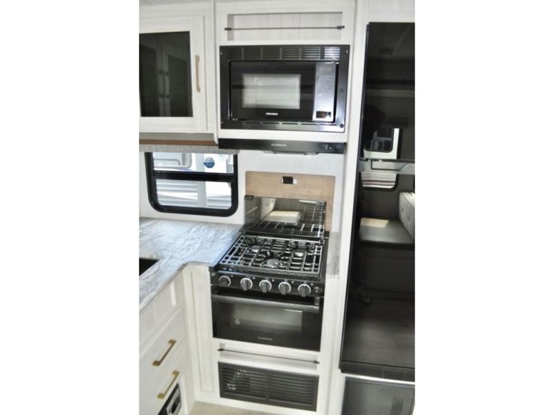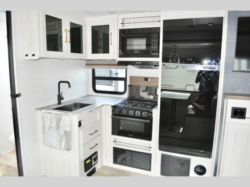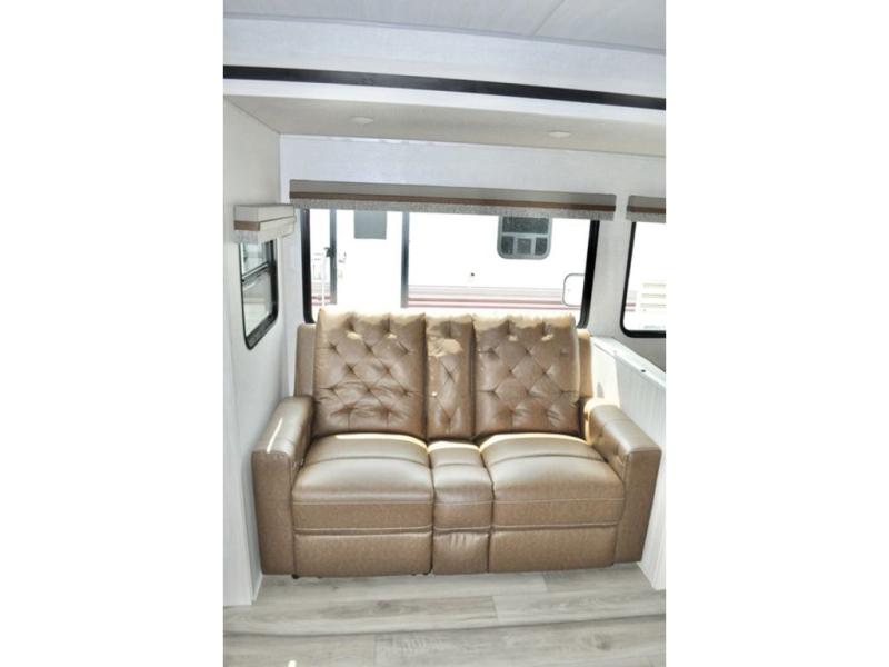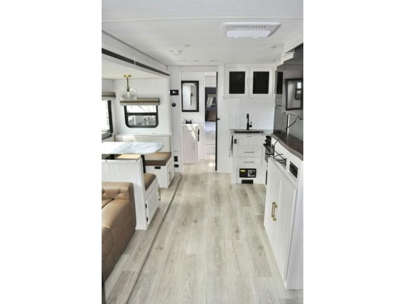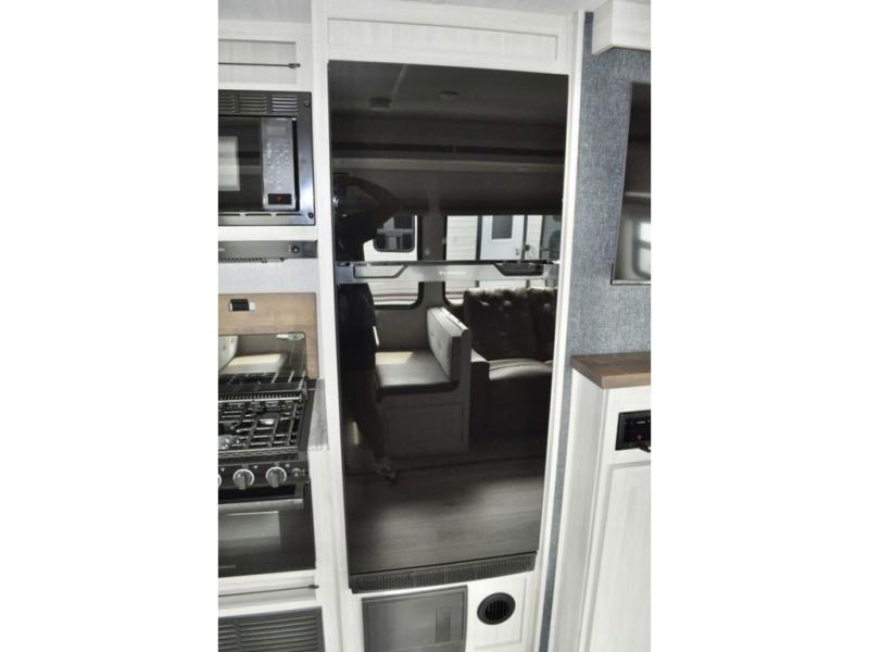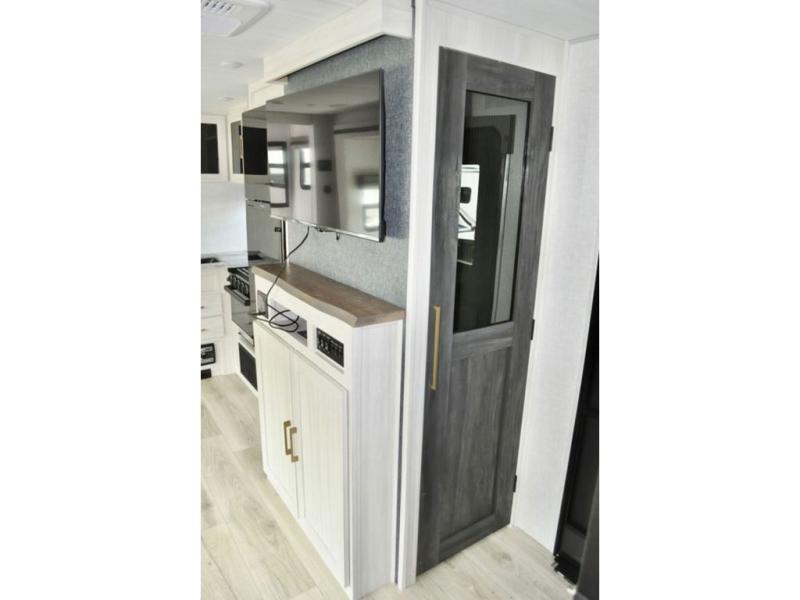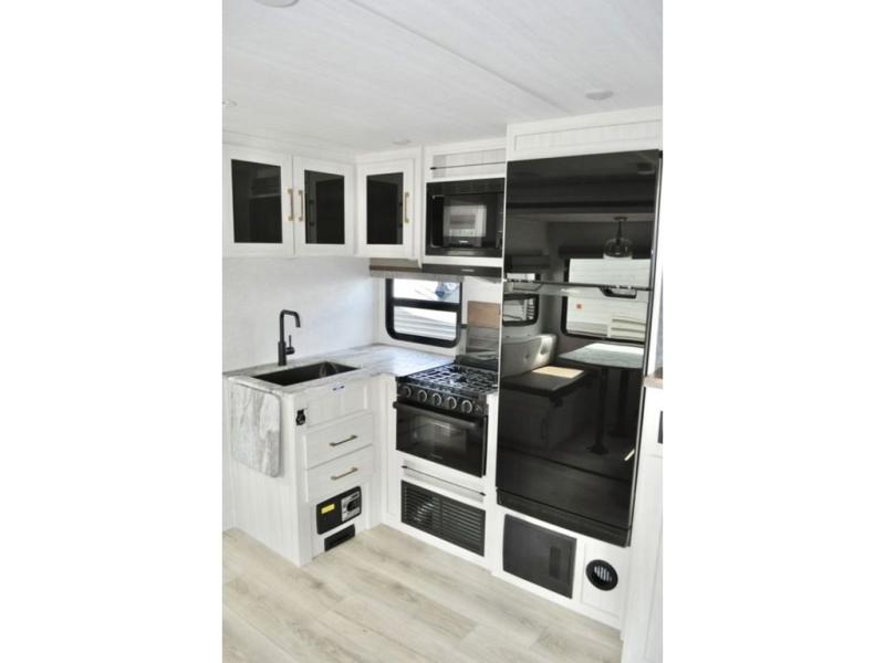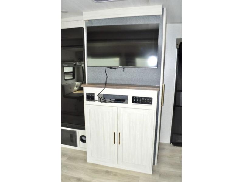 This travel trailer is perfect for larger groups or families since it can sleep up to ten people each night! There is a private bunkhouse with three bunks, a tri-fold sofa, plus storage space and a removable table! The front master bedroom is just as accommodating with its dual bedroom wardrobes, overhead cabinets, and quick access to the walk-through bath. The main living are will be a favorite hangout spot with a tri-fold sofa, a booth dinette, and an HD TV for movies. The chef of your group can cook meals in the fully-equipped kitchen, or head outdoors to cook on the outside kitchen. There is also a 21' electric awning here with LED lights for an inviting outdoor living space.